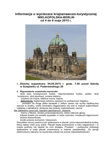 Informacja o wycieczce krajoznawczo-turystycznej WIELKOPOLSKA-BERLIN od 4 do 8 maja 2015 r. 1. Zbiórka wyjazdowa: 04.05.2015 r. godz. 7.00 przed Szkołą w Sulejówku ul. Paderewskiego 29 2. Wyposażenie uczestnika wycieczki: - dwie pary turystycznych butów, nieprzemakalna kurtka, sweter, strój turystyczny, strój sportowy, zmiana bielizny, - przybory do mycia, bielizna nocna, kapcie, - dokumenty: legitymacja szkolna, paszport (w podręcznym bagażu), prowiant na drogę (kilka kanapek z żółtym serem lub suchą wędliną-bez warzyw w środku, woda mineralna niegazowana lub soki w małych pojemnikach najlepiej z zakrętkami, słodycze bez polewy czekoladowej, owoce. Nie zabieramy coca-coli, napojów gazowanych, chipsów, kremy z filtrami, okulary przeciwsłoneczne, letnie nakrycie głowy, - foliowe torebki (na wszelki wypadek, w razie nudności, chusteczki higieniczne) - drobne kieszonkowe, - środki przeciw komarom i kleszczom. Wszystkie rzeczy powinny być spakowane w plecak, poza nieprzemakalną kurtką, którą należy mieć przy sobie. Plecaki będą przewożone w luku bagażowym i w czasie podróży nie będzie do nich dostępu. Prowiant i podręczne drobiazgi spakowane w mały plecak przewożony w kabinie pasażerskiej Za sprzęt elektroniczny zabrany na wycieczkę szkoła nie ponosi odpowiedzialności. Jeśli dziecko zażywa leki należy je spakować do osobnej torebki, podpisać, szczegółowo opisać dawkowanie i na zbiórce wyjazdowej przekazać panu Janowi Witkowskiemu. Dziecko nie może posiadać przy sobie żadnych leków. Dzieci, które mają chorobę lokomocyjną, powinny posiadać leki, które zażywają, aby złagodzić jej objawy. 3. 4. Za szkody materialne wyrządzone przez uczestnika wycieczki odpowiedzialność ponoszą rodzice. Jeśli dziecko na wycieczce będzie rażąco naruszało regulamin wycieczki, szczególnie przepisy dotyczące bezpieczeństwa i rozkładu dnia, rodzice będą zobowiązani na własny koszt odebrać dziecko przed terminem zakończenia wycieczki. 4. Informacja o noclegach dwa noclegi 4/5 i 5/6 05.2015 r. - Pensjonat Sage – Łagów, dwa noclegi 6/7 i 7/8 05.2015 r. - Pensjonat „Maria” – Przyjezierze. Spotkanie w sprawie wycieczki 29 kwietnia 2015 r. o godz.18.00 w szkole. Proszę o uregulowanie wpłat do 20.04.2015r.