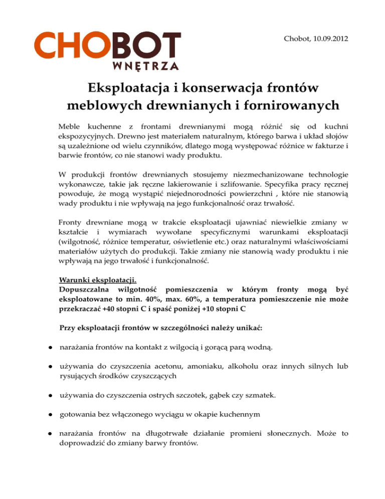 Chobot, 10.09.2012 Eksploatacja i konserwacja frontów meblowych drewnianych i fornirowanych Meble kuchenne z frontami drewnianymi mogą różnić się od kuchni ekspozycyjnych. Drewno jest materiałem naturalnym, którego barwa i układ słojów są uzależnione od wielu czynników, dlatego mogą występować różnice w fakturze i barwie frontów, co nie stanowi wady produktu. W produkcji frontów drewnianych stosujemy niezmechanizowane technologie wykonawcze, takie jak ręczne lakierowanie i szlifowanie. Specyfika pracy ręcznej powoduje, że mogą wystąpić niejednorodności powierzchni , które nie stanowią wady produktu i nie wpływają na jego funkcjonalność oraz trwałość. Fronty drewniane mogą w trakcie eksploatacji ujawniać niewielkie zmiany w kształcie i wymiarach wywołane specyficznymi warunkami eksploatacji (wilgotność, różnice temperatur, oświetlenie etc.) oraz naturalnymi właściwościami materiałów użytych do produkcji. Takie zmiany nie stanowią wady produktu i nie wpływają na jego trwałość i funkcjonalność. Warunki eksploatacji. Dopuszczalna wilgotność pomieszczenia w którym fronty mogą być eksploatowane to min. 40%, max. 60%, a temperatura pomieszczenie nie może przekraczać +40 stopni C i spaść poniżej +10 stopni C Przy eksploatacji frontów w szczególności należy unikać: narażania frontów na kontakt z wilgocią i gorącą parą wodną. używania do czyszczenia acetonu, amoniaku, alkoholu oraz innych silnych lub rysujących środków czyszczących używania do czyszczenia ostrych szczotek, gąbek czy szmatek. gotowania bez włączonego wyciągu w okapie kuchennym narażania frontów na długotrwałe działanie promieni słonecznych. Może to doprowadzić do zmiany barwy frontów. Czyszczenie należy używać miękkiej szmatki oraz specjalnych preparatów przeznaczonych do czyszczenia frontów z drewna lakierowanych. UWAGA! Uszkodzenia frontów powstałe w wyniku nie przestrzegania powyższych zaleceń będą traktowane jako powstałe z winy kupującego/użytkownika i nie będą mogły być przedmiotem reklamacji.