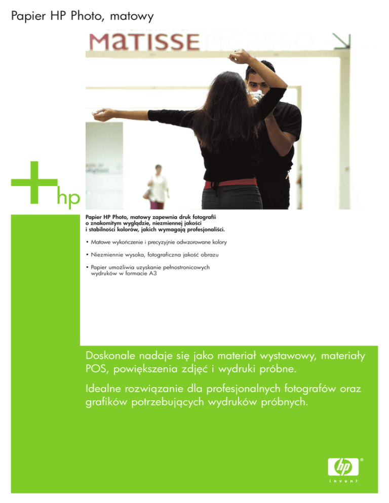 Papier HP Photo, matowy Papier HP Photo, matowy zapewnia druk fotografíi o znakomitym wygldzie, niezmiennej jakoci i stabilnoci kolorów, jakich wymagaj profesjonalici. • Matowe wykoczenie i precyzyjnie odwzorowane kolory • Niezmiennie wysoka, fotograficzna jakoć obrazu • Papier umo"liwia uzyskanie pełnostronicowych wydruków w formacie A3 Doskonale nadaje si( jako materiał wystawowy, materiały POS, powi(kszenia zdj(ć i wydruki próbne. Idealne rozwi-zanie dla profesjonalnych fotografów oraz grafików potrzebuj-cych wydruków próbnych. Papier HP Photo, matowy Pełna zgodnoć Drukarki HP Designjet HP Designjet seria 130/30 HP Designjet seria 130/30 Systemy atramentowe HP Czarny system atramentowy HP nr 84 Kolorowy system atramentowy HP nr 85 Ustawienia sterownik/programowy procesor obrazu Papier HP Photo, matowy Papier HP Photo, matowy Najnowsze profile ICC/noników mo"na znaleMć na stronach internetowych www.hp.com/go/designjet/supplies/support (nale"y klikn-ć profile ICC i wybrać model drukarki). W przypadku drukarek nie-postscriptowych nale"y si( zwrócić do zewn(trznego sprzedawcy programowego procesora obrazu. Gramatura 196 g/m2 wg metody testowej ISO 536 Gruboć 234 mikrometry wg metody testowej ISO 534 Nieprzezroczystoć 92% wg metody testowej ISO 2470 Jaskrawoć 93% wg metody testowej ISO 2469 Biel CIE 99% wg metody testowej CIE Ganz 82 Laminowanie W trakcie testowania Wyko,czenie Matowe Temperatura eksploatacji Od 15°C do 35°C Eksploatacyjna wilgotnoć wzgl.dna Od 20 do 80% Odpornoć na działanie wiatła (wewntrz: domu/biura) > 10 lat, wst(pne wyniki testowe Zgodnoć atramentów Barwnikowy Szybkoć wysychania Natychmiastowe wysychanie (w temp. 23°C, wilgotnoć wzgl(dna 50%) Okres przechowywania Rok, w fabrycznie zamkni(tym opakowaniu Temperatura przechowywania Od -40°C do 75°C Wilgotnoć wzgl.dna przechowywania Od 5 do 90% Kraj pochodzenia Kanada Numery katalogowe HP Numer produktu Wymiary roli/arkusza Kody UPC Q5492A 330 mm x 483 mm 8 29160-01526 2 Gwarancja HP gwarantuje, "e wielkoformatowe materiały drukarskie HP s- wolne od defektów i wad produkcyjnych, i s- tak zaprojektowane, by przy właciwym u"ytkowaniu nie powodować zaci(ć drukarki. Jeli z jakiegokolwiek powodu u"ytkownik jest niezadowolony z wielkoformatowego materiału drukarskiego HP, powinien skontaktować si( ze swoim sprzedawc-. © 2004 Hewlett-Packard Development Company, L.P. Specyfikacje zawarte w tym dokumencie mog- bez uprzedzenia ulec zmianie. Wszystkie gwarancje udzielane w odniesieniu do Produktów i Usług HP okrelone zostały w owiadczeniach gwarancyjnych zał-czanych do ka"dego produktu i usługi. 8aden zapis niniejszego dokumentu nie mo"e być uwa"any za dodatkow- gwarancj(. HP nie ponosi odpowiedzialnoci za bł(dy techniczne lub drukarskie w niniejszym dokumencie. Wi(cej informacji na temat wielkoformatowych materiałów drukarskich HP mo"na znaleMć na stronach internetowych www.hp.com/go/designjet/supplies i www.hp.pl/supplies. 5982-5089PLE. Marzec 2004