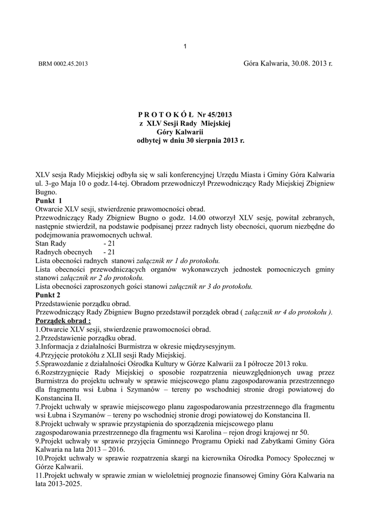 1 BRM 0002.45.2013 Góra Kalwaria, 30.08. 2013 r. P R O T O K Ó Ł Nr 45/2013 z XLV Sesji Rady Miejskiej Góry Kalwarii odbytej w dniu 30 sierpnia 2013 r. XLV sesja Rady Miejskiej odbyła się w sali konferencyjnej Urzędu Miasta i Gminy Góra Kalwaria ul. 3-go Maja 10 o godz.14-tej. Obradom przewodniczył Przewodniczący Rady Miejskiej Zbigniew Bugno. Punkt 1 Otwarcie XLV sesji, stwierdzenie prawomocności obrad. Przewodniczący Rady Zbigniew Bugno o godz. 14.00 otworzył XLV sesję, powitał zebranych, następnie stwierdził, na podstawie podpisanej przez radnych listy obecności, quorum niezbędne do podejmowania prawomocnych uchwał. Stan Rady - 21 Radnych obecnych - 21 Lista obecności radnych stanowi załącznik nr 1 do protokołu. Lista obecności przewodniczących organów wykonawczych jednostek pomocniczych gminy stanowi załącznik nr 2 do protokołu. Lista obecności zaproszonych gości stanowi załącznik nr 3 do protokołu. Punkt 2 Przedstawienie porządku obrad. Przewodniczący Rady Zbigniew Bugno przedstawił porządek obrad ( załącznik nr 4 do protokołu ). Porządek obrad : 1.Otwarcie XLV sesji, stwierdzenie prawomocności obrad. 2.Przedstawienie porządku obrad. 3.Informacja z działalności Burmistrza w okresie międzysesyjnym. 4.Przyjęcie protokółu z XLII sesji Rady Miejskiej. 5.Sprawozdanie z działalności Ośrodka Kultury w Górze Kalwarii za I półrocze 2013 roku. 6.Rozstrzygnięcie Rady Miejskiej o sposobie rozpatrzenia nieuwzględnionych uwag przez Burmistrza do projektu uchwały w sprawie miejscowego planu zagospodarowania przestrzennego dla fragmentu wsi Łubna i Szymanów – tereny po wschodniej stronie drogi powiatowej do Konstancina II. 7.Projekt uchwały w sprawie miejscowego planu zagospodarowania przestrzennego dla fragmentu wsi Łubna i Szymanów – tereny po wschodniej stronie drogi powiatowej do Konstancina II. 8.Projekt uchwały w sprawie przystąpienia do sporządzenia miejscowego planu zagospodarowania przestrzennego dla fragmentu wsi Karolina – rejon drogi krajowej nr 50. 9.Projekt uchwały w sprawie przyjęcia Gminnego Programu Opieki nad Zabytkami Gminy Góra Kalwaria na lata 2013 – 2016. 10.Projekt uchwały w sprawie rozpatrzenia skargi na kierownika Ośrodka Pomocy Społecznej w Górze Kalwarii. 11.Projekt uchwały w sprawie zmian w wieloletniej prognozie finansowej Gminy Góra Kalwaria na lata 2013-2025. 2 12.Projekt uchwały w sprawie zmian w uchwale budżetowej na 2013 rok. 13. Interpelacje i zapytania radnych. 14.Odpowiedzi na interpelacje i zapytania. 15. Zapytania mieszkańców, wolne wnioski i informacje. 16. Zamknięcie XLV sesji Rady Miejskiej. Porządek obrad został przyjęty jednogłośnie (20 za ). Punkt 3 Informacja z działalności Burmistrza w okresie międzysesyjnym. Sprawozdanie zostało dostarczone radnym oraz sołtysom e-mailem oraz w wersji papierowej przed sesją rady. Sprawozdanie z działalności burmistrza w okresie od 31 lipca do 30 sierpnia 2013 r.: 1. Wykaz podjętych zarządzeń: • Zarządzenie numer ROA.120-76/2013 Burmistrza Miasta i Gminy Góra Kalwaria z dnia 29 lipca 2013 r. w spr. zmian w budżecie gminy; • Zarządzenie numer ROA.120-77/2013 Burmistrza Miasta i Gminy Góra Kalwaria z dnia 31 lipca 2013 r. w spr. wprowadzenia zmian w Regulaminie Organizacyjnym Urzędu Miasta i Gminy Góra Kalwaria; • Zarządzenie numer ROA.120-78/2013 Burmistrza Miasta i Gminy Góra Kalwaria z dnia 31 lipca 2013 r. w spr. powołania Komisji Egzaminacyjnej do przeprowadzenia postępowania egzaminacyjnego na stopień nauczyciela mianowanego p. Zbigniewa Wietochy; • Zarządzenie numer ROA.120-79/2013 Burmistrza Miasta i Gminy Góra Kalwaria z dnia 6 sierpnia 2013 r. w spr. opracowania materiałów planistycznych do projektu budżetu Gminy Góra na 2014 rok; • Zarządzenie numer ROA.120-80/2013 Burmistrza Miasta i Gminy Góra Kalwaria z dnia 8 sierpnia 2013 r. w spr. wprowadzenia Gminnej Ewidencji Zabytków Gminy Góra Kalwaria; • Zarządzenie numer ROA.120-81/2013 Burmistrza Miasta i Gminy Góra Kalwaria z dnia 9 sierpnia 2013 r. w spr. zmian w budżecie gminy; • Zarządzenie numer ROA.120-82/2013 Burmistrza Miasta i Gminy Góra Kalwaria z dnia 13 sierpnia 2013 r. w spr. powołania rzeczoznawców do przeprowadzenia szacowania jaj wylęgowych do utylizacji w ramach zwalczania chorób zakaźnych zwierząt; • Zarządzenie numer ROA.120-83/2013 Burmistrza Miasta i Gminy Góra Kalwaria z dnia 13 sierpnia 2013 r. w spr. określenia terminu składania wniosków o udzielenie pomocy finansowej uczniom na zakup podręczników oraz szczegółowych warunków udzielania pomocy finansowej; • Zarządzenie numer ROA.120-84/2013 Burmistrza Miasta i Gminy Góra Kalwaria z dnia 13 sierpnia 2013 r. w spr. powierzenia Zakładowi Gospodarki Komunalnej Sp. z o.o. zakupu i nasadzeń 15 drzew (platan); • Zarządzenie numer ROA.120-85/2013 Burmistrza Miasta i Gminy Góra Kalwaria z dnia 16 sierpnia 2013 r. w spr. powołania Komisji odbioru końcowego robót: "Modernizacja świetlicy w Brzuminie – opracowanie dokumentacji oraz wykonanie przyłącza i instalacji gazowej do budynku świetlicy"; • Zarządzenie numer ROA.120-86/2013 Burmistrza Miasta i Gminy Góra Kalwaria z dnia 16 sierpnia 2013 r. w spr. powołania Komisji odbioru końcowego robót: "Miejsca czynnego wypoczynku dla dzieci i młodzieży w Górze Kalwarii - I etap"; • Zarządzenie numer ROA.120-87/2013 Burmistrza Miasta i Gminy Góra Kalwaria z dnia 19 sierpnia 2013 r. w spr. powołania Komisji odbioru końcowego robót: "Przebudowa dojazdu do Zamku w Czersku"; • Zarządzenie numer ROA.120-88/2013 Burmistrza Miasta i Gminy Góra Kalwaria z dnia 20 sierpnia 2013 r. w spr. ustalenia stawki bazowej czynszu za 1 m2 powierzchni użytkowej lokali mieszkalnych stanowiących zasób gminy Góra Kalwaria; • Zarządzenie numer ROA.120-89/2013 Burmistrza Miasta i Gminy Góra Kalwaria z dnia 23 3 sierpnia 2013 r. w spr. informacji o przebiegu wykonania budżetu gm