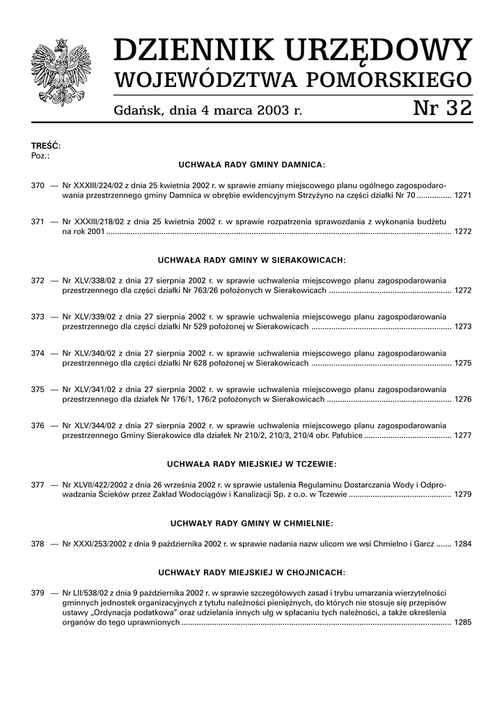 DZIENNIK URZÊDOWY WOJEWÓDZTWA POMORSKIEGO Gdañsk, dnia 4 marca 2003 r. Nr 32 TREÆ: Poz.: UCHWA£A RADY GMINY DAMNICA: 370 Nr XXXIII/224/02 z dnia 25 kwietnia 2002 r. w sprawie zmiany miejscowego planu ogólnego zagospodarowania przestrzennego gminy Damnica w obrêbie ewidencyjnym Strzy¿yno na czêci dzia³ki Nr 70 ................ 1271 371 Nr XXXIII/218/02 z dnia 25 kwietnia 2002 r. w sprawie rozpatrzenia sprawozdania z wykonania bud¿etu na rok 2001 ............................................................................................................................................................. 1272 UCHWA£A RADY GMINY W SIERAKOWICACH: 372 Nr XLV/338/02 z dnia 27 sierpnia 2002 r. w sprawie uchwalenia miejscowego planu zagospodarowania przestrzennego dla czêci dzia³ki Nr 763/26 po³o¿onych w Sierakowicach ........................................................ 1272 373 Nr XLV/339/02 z dnia 27 sierpnia 2002 r. w sprawie uchwalenia miejscowego planu zagospodarowania przestrzennego dla czêci dzia³ki Nr 529 po³o¿onej w Sierakowicach ................................................................ 1273 374 Nr XLV/340/02 z dnia 27 sierpnia 2002 r. w sprawie uchwalenia miejscowego planu zagospodarowania przestrzennego dla czêci dzia³ki Nr 628 po³o¿onej w Sierakowicach ................................................................ 1275 375 Nr XLV/341/02 z dnia 27 sierpnia 2002 r. w sprawie uchwalenia miejscowego planu zagospodarowania przestrzennego dla dzia³ek Nr 176/1, 176/2 po³o¿onych w Sierakowicach ......................................................... 1276 376 Nr XLV/344/02 z dnia 27 sierpnia 2002 r. w sprawie uchwalenia miejscowego planu zagospodarowania przestrzennego Gminy Sierakowice dla dzia³ek Nr 210/2, 210/3, 210/4 obr. Pa³ubice ........................................ 1277 UCHWA£A RADY MIEJSKIEJ W TCZEWIE: 377 Nr XLVII/422/2002 z dnia 26 wrzenia 2002 r. w sprawie ustalenia Regulaminu Dostarczania Wody i Odprowadzania cieków przez Zak³ad Wodoci¹gów i Kanalizacji Sp. z o.o. w Tczewie ............................................... 1279 UCHWA£Y RADY GMINY W CHMIELNIE: 378 Nr XXXI/253/2002 z dnia 9 pa¿dziernika 2002 r. w sprawie nadania nazw ulicom we wsi Chmielno i Garcz ....... 1284 UCHWA£Y RADY MIEJSKIEJ W CHOJNICACH: 379 Nr LII/538/02 z dnia 9 padziernika 2002 r. w sprawie szczegó³owych zasad i trybu umarzania wierzytelnoci gminnych jednostek organizacyjnych z tytu³u nale¿noci pieniê¿nych, do których nie stosuje siê przepisów ustawy Ordynacja podatkowa oraz udzielania innych ulg w sp³acaniu tych nale¿noci, a tak¿e okrelenia organów do tego uprawnionych ........................................................................................................................... 1285 Dziennik Urzêdowy Województwa Pomorskiego 1268 UCHWA£Y RADY MIEJSKIEJ W BYTOWIE: 380 Nr XLVIII/330/2002 z dnia 9 padziernika 2002 r. w sprawie zmiany miejscowego planu ogólnego zagospodarowania przestrzennego gminy Bytów dla strefy równowagi przyrodniczo-krajobrazowej zespo³u jezior P³oczyca-Boruja Ma³a-Boruja Du¿a ................................................................................................................ 1286 ROZPORZ¥DZENIE WOJEWODY POMORSKIEGO: 381 Nr 6/2003 z dnia 26 lutego 2003 r. w sprawie rocznych zadañ ochronnych dla rezerwatu przyrody Jezioro Ma³e £owne .......................................................................................................................................................... 1297 UCHWA£Y RADY MIASTA GDYNI: 382 Nr II/14/2002 z dnia 27 listopada 2002 r. w sprawie uchwalenia miejscowego planu zagospodarowania przestrzennego czêci dzielnicy Ob³u¿e w Gdyni tzw. osiedle Kaczy Dó³ ........................................................ 1298 UCHWA£Y RADY POWIATU WEJHEROWSKIEGO: 383 Nr II/II/11/02 z dnia 6 grudnia 2002 r. w sprawie zmiany Statutu Powiatu Wejherowskiego .............................. 1306 UCHWA£A RADY MIEJSKIEJ W ¯UKOWIE: 384 Nr III/26/2002 z dnia 12 grudnia 2002. w sprawie uchwalenia miejscowego planu zagospodarowania przestrzennego dla dzia³ek Nr 7/4, 7/6, 7/7 po³o¿onych we wsi Banino, gmina ¯ukowo .......................................... 1306 385 Nr III/27/2002 z dnia 12 grudnia 2002 r. w sprawie uchwalenia miejscowego planu zagospodarowania przestrzennego dla dzia³ek Nr 18/12, 18/13, 18/14 po³o¿onych we wsi Banino, gmina ¯ukowo .............................. 1308 386 Nr III/29/2002 z dnia 12 grudnia 2002 r. w sprawie uchwalenia miejscowego planu zagospodarowania przestrzennego dla dzia³ki Nr 32/16 po³o¿onej we wsi Banino, gmina ¯ukowo ........................................................ 1310 387 Nr III/50/2002 z dnia 12 grudnia 2002 r. w sprawie uchwalenia miejscowego planu zagospodarowania przestrzennego dzia³ki Nr 78/10, czêci dzia³ki Nr 77/1 i czêci dzia³ki Nr 78/9 we wsi Leno, gmina ¯ukowo ........ 1312 388 Nr III/63/2002 z dnia 12 grudnia 2002 r. w sprawie miejscowego planu zagospodarowania przestrzennego dzia³ek Nr 262, 263/1 we wsi Przyja¿ñ, gmina ¯ukowo ........................................................................................ 1317 UCHWA£Y RADY GMINY KOCIERZYNA: 389 Nr III/23/2002 z dnia 20 grudnia 2002 r. w sprawie ustalenia zasad polityki czynszowej .................................... 1319 390 Nr III/26/02 z dnia 20 grudnia 2002 r. w sprawie przyjêcia zasad nabycia, zbycia i obci¹¿ania nieruchomoci gruntowych oraz ich wydzier¿awiania lub najmu na okres d³u¿szy ni¿ trzy lata ................................................. 1320 391 Nr III/27/02 z dnia 20 grudnia 2002 r. w sprawie uchwalenia miejscowego planu zagospodarowania przestrzennego dzia³ek Nr 191/2L i 191/3L na terenie wsi Rybaki gmina Kocierzyna (zmiana miejscowego planu ogólnego zagospodarowania przestrzennego gminy Kocierzyna) .................................................................... 1321 1269 Dziennik Urzêdowy Województw