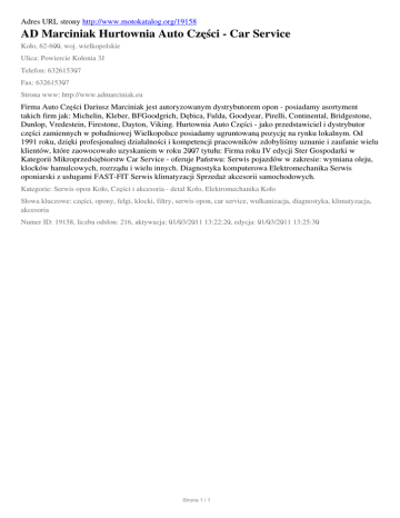 Adres URL strony http://www.motokatalog.org/19158 AD Marciniak Hurtownia Auto Części - Car Service Koło, 62-600, woj. wielkopolskie Ulica: Powiercie Kolonia 3J Telefon: 632615307 Fax: 632615307 Strona www: http://www.admarciniak.eu Firma Auto Części Dariusz Marciniak jest autoryzowanym dystrybutorem opon - posiadamy asortyment takich firm jak: Michelin, Kleber, BFGoodgrich, Dębica, Fulda, Goodyear, Pirelli, Continental, Bridgestone, Dunlop, Vredestein, Firestone, Dayton, Viking. Hurtownia Auto Części - jako przedstawiciel i dystrybutor części zamiennych w południowej Wielkopolsce posiadamy ugruntowaną pozycję na rynku lokalnym. Od 1991 roku, dzięki profesjonalnej działalności i kompetencji pracowników zdobyliśmy uznanie i zaufanie wielu klientów, które zaowocowało uzyskaniem w roku 2007 tytułu: Firma roku IV edycji Ster Gospodarki w Kategorii Mikroprzedsiębiorstw Car Service - oferuje Państwu: Serwis pojazdów w zakresie: wymiana oleju, klocków hamulcowych, rozrządu i wielu innych. Diagnostyka komputerowa Elektromechanika Serwis oponiarski z usługami FAST-FIT Serwis klimatyzacji Sprzedaż akcesorii samochodowych. Kategorie: Serwis opon Koło, Części i akcesoria - detal Koło, Elektromechanika Koło Słowa kluczowe: części, opony, felgi, klocki, filtry, serwis opon, car service, wulkanizacja, diagnostyka, klimatyzacja, akcesoria Numer ID: 19158, liczba odsłon: 216, aktywacja: 01/03/2011 13:22:20, edycja: 01/03/2011 13:25:30 Strona 1 / 1