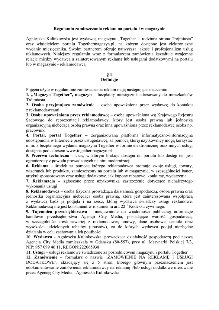 Regulamin zamieszczania reklam na portalu i w magazynie Agnieszka Kulinkowska jest wydawcą magazynu „Together – rodzinna strona Trójmiasta” oraz właścicielem portalu Togethermagazyn.pl, na którym dostępne jest elektroniczne wydanie miesięcznika. Swoim partnerom oferuje najwyższą jakość i profesjonalizm usług reklamowych. Niniejszy regulamin wraz z formularzem zamówienia kształtuje wzajemne relacje między wydawcą a zainteresowanym reklamą lub usługami dodatkowymi na portalu lub w magazynie - reklamodawcą. §1 Definicje Pojęcia użyte w regulaminie zamieszczania reklam mają następujące znaczenia: 1. „Magazyn Together”, magazyn – bezpłatny miesięcznik adresowany do mieszkańców Trójmiasta 2. Osoba przyjmująca zamówienie – osoba upoważniona przez wydawcę do kontaktu z reklamodawcami 3. Osoba upoważniona przez reklamodawcę – osoba upoważniona wg Krajowego Rejestru Sądowego do reprezentacji reklamodawcy, który jest osobą prawną lub jednostką organizacyjną niebędącą osobą prawną oraz inna upoważniona przez reklamodawcę osoba np. pracownik 4. Portal, portal Together – zorganizowana platforma informatyczno-informacyjna udostępniona w Internecie przez usługodawcę, za pomocą której użytkownicy mogą korzystać m.in. z bezpłatnego wydania magazynu Together w formie elektronicznej oraz innych usług, dostępna pod adresem www.togethermagazyn.pl 5. Przerwa techniczna – czas, w którym brakuje dostępu do portalu lub dostęp ten jest ograniczony z powodu prowadzonych na nim modernizacji 6. Reklama – środek za pomocą którego reklamodawca promuje swoje usługi, towary, wizerunek lub produkty, zamieszczony na portalu lub w magazynie, w szczególności baner, artykuł sponsorowany oraz usługi dodatkowe, jak kupony rabatowe, konkursy, wydarzenia 7. Reklamacja – zgłoszone przez użytkownika zastrzeżenie dotyczące nienależytego wykonania usługi 8. Reklamodawca – osoba fizyczna prowadząca działalność gospodarczą, osoba prawna oraz jednostka organizacyjna niebędąca osobą prawną, która jest zainteresowana współpracą z wydawcą bądź ją podjęła i na rzecz, której wydawca świadczy usługi reklamowe. Reklamodawcą nie jest konsument w rozumieniu art. 22 1 Kodeksu cywilnego. 9. Tajemnica przedsiębiorstwa – nieujawnione do wiadomości publicznej informacje handlowe przedsiębiorstwa Agencji City Media, posiadające wartość gospodarczą, w szczególności treść zawartej z reklamodawcą umowy, dane osobowe, cenniki oraz wysokości udzielonych rabatów (upustów), co do których wydawca podjął niezbędne działania w celu zachowania ich poufności 10. Wydawca - Agnieszka Kulinkowska, prowadząca działalność gospodarczą pod nazwą Agencja City Media zamieszkała w Gdańsku (80-557), przy ul. Marynarki Polskiej 7/3, NIP: 957 099 46 11, REGON:222065938 11. Usługi – usługi reklamowe świadczone za pośrednictwem magazynu i portalu Together 12. Zamówienie – formularz o nazwie „ZAMÓWIENIE NA REKLAMĘ I USŁUGI DODATKOWE", składający się z 5 stron, którego głównym przeznaczeniem jest udokumentowanie zamówienia reklamodawcy na reklamę i/lub usługi dodatkowe oferowane przez Agencję City Media - Agnieszka Kulinkowska. §2 Warunki realizacji 1. Podstawą do skorzystania z powierzchni reklamowych oraz usług oferowanych przez wydawcę, jest dostarczenie prawidłowo wypełnionego i podpisanego przez reklamodawcę lub osobę upoważnioną przez niego – zamówienia, do wydawcy bądź osoby przyjmującej zamówienie.. 2. Siedziba redakcji wydawcy mieści się w Centrum Biznesu „Zieleniak” przy ul. Wały Piastowskie 1, 80-855 Gdańsk. Dopuszczalną formą złożenia zamówienia jest przesłanie skanu zamówienia na adres poczty elektronicznej [email protected] lub [email protected] 3. Materiały reklamowe przygotowane odpowiednio do publikacji w magazynie powinny zostać dostarczone przez reklamodawcę najpóźniej do 5. dnia miesiąca. Materiały reklamowe przygotowane odpowiednio do publikacji na portalu powinny zostać dostarczone co najmniej 2 dni robocze przed zamówioną przez reklamodawcę publikacją. 4. Reklamodawca dostarcza materiały, o których mowa w ust. 3 do wydawcy bądź osoby przyjmującej zamówienie drogą elektroniczną na adres mailowy: [email protected] bądź [email protected], bądź w inny sposób ustalony pomiędzy stronami. 5. Akceptowane formy plików materiałów do publikacji w magazynie, to: EPS/PDF/TIFF/JPEG , do publikacji na portalu to GIF/FLASH w formatach określonych w cenniku zgodnych z zamówieniem złożonym przez reklamodawcę. 6. W przypadku niedostarczenia materiałów reklamowych zgodnych z zamówieniem, wydawcy przysługuje prawo do zamieszczenia materiałów będących w jego posiadaniu i przyjmuje się, że zamówienie zostało należycie wykonane. 7. Podane w cenniku ceny ogłoszeń i reklam dotyczą zajętej powierzchni reklamowej oraz materiałów gotowych do druku. Za opracowanie graficzne lub wykonanie reklamy według dostarczonego projektu dolicza sie dodatkowe koszty, w zależności od powierzchni i złożoności grafiki. 8.Wydawca zastrzega sobie prawo do odmowy publikacji reklamy, niezależnie od treści zamówienia, jeśli dostarczone materiały zdaniem wydawcy nie nadają sie do publikacji, w szczególności ze względu na ich niestosowny lub szkodliwy charakter, złą jakość dostarczonych materiałów itp. O zaistnieniu takiego faktu wydawca powiadomi reklamodawcę, nie później niż w terminie 14 (czternaście) dni od daty otrzymania zakwestionowanych materiałów. 9. Zamówienie wraz z ofertą cenową przedstawiane jest zainteresowanemu reklamodawcy po nawiązaniu kontaktu z wydawcą bądź osobą przyjmującą zamówienie w formie spotkania, kontaktu za pomocą poczty elektronicznej na adres [email protected], [email protected], [email protected] lub pod numerem telefonu wydawcy 515-042-092. §3 Formy współpracy 1. Wydawca o