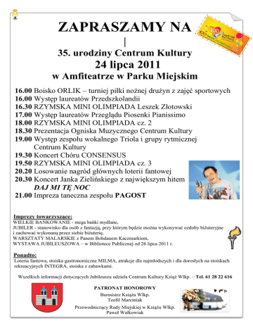 ZAPRASZAMY NA | 35. urodziny Centrum Kultury 24 lipca 2011 w Amfiteatrze w Parku Miejskim 16.00 Boisko ORLIK – turniej piłki nożnej drużyn z zajęć sportowych 16.00 Występ laureatów Przedszkolandii 16.30 RZYMSKA MINI OLIMPIADA Leszek Złotowski 17.00 Występ laureatów Przeglądu Piosenki Pianissimo 18.00 RZYMSKA MINI OLIMPIADA cz. 2 18.30 Prezentacja Ogniska Muzycznego Centrum Kultury 19.00 Występ zespołu wokalnego Triola i grupy rytmicznej Centrum Kultury 19.30 Koncert Chóru CONSENSUS 19.50 RZYMSKA MINI OLIMPIADA cz. 3 20.20 Losowanie nagród głównych loterii fantowej 20.30 Koncert Janka Zielińskiego z największym hitem DAJ MI TĘ NOC 21.00 Impreza taneczna zespołu PAGOST Imprezy towarzyszące: WIELKIE BAŃKOWANIE - mega bańki mydlane, JUBILER - stanowisko dla osób z fantazją, przy którym będzie można wykonywać ozdoby biżuteryjne i zachować wykonaną przez siebie biżuterię, WARSZTATY MALARSKIE z Panem Bohdanem Kaczmarkiem, WYSTAWA JUBILEUSZOWA – w Bibliotece Publicznej od 26 lipca 2011 r. Ponadto: Loteria fantowa, stoiska gastronomiczne MILMA, atrakcje dla najmłodszych i dla dorosłych na stoiskach rekreacyjnych INTEGRA, stoiska z zabawkami. Wszelkich informacji dotyczących Jubileuszu udziela Centrum Kultury Książ Wlkp. – Tel. 61 28 22 616 PATRONAT HONOROWY Burmistrz Książa Wlkp. Teofil Marciniak Przewodniczący Rady Miejskiej w Książu Wlkp. Paweł Walkowiak
