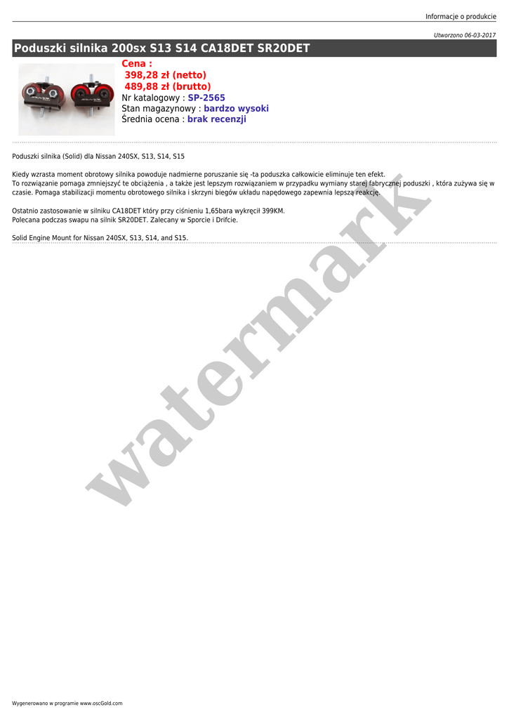 Informacje o produkcie Utworzono 06-03-2017 Poduszki silnika 200sx S13 S14 CA18DET SR20DET Cena : 398,28 zł (netto) 489,88 zł (brutto) Nr katalogowy : SP-2565 Stan magazynowy : bardzo wysoki Średnia ocena : brak recenzji Poduszki silnika (Solid) dla Nissan 240SX, S13, S14, S15 er m ar k Kiedy wzrasta moment obrotowy silnika powoduje nadmierne poruszanie się -ta poduszka całkowicie eliminuje ten efekt. To rozwiązanie pomaga zmniejszyć te obciążenia , a także jest lepszym rozwiązaniem w przypadku wymiany starej fabrycznej poduszki , która zużywa się w czasie. Pomaga stabilizacji momentu obrotowego silnika i skrzyni biegów układu napędowego zapewnia lepszą reakcję. Ostatnio zastosowanie w silniku CA18DET który przy ciśnieniu 1,65bara wykręcił 399KM. Polecana podczas swapu na silnik SR20DET. Zalecany w Sporcie i Drifcie. w at Solid Engine Mount for Nissan 240SX, S13, S14, and S15. Wygenerowano w programie www.oscGold.com