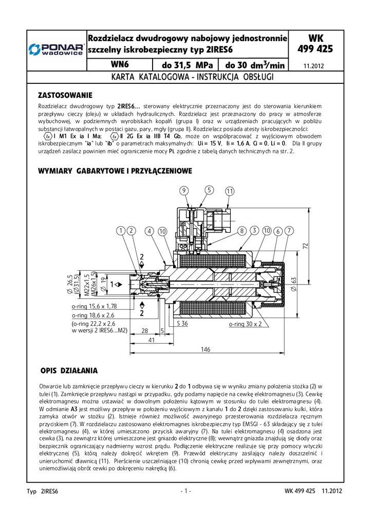 WK 499 425 Rozdzielacz dwudrogowy nabojowy jednostronnie szczelny iskrobezpieczny typ 2IRES6 WN6 do 31,5 MPa do 30 dm3/min KART ARTA KATALOGOWA - INSTRUK RUKCJA OBS OBSŁUGI 11.2012 ZASTOSOWANIE Rozdzielacz dwudrogowy typ 2 IRES IRES 6… sterowany elektrycznie przeznaczony jest do sterowania kierunkiem przepływu cieczy (oleju) w układach hydraulicznych. Rozdzielacz jest przeznaczony do pracy w atmosferze wybuchowej, w podziemnych wyrobiskach kopalń (grupa I) oraz w urządzeniach pracujących w pobliżu substancji łatwopalnych w postaci gazu, pary, mgły (grupa II). Rozdzielacz posiada atesty iskrobezpieczności: I M1 Ex ia I Ma; II 2G Ex ia IIB T4 Gb, Ma Gb może on współpracować z wyjściowym obwodem iskrobezpiecznym "ia ia" ib" ia lub "ib ib o parametrach maksymalnych: Ui = 15 V, V Ii = 1,6 A, A Ci = 0, 0 Li = 0. 0 Dla II grupy urządzeń zasilacz powinien mieć ograniczenie mocy Pi, Pi zgodnie z tabelą danych technicznych na str. 2. WYMIARY GABARYTOWE I PRZYŁĄCZENIOWE 9 2 4 11 8 10 3 10 6 7 72 1 5 63 1 o-ring 15,6 x 1,78 o-ring 18,6 x 2,6 (o-ring 22,2 x 2,6 w wersji 2 IRES6...M2) O 19 M22x1,5 (M26x1,5) OO O 26,5 ( 31,5) 2 2 S 36 28 o-ring 30 x 2 5 41 146 OPIS DZIAŁANIA Otwarcie lub zamknięcie przepływu cieczy w kierunku 2 do 1 odbywa się w wyniku zmiany położenia stożka (2) w tulei (1). Zamknięcie przepływu nastąpi w przypadku, gdy podamy napięcie na cewkę elektromagnesu (3). Cewkę elektromagnesu można ustawiać w dowolnym położeniu kątowym w stosunku do tulei elektromagnesu (4). W odmianie A3 jest możliwy przepływ w położeniu wyjściowym z kanału 1 do 2 dzięki zastosowaniu kulki, która zamyka otwór w stożku (2). Istnieje również możliwość awaryjnego przesterowania rozdzielacza ręcznym przyciskiem (7). W rozdzielaczu zastosowano elektromagnes iskrobezpieczny typ EMSGI - 63 składający się z tulei elektromagnesu (4), w której umieszczono przycisk awaryjny (7). Na tulei elektromagnesu (4) osadzona jest cewka (3), na zewnątrz której umieszczone jest gniazdo elektryczne (8); wewnątrz gniazda znajdują się diody oraz bezpiecznik ograniczający nadmierny wzrost prądu. Podłączenie elektryczne realizuje się przy pomocy wtyczki elektrycznej (5), którą należy dokręcić wkrętem (9). Przewód elektryczny zasilający należy doszczelnić i unieruchomić dławnicą (11). Pierścienie uszczelniające (10) chronią cewkę przed wpływami zewnętrznymi, oraz uniemożliwiają obrót cewki po dokręceniu nakrętką (6). Typ 2IRES6 -1- WK 499 425 11.2012 DANE TECHNICZNE Rodzaj cieczy hydraulicznej Wymagana filtracja cieczy hydraulicz nej Zalecana filtracja cieczy hydraulicznej Lepkość nominalna cieczy hydraulicznej Zakres lepkości cieczy hydraulicznej Optymalna temperatura pracy (cieczy w zbiorniku) Wilgotność względna powietrza Maksymal Maksymal ne dopuszczal ne ciśnie nie pracy Przepływ max Masa Napięcie zasilania U n Prąd zasilania In Stopień oc hro hrony ZGODNO DNOŚĆ Z DYR DY REKTYWĄ olej mineralny 16 µm 10 µm o 37 mm 2/s w temperaturze 55 C 2 2,8 do 328 mm /s o 40 do 55 C do 95 % 31,5 MPa 30 dm 3 /min 1,5 kg 12 V 110 mA IP 6 4 9 4 / 9 / WE Certyfi Certy fikat fi kat zapew nienia nienia jak ości Certyfi Certy fikat fi kat badania typu 1026 1026 FTZ FTZU 05 AT EX 0068 0 068 Cecha Cecha iskr obezpieczeńst wa Temperatura otoczenia T a nr : FTZ U 05 AT EX Q 01 3 II 2G 2 G Ex ia I IB T4 Gb I M 1 Ex ia I M a o - 20 do 60 C o - 20 do 40 C o - 20 do 60 C Pi Pi ≤ 1,2 W ≤ 1,3 W WYMAGANIA MONTAŻU I EKSPLOATACJI 1. 2. 3. 4. 5. Podłączenie elektryczne rozdzielacza powinno być wykonane zgodnie ze schematem elektrycznym – ark. ark. 2 ! Przewody elektryczne do podłączenia rozdzielacza winny odpowiadać wymaganiom stosowanych w urządzeniach górniczych. Rozdzielacz powinien być przyłączony przyłączony lub odłączony do (od) instalacji elektrycznej przez wykwalifikowanego pracownika. Po założeniu wtyczki należy ją zamocować wkrętem będącym na wyposażeniu. Podczas eksploatacji należy utrzymać zalecaną w Instrukcji Obsługi lepkość cieczy roboczej i zapewnić zapewnić wymaganą filtrację. 6. 7. 8. Aby zapewnić bezawaryjną i bezpieczną pracę rozdzielacza należy systematycznie sprawdzać: • stan połączenia elektrycznego • działanie rozdzielacza • czystość cieczy hydraulicznej Niedopuszczalny jest remont rozdzielacza w warunkach dołowych, uszkodzony rozdzielacz w celu usunięcia awarii należy przekazać do serwisu producenta. Adres serwisu, zgodny z adresem producenta, podany jest na ostatniej stronie niniejszej Karty Katalogowej – Instrukcji Obsługi. Obsługujący rozdzielacz iskrobezpieczny musi być zapoznany z treścią niniejszej Instrukcji. SCHEMATY symbol symbo l graf gr afic aficz iczny ro r ozdz zdziel ielacz acza 2IRES6 A1... 2IRES6 A3... wido idok przył przy łącz ącza gn g niazda zda schemat schem at ele e lek lektryczny trycz ny ro r ozdz zdziel ielacz acza B1 - 0,25A D1 1+ WK 499 425 11.2012 - + D2 1 2 -2 -2- Typ 2IRES6 WYMIARY GNIAZDA PRZYŁĄCZENIOWEGO 1,25 2,5 v 3,3 ±0,1 D +0,05 0,5 x 45 15 13 32 2 33 21 2,5 19 1,25 L O C B A 2,5 9,5 max SZCZEGÓŁ D 1 O O O 1 9,5 max 45° 9,5 min φ 0,025 - dotyczy wszystkich średnic otworu głównego i faz moment dokręcenia rozdzielacza 30 3 0 Nm Gniazdo M1 M2 A M22 x 1,5 M26 x 1,5 B φ 23 +0,15 φ 27,4 +0,15 C φ 28 φ 32 L 1 5 CHARAKTERYSTYKI dla lepkości cieczy hydraulicznej ν = 41 mm2 /s i temperatury t = 50 o C Chara arakterystyk terysty ki opor oporó orów przep pr zepły zepływ ływu Typ 2IRES6 -3- WK 499 425 11.2012 SPOSÓB ZAMAWIANIA Zamówienie wg zakodowanego jak niżej symbolu należy kierować na adres producenta 2IRES6 02 Schemat hydrauliczny schemat A1 schemat A3 = A1 = A3 Numer serii konstrukcyjnej (02-09) - niezmienne wymiary przyłącza i zabudowy = 02 Ilość położeń 2-położeniowy =2 Rodzaj przyłącza gniazdo M2 2 x 1,5 gniazdo M26 x 1,5 = M1 = M2 Napięcie zasilania elektromagnesu 12V DC 2 G12 Z4 * = G12 