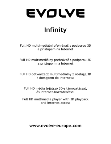 Infinity Full HD multimediální přehrávač s podporou 3D a přístupem na Internet Full HD multimediálny prehrávač s podporou 3D a prístupom na Internet Full HD odtwarzacz multimedialny z obsługą 3D i dostępem do Internetu Full HD média lejátszó 3D-s támogatással, és internet-hozzáféréssel Full HD multimedia player with 3D playback and Internet access www.evolve-europe.com CZ 1. Úvod 1.1 Upozornění 1.2.1 Doporučení k použití Provozní teplota v rozmezí +5°C až +35°C 1.2.2 Upozornění pro pevný disk EVOLVE Infinity používá interní pevný disk pro ukládání dat, disk lze defragmentovat pomocí obvyklého software. Data uložená na pevném disku mohou být poškozena nebo ztracena z důvodu fyzického poškození disku, elektrického proudového nárazu, ztráty napájení, proto doporučujeme zálohovat svá data. EVOLVE ani prodejce nenese žádnou odpovědnost za ztrátu uložených dat. 1.2.3 Další pokud se přehrávač dostane do kontaktu s vodou osušte jej hadříkem a vytřete dosucha nerozebírejte přehrávač, neměňte jeho design - na škody vzniklé touto manipulací se nevztahuje záruka netiskněte velkým tlakem tlačítka na přehrávači zabraňte nárazům, úderům, třesení a nevystavujte přehrávač magnetickému poli pokud elektrostatické pole způsobí nestadnardní chování přehrávače, vypněte jej z napájení a po krátké chvíli opět připojte Čelní panel 1.Tlačítko napájení & kontrolka napájení Režim Status Provozní Modrá Pohotovostní Červená Boční panel 1. Slot pro paměťové karty 2. Port USB 2.0 Host 3. Port USB 3.0 zařízení Zadní panel 1. 2. 3. 4. 5. 6. 7. Zdířka A/V výstup Zdířka Y/Pb/Pr výstup HDMI konektor Rozhraní Gigabit LAN Optický výstup S/PDIF Koaxiální digitální výstup Zdířka pro napájecí adaptér 1.3 Dálkový ovladač 1. Napájení 2. Číselná tlačítka 3. Náhodné přehrávání 4. Zeslabení 5. Ztišení 6. Menu 7. Domů 8. Navigační tlačítka 9. Stop 10. Přehrávání/Pauza 11. Zrychleně zpět 12. Zrychleně vpřed 13. Červená 14. Zelená (EPG) 15. Nastavení 16. TV systém 17. Přejít na 18. Pomalu 19. Prohlížeč 20. Editovat 21. Kopírovat 22. A-B 23. Úhel 24. Přiblížení 25. Audio 26. Titulky 27. Žlutá (TTX) 28. Modrá 29. Předchozí 30. Další 31. Info 32. OK 33. Zpět 34. Zesílení 35. Opakovat 36. Vysunout Číslo Tlačítko Funkce 1 2 Napájení Číselná tlačítka Náhodné přehrávání Zeslabení Ztišení Stiskem tlačítka přístroj zapnete nebo vypnete. Pomocí těchto tlačítek přímo zadáte číslo kanálu nebo číslice při nastavení v menu. 3 4 5 6 7 8 9 10 11 12 13 14 15 16 17 18 19 20 21 22 23 24 25 26 27 28 29 Spuštění náhodného přehrávání hudby. Tlačítko snížení hlasitosti. Stiskem tlačítka odpojíte zvukový výstup; opakovaným stiskem jej opět zapnete. Stiskem tlačítka vyvoláte nabídku menu, kde můžete nastavit parametry přehrávání. Opakovaným stiskem během Menu přehrávání menu zobrazíte nebo skryjete. Domů Tlačítko sloužící k rychlému přechodu na základní obrazovku. Stiskem směrových tlačítek volíte položky menu a jejich možnosti, stiskem tlačítka OK volbu potvrdíte. Při prohlížení Navigační tlačítka fotografií lze stiskem těchto tlačítek obrázek otáčet. Stop Stiskem tlačítka ukončíte přehrávání. Přehrávání/Pauza Pomocí tohoto tlačítka spustíte nebo pozastavíte přehrávání. Stiskem tlačítka se vrátíte v aktuálně přehrávaném souboru zrychleně zpět. Opakovaným stiskem volíte rychlost Zrychleně zpět převíjení zpět. Stiskem tlačítka se pohybujete v aktuálně přehrávaném souboru zrychleně vpřed. Opakovaným stiskem volíte rychlost Zrychleně vpřed převíjení vpřed. Červená Funkce je dostupné při použití virtuální klávesnice. Zelená Funkce je dostupné při použití virtuální klávesnice. Nastavení Stiskem tlačítka přejdete do režimu nastavení přístroje. TV systém Opakovaným stiskem tlačítka přepínáte mezi NTSC, PAL, 480p, 576p, 720p, 1080i a 1080p. Přejít na Stiskem tlačítka přejdete na zvolené místo v titulu. Tento bod můžete specifikovat pomocí funkcí Titul, Kapitola a Čas. Pomocí tohoto tlačítka spustíte zpomalené přehrávání. Standardní rychlost přehrávání obnovíte stiskem tlačítka Pomalu Přehrávání. Prohlížeč Stiskem tlačítka přejdete do správce souborů. Editovat Pomocí tohoto tlačítka můžete kopírovat/mazat/přejmenovat/přesunout soubory. Kopírovat Stiskem tlačítka přejdete do menu volby souboru. A-B Opakovaným stiskem tlačítka označíte začátek a konec úseku pro opakované přehrávání. Úhel Pomocí tohoto tlačítka můžete u DVD titulů, které to podporují, měnit úhly pohledu kamer. Přiblížení Stiskem tlačítka přiblížíte obraz při přehrávání videa nebo zobrazení fotografií. Audio Tlačítko slouží k volbě zvukové stopy videa. Stiskem tohoto tlačítka volíte možnosti filmových titulků. U titulků můžete změnit barvu/velikost/umístění/znakovou Titulky sadu. Žlutá Vyhrazené tlačítko. Ve stávající verzi firmware s ním není asociována žádná funkce. Modrá Pomocí tohoto tlačítka můžete vysunout nebo zasunout disk u externí DVD mechaniky připojené do USB. Předchozí Stiskem tlačítka zobrazíte předchozí soubor nebo stránku. 30 Následující 31 Info 32 33 34 35 36 OK Zpět Zesílení Opakovat Vysunout Stiskem tlačítka zobrazíte následující soubor nebo stránku. Tlačítko slouží pro zobrazení informací o aktuálním souboru nebo parametrech. Pokud ho stisknete během přehrávání, zobrazí se informační blok ukazující číslo stopy a uběhnutý a zbývající čas přehrávání. Funkce je dostupná pro virtuální klávesnici. Stiskem tlačítka OK potvrzujete volby. Stiskem tlačítka se vrátíte při procházení 