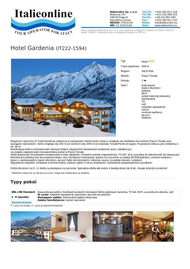Italieonline Sp. z o.o. Bryksova 757 198 00 Praga 9 Republika Czeska REGON: 27614140 NIP: CZ 27614140 Tel CZ: Tel SK: Tel PL: Fax: Email: Web: +420 284 811 218 +421 233 006 523 +48 223 987 493 +420 284 811 210 [email protected] www.italieonline.eu Biuro podróży Italieonline sp. z o.o. jest zapisane w Miejskim Sądzie w Pradze oddział C, wkład 118991 i ubezpieczone na wypadek upadku w ČPP a.s. Hotel Gardenia (IT222-1594) Typ: Hotel Trasa zjazdowa: 400 m Region: Val di Sole Miasto: Passo Tonale Pokoje: 2 Opis*: kryty basen basen dla dzieci parking Wi-Fi pobyt zwierząt zakazany ogrzewanie TV sejf niepełne wyżywienie sauna centrum wellness jacuzzi siłownia Elegancki i gościnny 3* hotel Gardenia, położony w spokojnym i słonecznym miejscu znajduje się niedaleko od centrum Passo Tonale oraz wyciągów narciarskich. Hotel znajduje się 100 m od centrum oraz 400 m od skiareału Tonale/Ponte di Legno. Przystanek skibusu jest oddalony o ok. 50 m. Komfortowy hotel z przestronnym i jasnym hollem, eleganckim drewnianym wnętrzem wraz z dbałością o szczegóły, zapewni wam niezapomniany pobyt w Passo Tonale. Hotel dysponuje 50 pokojami urządzonymi w stylu alpejskim. Przytulne pokoje mają łazienkę, TV SaT, wi fi, suszarkę do włosów,sejf. Do dyspozycji klientów jest parking (do wyczerpania miejsc, bez możliwości rezerwacji), garaże (na życzenie za opłatą 50 EUR/tydzień), centrum wellness basen z wodospadem, basen dla dzieci, jacuzzi (tylko dla dorosłych), siłownia, sauna, za opłatą masaże i solarium. Wyżywienie niepełne: śniadanie w formie bufetu, kolacje wybór z menu (możliwość zamówienia wegetariańskich posiłków). Zniżki dla dzieci na 3. i 4. łóżko są dostępne na życzenie. Specjalna oferta dla rodzin z dwójką dzieci do 8 lat - drugie dziecko za darmo! * Niektóre usługi nie są wliczone w cenę i mogą być świadczone za dopłatą. Typy pokoi DBL+HB Standard 2 (double) Zarezerwować dwuosobowy pokój z możliwością dwóch dostawek (łóżko piętrowe), łazienka, TV Sat, Wi-Fi, suszarka do włosów, sejf W cenie: niepełne wyżywienie, poszewki, ręczniki (za tydzień) Wymagane opłaty: ewentualna opłata miejscowa Opłaty fakultatywne: karnet narciarski P - cena na osobę, A - cena za apartament/pokój Prezentowane zdjęcia są przykładowe. DBL+HB Standard 2 Sezon (double) Terminy Cena za noc / P Początek pobytu Koniec pobytu Min. ilość nocy A 03.12. - 16.12.2016 15.04. - 22.04.2017 308 zł Sob Sob 7 B 07.01. - 13.01.2017 17.12. - 23.12.2016 25.03. - 07.04.2017 343 zł Sob Sob 7 C 24.12. - 30.12.2016 462 zł Sob Sob 7 D 31.12. - 06.01.2017 506 zł Sob Sob 7 E 14.01. - 27.01.2017 11.03. - 24.03.2017 352 zł Sob Sob 7 F 28.01. - 10.02.2017 387 zł Sob Sob 7 G 11.02. - 10.03.2017 396 zł Sob Sob 7 H 08.04. - 14.04.2017 330 zł Sob Sob 7 https://www.italieonline.eu/pl/passo-tonale/hotel-gardenia-1594.html www.ITALIEONLINE.eu TOUR OPERATOR FOR ITALY