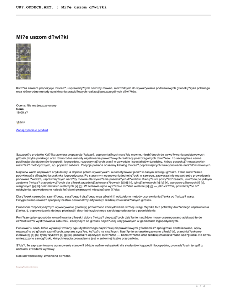 UK?.ODDECH.ART. : Mi?e uszom d?wi?ki Mi?e uszom d?wi?ki Ksi??ka zawiera propozycje ?wicze?, usprawniaj?cych narz?dy mowne, niezb?dnych do wywo?ywania podstawowych g?osek j?zyka polskiego oraz ró?norodne metody uzyskiwania prawid?owych realizacji poszczególnych d?wi?ków. Ocena: Nie ma jeszcze oceny Cena 19,00 z? Zadaj pytanie o produkt Szczegó?y produktu Ksi??ka zawiera propozycje ?wicze?, usprawniaj?cych narz?dy mowne, niezb?dnych do wywo?ywania podstawowych g?osek j?zyka polskiego oraz ró?norodne metody uzyskiwania prawid?owych realizacji poszczególnych d?wi?ków. To szczególnie cenna publikacja dla studentów logopedii, logopedów, rozpoczynaj?cych prac? w zawodzie i specjalistów dziedziny, którzy poszukuj? nowatorskich rozwi?za? metodycznych, np. poprzez zabaw?. Pozycja posiada obszerny katalog ?wicze? poprawiaj?cych funkcjonowanie narz?dów mownych. Najpierw warto usprawni? artykulatory, a dopiero potem wywo?ywa? i automatyzowa? jedn? w danym szeregu g?osk?. Takie rozwi?zanie podyktowa?a d?ugoletnia praktyka logopedyczna. Po starannym opanowaniu jednej g?oski w szeregu, zazwyczaj nie ma potrzeby prowadzenia ponownie ?wicze?, usprawniaj?cych narz?dy mowne dla wywo?ania pozosta?ych d?wi?ków. Kieruj?c si? powy?sz? zasad?, u?o?ono po jednym zestawie ?wicze? przygotowuj?cych dla g?osek przednioj?zykowo-z?bowych [t] [d] [n], tylnoj?zykowych [k] [g] [x], wargowo-z?bowych [f] [v], wargowych [p] [b] oraz mi?kkich welarnych [k] [g]. W zestawie uj?to wy??cznie mi?kkie welarne [k] [g] — jako cz??ciej powtarzaj?ce si? odchylenia, spowodowane nalecia?o?ciami gwarowymi mieszka?ców ?l?ska. Dla g?osek szeregów: szumi?cego, sycz?cego i cisz?cego oraz g?oski [r] oddzielono metody usprawniania j?zyka od ?wicze? warg. Przygotowano równie? specjalny zestaw doskonal?cy artykulacj? rzadziej zniekszta?canych g?osek. Procesom rozpoczynaj?cym wywo?ywanie g?oski [r] po?wi?cono zdecydowanie wi?cej uwagi. Wynika to z potrzeby dok?adnego usprawnienia j?zyka, tj. doprowadzenia do jego pionizacji i dwu- lub trzykrotnego szybkiego uderzania o podniebienie. Poni?sze opisy sposobów wywo?ywania g?osek i zbiory ?wicze? ulepszaj?cych dzia?anie narz?dów mowy uszeregowano adekwatnie do cz?stotliwo?ci wyst?powania zaburze?, zaczynaj?c od g?osek najcz??ciej korygowanych w gabinetach logopedycznych. Poniewa? u osób, które wykazuj? zmiany typu dyslalicznego najcz??ciej nieprawid?owymi g?oskami s? spó?g?oski dentalizowane, opisy rozpocz?to od g?osek szumi?cych, poprzez sycz?ce, ko?cz?c na cisz?cych. Nast?pnie scharakteryzowano g?osk? [r], przednioj?zykowoz?bowe [t] [d] [n], tylnoj?zykowe [k] [g] [x], pozosta?e opozycje: d?wi?czna — bezd?wi?czna oraz rzadziej zniekszta?cane spó?g?oski. Na ko?cu umieszczono samog?oski, których terapia prowadzona jest w znikomej liczbie przypadków. S?dz?, ?e zaprezentowane opracowanie stanowi? b?dzie wa?ne wskazówki dla studentów logopedii i logopedów, prowadz?cych terapi? z uczniami z wadami wymowy. Nak?ad wznowiony, zmieniona ok?adka. Cena przesy?ki ustalana indywidualnie. 1 / 2 UK?.ODDECH.ART. : Mi?e uszom d?wi?ki Przed zamówieniem Ten adres pocztowy jest chroniony przed spamowaniem. Aby go zobaczy?, konieczne jest w??czenie w przegl?darce obs?ugi JavaScript. // . Termin realizacji zamówienia od 24h do 14 dni roboczych. Opinie Nikt jeszcze nie ocenia? tego produktu. 2 / 2 Powered by TCPDF (www.tcpdf.org)