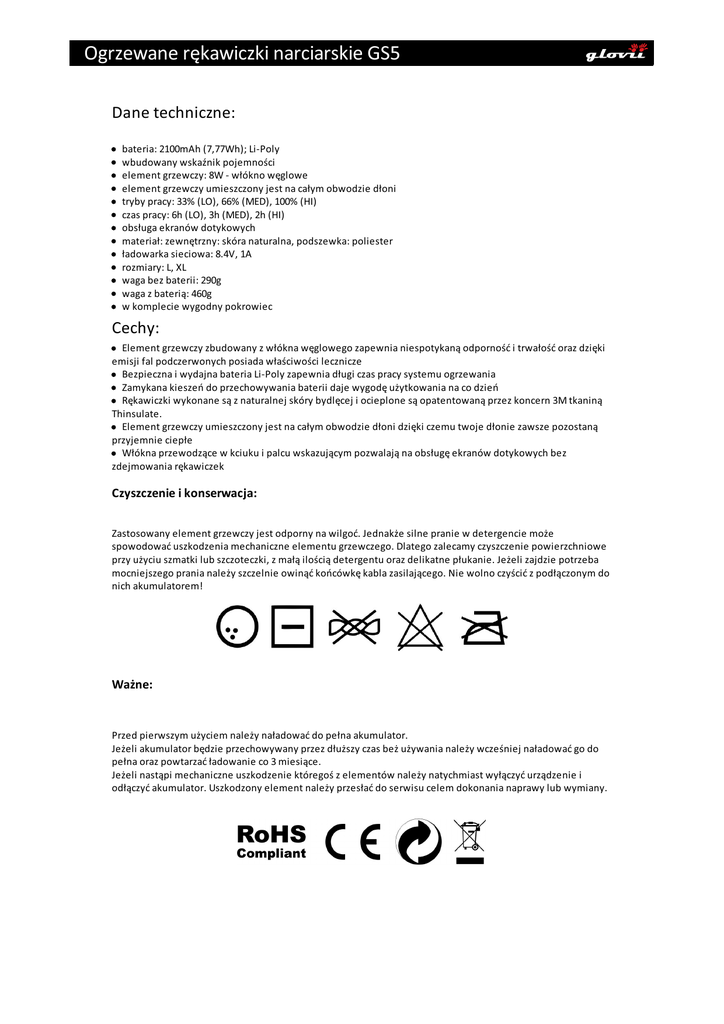 Ogrzewane rękawiczki narciarskie GS5 Dane techniczne: bateria: 2100mAh (7,77Wh); Li-Poly wbudowany wskaźnik pojemności element grzewczy: 8W - włókno węglowe element grzewczy umieszczony jest na całym obwodzie dłoni tryby pracy: 33% (LO), 66% (MED), 100% (HI) czas pracy: 6h (LO), 3h (MED), 2h (HI) obsługa ekranów dotykowych materiał: zewnętrzny: skóra naturalna, podszewka: poliester ładowarka sieciowa: 8.4V, 1A rozmiary: L, XL waga bez baterii: 290g waga z baterią: 460g w komplecie wygodny pokrowiec Cechy: Element grzewczy zbudowany z włókna węglowego zapewnia niespotykaną odporność i trwałość oraz dzięki emisji fal podczerwonych posiada właściwości lecznicze Bezpieczna i wydajna bateria Li-Poly zapewnia długi czas pracy systemu ogrzewania Zamykana kieszeń do przechowywania baterii daje wygodę użytkowania na co dzień Rękawiczki wykonane są z naturalnej skóry bydlęcej i ocieplone są opatentowaną przez koncern 3M tkaniną Thinsulate. Element grzewczy umieszczony jest na całym obwodzie dłoni dzięki czemu twoje dłonie zawsze pozostaną przyjemnie ciepłe Włókna przewodzące w kciuku i palcu wskazującym pozwalają na obsługę ekranów dotykowych bez zdejmowania rękawiczek Czyszczenie i konserwacja: Zastosowany element grzewczy jest odporny na wilgoć. Jednakże silne pranie w detergencie może spowodować uszkodzenia mechaniczne elementu grzewczego. Dlatego zalecamy czyszczenie powierzchniowe przy użyciu szmatki lub szczoteczki, z małą ilością detergentu oraz delikatne płukanie. Jeżeli zajdzie potrzeba mocniejszego prania należy szczelnie owinąć końcówkę kabla zasilającego. Nie wolno czyścić z podłączonym do nich akumulatorem! Ważne: Przed pierwszym użyciem należy naładować do pełna akumulator. Jeżeli akumulator będzie przechowywany przez dłuższy czas beż używania należy wcześniej naładować go do pełna oraz powtarzać ładowanie co 3 miesiące. Jeżeli nastąpi mechaniczne uszkodzenie któregoś z elementów należy natychmiast wyłączyć urządzenie i odłączyć akumulator. Uszkodzony element należy przesłać do serwisu celem dokonania naprawy lub wymiany. Ogrzewane rękawiczki narciarskie GS5 INSTRUKCJA Ładowanie wewnętrznego akumulatora urządzenia: Podłącz akumulatory do gniazd ładowarki sieciowej a następnie podłącz ładowarkę do prądu. Czas ładowania akumulatorów wynosi około 5-6 godzin. Uruchomienie i eksploatacja: Każdorazowo przed uruchomieniem upewnij się, że wbudowany przewód połączeniowy nie jest uszkodzony mechanicznie. Upewnij się również, że podłączany akumulator nie posiada uszkodzeń mechanicznych. Podłącz akumulator z przewodem wbudowanym w rękawiczkę. Umieść akumulator w kieszeni i zapnij kieszeń zamkiem błyskawicznym. Aby uruchomić funkcję grzania naciśnij i przytrzymaj przez 2 sekundy przycisk POWER. Urządzenie zostanie włączone z siłą grzania 100%. Kolejne krótkie naciśnięcia przycisku POWER powodują przełączanie na 66%, 33% i ponownie 100%, co sygnalizowane jest zapalaniem się odpowiednich diod. Aby wyłączyć funkcję grzania naciśnij długo przycisk POWER