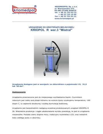 KRIOMEDPOL Sp. z o.o. ul. Warszawska 272 05-082 STARE BABICE tel. + 48 22 752 93 21 + 48 22 733 19 05 fax + 48 22 752 93 21 www.kriomedpol.pl _______________________________________________________________________ URZĄDZENIE DO KRIOTERAPII MIEJSCOWEJ KRIOPOL R wer.3 "Mistral" Urządzenie dostępne jest w wersjach: ze zbiornikiem o pojemności 15, 31,5 lub 50 dm3. Zastosowanie Urządzenie przeznaczone jest do miejscowego wychładzania tkanki. Czynnikiem roboczym jest ciekły azot,dzięki któremu na wylocie dyszy uzyskujemy temperaturę -160 stopni C, co zapewnia skuteczną i szybką stymulację bodźcową. Urządzenie jest bezpośrednim następcą wcześniej produkowanych urządzeń KRIOPOL R 26. Wieloletnia produkcja i ciągłe udoskonalanie wyrobu powodują, że jest to urządzenie niezawodne. Posiada cztery stopnie mocy, tradycyjny wyświetlacz LCD, oraz wskaźnik ilości ciekłego azotu w zbiorniku. Kriomedpol Kriopol R w.3 "Mistral ___________________________________________________________ Parametry i opis urządzenia Ta wersja różni się od pozostałych urządzeń następującymi cechami: 1. Posiada funkcje umożliwiające pracę z nim osobom o słabym wzroku i słuchu (bardzo duże cyfry, synteza głosu)\ 2. Zmieniony został sposób sterowania mocą urządzenia co pozwoliło na wprowadzenie dwóch dodatkowych trybów pracy – pulsacja 1 i pulsacja 2 oraz zamiennie płynną regulację mocy 3. Wprowadzony został tryb ustawień służący dopasowaniu parametrów urządzenia do potrzeb użytkownika. 4. Zmodyfikowany został wygląd urządzenia Ad. 1. - Wyświetlacz alfanumeryczny LCD 4X20 o bardzo dużych, czytelnych znakach. W czasie wykonywania zabiegu wyświetlany jest tylko upływający czas i tryb pracy, cyfry mają wtedy maksymalną możliwą do uzyskania wysokość – około 40 mm. - Synteza głosu – polega na głosowej informacji wszystkich komend zadawanych przy obsłudze panela sterującego. Oprócz podstawowych komunikatów funkcyjnych synteza głosu jest wykorzystywana przy podawaniu informacji o czasie trwania zabiegu – co 30 sekund podawany jest czas trwania zabiegu. Ad. 2. - Modyfikacja zasilania głowicy urządzenia polegająca na wprowadzeniu dodatkowych stopni mocy. Chodzi o dwa stopnie: pulsacja 1 i pulsacja 2. Dzięki takiej opcji zdecydowanie obniżyliśmy zużycie azotu o 50% w stosunku do maksymalnej mocy (odpowiednio na zakresie 2 i 3). Wynika to z faktu okresowego zasilania grzałki (przez pół okresu grzałka jest zasilana a następnie przez pół okresu pozostaje w spoczynku). Dzięki takiemu zasilaniu wymuszanie parowania odbywa się przez połowę całkowitego czas zabiegu, a objętość kompensacyjna w zbiorniku pozwala na uzyskanie pulsującego strumienia azotu. dodatkowo – jeżeli zasilamy głowicę tylko przez połowę czasu, wtedy zużycie energii elektrycznej jest praktycznie o połowę mniejsze. - Wprowadzona jest możliwość użycia płynnej zamiast stopniowej regulacji mocy. Kriomedpol Kriopol R w.3 "Mistral ___________________________________________________________ Ad. 3. - Wejście w tryb ustawień możliwe jest tylko w momencie włączania urządzenia w sposób opisany w instrukcji. Zapobiega to przypadkowemu wejściu w ustawienia w czasie pracy. Wiele parametrów opisanych w instrukcji obsługi może być ustawiane przez użytkownika . Między innymi można ustawić płynną lub skokową regulację mocy, ustawić głos męski lub żeński, dopasować głośność komunikatów, wyłączyć stopnie pulsacyjne, ustawić jasność podświetlenia wyświetlacza i inne. Ad. 4. - Zastosowano nową obudowę panela sterującego, w obecnej wersji (Mistral) posiada płaską obudowę aluminiową, zostało wprowadzone pokrętło do regulacji mocy urządzenia. Rozwiązanie takie jest bardziej intuicyjne niż przyciski. wprowadzono podświetlany panel, zmieniono konstrukcję wózka jezdnego, który teraz charakteryzuje się bardziej płaską powierzchnią górną, demontowalną sztycą podtrzymującą panel sterujący. Panel Gwarancja i serwis Urządzenie objęte jest 2-letnią gwarancją producenta. Firma zapewnia serwis gwarancyjny i pogwarancyjny w ciągu 60-ciu godz. od momentu przyjęcia zgłoszenia Warunki dostawy i szkolenie Firma „KRIOMEDPOL” zobowiązuje się do bezpłatnego dostarczenia i uruchomienia urządzenia oraz przeszkolenia z zakresu obsługi technicznej i medycznej w pełni przygotowując personel do pracy na w/w urządzeniu