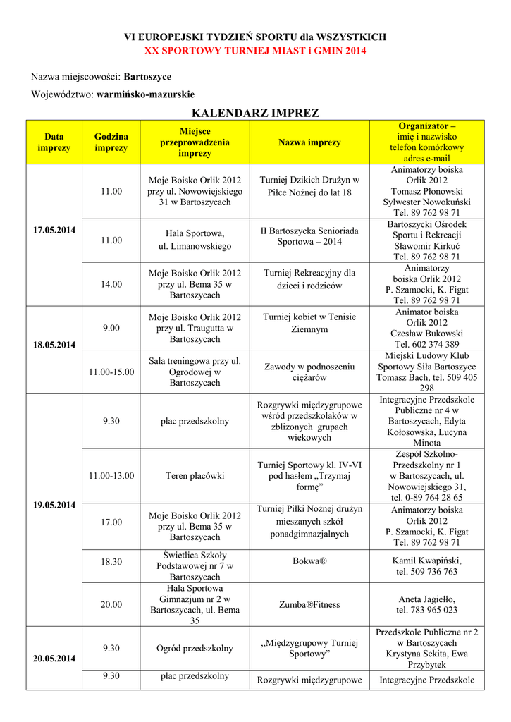 VI EUROPEJSKI TYDZIEŃ SPORTU dla WSZYSTKICH XX SPORTOWY TURNIEJ MIAST i GMIN 2014 Nazwa miejscowości: Bartoszyce Województwo: warmińsko-mazurskie KALENDARZ IMPREZ Data imprezy Godzina imprezy Miejsce przeprowadzenia imprezy 11.00 Moje Boisko Orlik 2012 przy ul. Nowowiejskiego 31 w Bartoszycach Turniej Dzikich Drużyn w Piłce Nożnej do lat 18 11.00 Hala Sportowa, ul. Limanowskiego II Bartoszycka Senioriada Sportowa – 2014 14.00 Moje Boisko Orlik 2012 przy ul. Bema 35 w Bartoszycach Turniej Rekreacyjny dla dzieci i rodziców 9.00 Moje Boisko Orlik 2012 przy ul. Traugutta w Bartoszycach Turniej kobiet w Tenisie Ziemnym 11.00-15.00 Sala treningowa przy ul. Ogrodowej w Bartoszycach Zawody w podnoszeniu ciężarów 9.30 plac przedszkolny Rozgrywki międzygrupowe wśród przedszkolaków w zbliżonych grupach wiekowych 11.00-13.00 Teren placówki Turniej Sportowy kl. IV-VI pod hasłem „Trzymaj formę” 17.00 Moje Boisko Orlik 2012 przy ul. Bema 35 w Bartoszycach 17.05.2014 18.05.2014 19.05.2014 18.30 20.00 Świetlica Szkoły Podstawowej nr 7 w Bartoszycach Hala Sportowa Gimnazjum nr 2 w Bartoszycach, ul. Bema 35 Nazwa imprezy Turniej Piłki Nożnej drużyn mieszanych szkół ponadgimnazjalnych Bokwa® Kamil Kwapiński, tel. 509 736 763 Zumba®Fitness Aneta Jagiełło, tel. 783 965 023 Przedszkole Publiczne nr 2 w Bartoszycach Krystyna Sekita, Ewa Przybytek Integracyjne Przedszkole 9.30 Ogród przedszkolny ,,Międzygrupowy Turniej Sportowy” 9.30 plac przedszkolny Rozgrywki międzygrupowe 20.05.2014 Organizator – imię i nazwisko telefon komórkowy adres e-mail Animatorzy boiska Orlik 2012 Tomasz Płonowski Sylwester Nowokuński Tel. 89 762 98 71 Bartoszycki Ośrodek Sportu i Rekreacji Sławomir Kirkuć Tel. 89 762 98 71 Animatorzy boiska Orlik 2012 P. Szamocki, K. Figat Tel. 89 762 98 71 Animator boiska Orlik 2012 Czesław Bukowski Tel. 602 374 389 Miejski Ludowy Klub Sportowy Siła Bartoszyce Tomasz Bach, tel. 509 405 298 Integracyjne Przedszkole Publiczne nr 4 w Bartoszycach, Edyta Kołosowska, Lucyna Minota Zespół SzkolnoPrzedszkolny nr 1 w Bartoszycach, ul. Nowowiejskiego 31, tel. 0-89 764 28 65 Animatorzy boiska Orlik 2012 P. Szamocki, K. Figat Tel. 89 762 98 71 wśród przedszkolaków w zbliżonych grupach wiekowych 10.00-11.30 Teren placówki Turniej zabaw i gier sportowych dla grup „0”„Najmłodsi na Start” 12.00 Stadion Miejski im. Kazimierza Górskiego w Bartoszycach, ul. Sportowa 23 Drużynowe zawody lekkoatletyczne dziewcząt i chłopców Szkół Gimnazjalnych 14.15-16.15 Boisko orlik przy SP7 TURNIEJ PIŁKI NOŻNEJ DZIEWCZĄT KLAS V SP7 16.00 Moje Boisko Orlik 2012 przy ul. Traugutta w Bartoszycach Mistrzostwa Bartoszyc w Bule do lat 50 9.00 sala gimnastyczna Szkoły Podstawowej nr 7 w Bartoszycach V Olimpiada przedszkolaka dla dziewczyny i chłopaka!" 10.00- 12.00 Teren placówki - Turniej Sportowy kl.I-III pod hasłem „W zdrowym ciele zdrowy duch” 15.00 ogród przedszkolny, jeziorko miejskie w okolicach przedszkola III Bieg Dwójeczki 15.05-16.35 Hala SP7 Bartoszyce TURNIEJ PIŁKI RĘCZNEJ DZIEWCZĄT KLAS V SP7 17.30-20-30 Moje Boisko Orlik 2012 przy ul. Bema 35 w Bartoszycach Bartoszycki Amatorska Turniej w Piłce Nożnej 6 osobowej 21.05.2014 18.30 20.00 10.30 Świetlica Szkoły Podstawowej nr 7 w Bartoszycach Gimnazjum nr 2 w Bartoszycach, ul. Bema 35 9.30 Zespół SzkolnoPrzedszkolny nr 1 w Bartoszycach, ul. Nowowiejskiego 31, tel. 0-89 764 28 65 Koordynator Sportu Szkolnego Marek Ignatowski Tel. 89 762 98 71 Szkoła Podstawowa nr 7 w Bartoszycach Elżbieta Petrecka, Irena Daćko, Artur Kupis Animator boiska Orlik 2012 Czesław Bukowski Tel. 602 374 389 Integracyjne Przedszkole Publiczne nr 4 w Bartoszycach, Edyta Kołosowska, Lucyna Minota Zespół SzkolnoPrzedszkolny nr 1 w Bartoszycach, ul. Nowowiejskiego 31, tel. 0-89 764 28 65 Przedszkole Publiczne nr 2 w Bartoszycach Krystyna Sekita, Ewa Przybytek Szkoła Podstawowa nr 7 w Bartoszycach Elżbieta Petrecka, Irena Daćko, Artur Kupis Bartoszycki Ośrodek Sportu i Rekreacji Sławomir Kirkuć Tel. 89 762 98 71 Bokwa® Kamil Kwapiński, tel. 509 736 763 Zumba®Fitness Aneta Jagiełło, tel. 783 965 023 ogród przedszkolny Zumba®Kids Jr plac przedszkolny Rozgrywki międzygrupowe wśród przedszkolaków w zbliżonych grupach wiekowych 22.05.2014 Publiczne nr 4 w Bartoszycach, Edyta Kołosowska, Lucyna Minota Przedszkole Publiczne nr 2 w Bartoszycach Krystyna Sekita, Ewa Przybytek Integracyjne Przedszkole Publiczne nr 4 w Bartoszycach, Edyta Kołosowska, Lucyna Minota 23.05.2014 12.00-18.00 Stadion Miejski im. Kazimierza Górskiego w Bartoszycach, ul. Sportowa 23 9.30 Boisko Komendy Powiatowej Państwowej Straży Pożarnej w Bartoszycach Ogólnopolska akcja „POLSKA BIEGA” 10.00 ogród przedszkolny Turniej międzygrupowy ,,Dwa ognie” 11.00 stadion przy ulicy Ogrodowej w Bartoszycach ,,Bieg z 9-tką" 11.00 ogród przedszkolny ,,Tańczymy i śpiewamy” – zabawy ruchowe przy muzyce według C. Orffa 16.00 Moje Boisko Orlik 2012 przy ul. Nowowiejskiego 31 w Bartoszycach Mistrzostwa SP-4 w piłce nożnej chłopców i dziewcząt 16.00 Moje Boisko Orlik 2012 przy ul. Traugutta w Bartoszycach Turniej Piłki Nożnej Moje Boisko Orlik 2012 przy ul. Bema 35 w Bartoszycach Amatorski Turniej Piłkarski 17.30 Test Coopera Siarkowski Szymon, Urząd Miasta Bartoszyce, tel. 509 318 713 Integracyjne Przedszkole Publiczne nr 4 w Bartoszycach Edyta Kołosowska Lucyna Minota Przedszkole Publiczne nr 2 w Bartoszycach Krystyna Sekita, Ewa Przybytek Przedszkole Publiczne nr 9 w Bartoszycach, Anna Sobolewska, Monika Dujnowska Przedszkole Publiczne nr 2 w Bartoszycach Krystyna Sekita, Ewa Przybytek Animatorzy boiska Orlik 2012 T. Płonowski S. Nowokuński Tel. 89 762 98 71 Animator boiska Orlik 2012 Czesław Bukowski Tel. 602 374 389 Bartoszycki Ośrodek Sportu i Rekreacji Sławomir Kirkuć Tel. 89 762 98 71