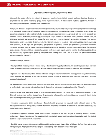 „Wprost”: gusta i bezguścia, czyli wybory 2015 Ubiór polityka często mówi o nim więcej niż głoszone z zapałem hasła. Żakiet, krawat, szalik czy kapelusz świadczą o przynależności do jasno określonej grupy. Fałsz wychwycić łatwo. W najnowszym wydaniu tygodnika „Wprost” – wyborcze gusta i bezguścia kampanii Anno Domini 2015. Politycy, ich doradcy i eksperci od wizerunku wiedzą doskonale, że pierwszej weryfikacji wyborczych preferencji dokonują oczy obywateli. Mogą zobaczyć człowieka emanującego dyskretną elegancją albo osobę pozbawioną gustu, która nie potrafi nawet zestawić odpowiednio kolorów poszczególnych części garderoby. A przecież jeśli nie potrafi sprostać tak łatwemu zadaniu, to trudno powierzać jej poważniejsze. Druga kwestia to tożsamość. Wielu polityków błędnie sądzi, że jeśli będą wyglądać jak większość ich wyborców, to ci będą się z nimi utożsamiać. Nic bardziej błędnego. Jest jeszcze trzecia cecha ubioru kandydata do zajmowania najwyższych urzędów w państwie – obywatele, patrząc na niego, muszą mieć pewność, że nie będą się go wstydzić, gdy pojedzie za granicę. Dopiero po spełnieniu tych trzech warunków obywatele przestają zwracać uwagę na ubiór polityka i zaczynają się skupiać na tym, co ma do powiedzenia. Jak wygląda polska scena polityczna widziana z perspektywy stroju polityków, gdzie kupuje ubrania premier Ewa Kopacz, gdzie ubiera się Donald Tusk, a gdzie kupuje garnitury prezydent elekt Andrzej Duda – no i kto za to płaci – o tym w najnowszym wydaniu tygodnika „Wprost”. Ponadto w nowym „Wprost”: - Po pięciu latach możemy mówić o końcu wojny z dopalaczami. Wygrali producenci. Ale państwo jeszcze tego nie wie i udaje, że walczy dalej, czyli o tym jak rząd próbuje zakazać niebezpiecznych substancji i jak to się robi na świecie. - I jeszcze raz o dopalaczach, które działają setki razy silniej niż klasyczne narkotyki. Niszczą przede wszystkim centralny układ nerwowy. By powstały w nim nieodwracalne zmiany, dopalacze wystarczy zażyć tylko raz. Dlaczego i na czym polega siła dopalaczy? - A dopalacze to tylko przykład tego, jak słabe jest państwo w walce z nielegalnym handlem. Podobnie nieskuteczne jest w konfrontacji z szarą strefą w branży tytoniowej. Szczegóły w najnowszym wydaniu tygodnika „Wprost”. - Rozpoczynająca się kampania wyborcza to prawdziwy gejzer nowych idei politycznych. Ministrowie wybierani przez Internet, kadencyjność posłów, okrągłe karty do głosowania, zakaz publikowania sondaży przed wyborami - to nie żarty, tylko zupełnie poważne pomysły poważnych polityków. - Poważne ugrupowanie, jakim jest Prawo i Sprawiedliwość, proponuje na przykład model edukacji rodem z PRL. Nauczycielom obiecuje mniej pracy, uczniom Narodowe Programy Nauczania, a rodzicom to, że sami zadecydują, czy posłać sześciolatka do szkoły. - Na łamach tygodnika również watek polskich służb. Wygląda na to, że CBA jest w otwartej wojnie z rządem, prokuraturą i Sądem Najwyższym. We wszystkich tych instytucjach agenci badają przetargi. Szukają korupcji. A w tle jest śledztwo w sprawie kelnerskich podsłuchów. - Zarabiać można na wszystkim, nawet na hitlerowskich sentymentach. Na przykład w Wilczym Szańcu. Przez lata to były łatwe pieniądze. Aż przyszedł leśniczy i pogonił z lasu spółkę, która dzierżawi teren. Dlaczego? PMPG Polskie Media SA Batory Office Building II, Al. Jerozolimskie 212, 02-486 Warszawa tel. (+48 22) 347 50 00, fax (+48 22) 347 50 01, www.point-group.pl NIP 521-00-88-831, REGON 010768408, KRS 0000051017, Kapitał zakładowy: 103 897 320 zł - Sprawa Romana Kluski niczego nie zmieniła. Polski biznes traktowany jest opresyjnie. Największe straty ponoszą oczywiście najsłabsi – mówi Jacek Domogała, twórca grupy kapitałowej Famur. We „Wprost” – rozmowa z przedsiębiorcą, który zazwyczaj unika mediów. Dlaczego? - A w cyklu „Ambasadorzy polskiej gospodarki” - agencja kreatywna Ars Thanea. Ich produkty są niemal wszędzie, choć poza branżą mało kto o tym wie. W bogatym portfolio agencji, specjalizującej się w marketingu, produkcji CGI i animacji, roi się od projektów zrealizowanych dla globalnych gigantów. Z usług Polaków korzystali m.in. Nike, Disney, Dodge, LifeProof, DuPont, Hyundai i British Airways. - Miała być rewolucją w polskim systemie podatkowym, może okazać się strzałem z kapiszona. Dyrektywa in dubio pro tributario, pozwalająca rozstrzygać wątpliwości prawne na korzyść podatnika, została tak skonstruowana przez Bronisława Komorowskiego, że nie sposób jej użyć w praktyce. O co chodzi? - W przewodniku wakacyjnym tym razem – Mazury, a konkretnie zachodnia, mniej znana część regionu. Nie dość, że mniej turystycznie, to jeszcze znacznie ładniej. A za granicą kusi Frankfurt nad Menem. Nie brzmi sexy, ale… wcale nie jest nudny. - Obok tradycyjnej listy książek na wakacje, „Wprost” w tym tygodniu podgląda także, co latem czytają polscy milionerzy. Może warto zaczerpnąć z ich inspiracji. Nowy numer „Wprost” trafi do kiosków w poniedziałek, 20 lipca 2015 r. E-wydanie tygodnika będzie dostępne w nowej aplikacji na czytaj.wprost.pl. Zapowiedzi najciekawszych materiałów z najnowszego wydania tygodnika: - na Facebooku (https://www.facebook.com/tygodnikwprost) - oraz na Twitterze (https://twitter.com/TygodnikWPROST). Wydawcą tygodnika „Wprost” jest AWR „Wprost”, spółka zależna giełdowej spółki PMPG Polskie Media SA (GPW: PMPG). Bieżące informacje ze spółki na www.pmpg.pl oraz na profilach w serwisach Twitter: https://twitter.com/PMPG_PL i Facebook: https://www.facebook.com/PMPG.SA. PMPG Polskie Media SA Batory Office Building II, Al. Jerozolimskie 212, 02-486 Warszawa tel. (+48 22) 347 50 00, fax (+48 22) 347 50 01, www.point-group.pl NIP 521-00-88-831, REGON 010768408, KRS 0