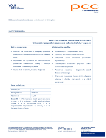 KARTA TECHNICZNA ROKO GOLD UNITER SANDAL WOOD RG-131US Uniwersalny preparat do czyszczenia na bazie alkoholu i terpenów Zakres stosowania: Właściwości produktu: Preparat Szybko wysycha i nie pozostawia smug do czyszczenia i pielęgnacji posadzek podłogowych i materiałów odpornych na działanie Zapobiega ponownemu osadzaniu brudu wody. Efektywnie Odpowiedni do czyszczenia np. zabezpieczonych powierzchni drewnianych, podłóg z tworzyw sztucznych, ram okiennych, płytek. Usuwa ślady po ołówku, mazaku, długopisie. usuwa zbrudzenia pochodzenia organicznego Systematyczne stosowanie preparatu ułatwia usuwanie zanieczyszczeń Pozostawia przyjemny i długotrwały zapach drzewa sandałowego Z łatwością rozpuszcza tłuszcz dzięki połączeniu alkoholu i olejków eterycznych z e skórek pomarańczy Dane techniczne: Wartość pH 7,0 Kolor produktu Niebieski Pojemność 1 L, 5L Składniki: < 5 % niejonowe środki powierzchniowo czynne, < 5 % anionowe środki powierzchniowo czynne, < 5 % Tetrasodium EDTA, < 5 % rozpuszczalniki rozpuszczalne w wodzie, < 5 % kompozycja zapachowa. Zastosowanie i dozowanie Ostrzeżenia i postępowanie Postępowanie: Chronić przed dziećmi. W przypadku zanieczyszczenia oczu natychmiast przemyć dużą Do czyszczenia i pielęgnacji posadzek podłogowych i materiałów odpornych na działanie wody. ilością wody. Szczegółowe informacje znajdują się w karcie charakterystyki preparatu ROKO GOLD UNITER SA NDAL WOOD RG-131 US Mycie ręczne: stosowanie bieżące 40 ml/10 L wody Zalecenia Preparat do zastosowań profesjonalnych. Zawsze używać zimnej wody. Mycie ręczne: stosowanie bieżące 40 ml/10 L wody * dozowanie w zależności od stopnia zabrudzenia Informacje zawarte w niniejszej karcie technicznej podane są w dobrej wierze, w oparciu o aktualną wiedzę, doświadczenie wyniki badań. Zgodność parametrów dostarczonego wyrobu z niniejszą karta techniczną oraz przydatność wyrobu do zamierzonego zastosowania powinny być sprawdzone przed jego użyciem. Zastrzega się prawo wprowadzenie zmian do niniejszej karty technicznej będących skutkiem postępu.