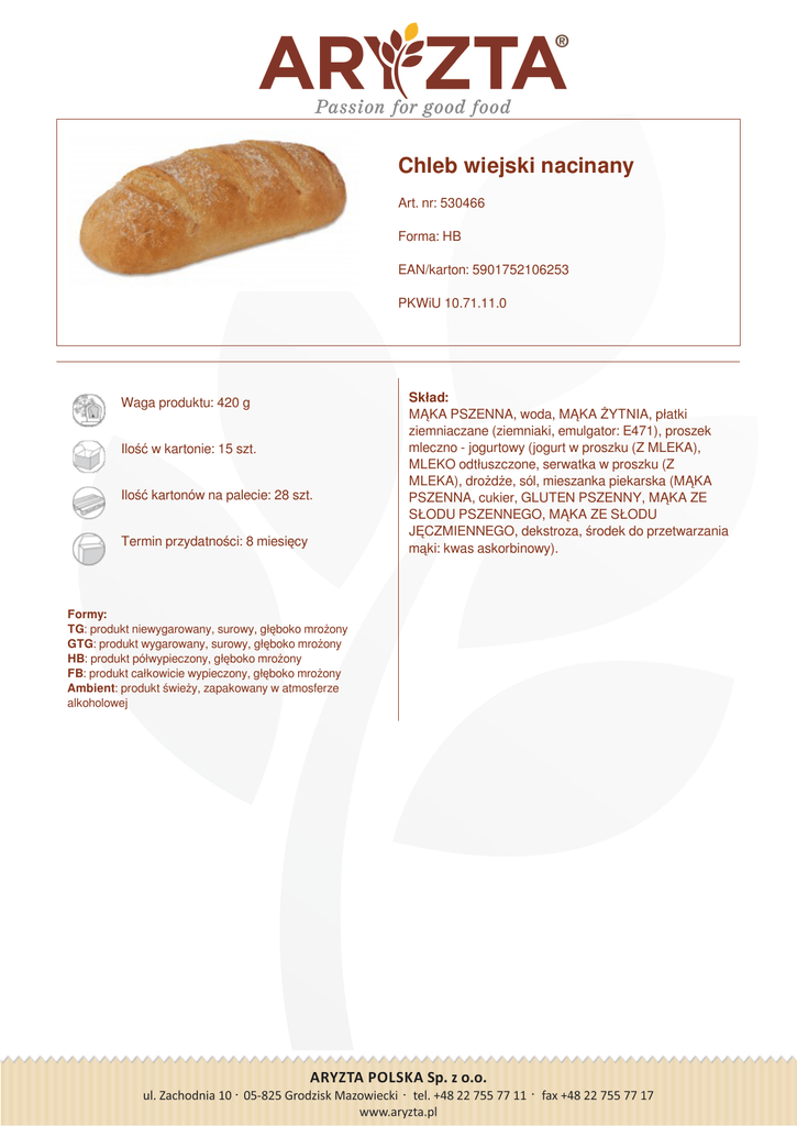 Chleb wiejski nacinany Art. nr: 530466 Forma: HB EAN/karton: 5901752106253 PKWiU 10.71.11.0 Waga produktu: 420 g Ilość w kartonie: 15 szt. Ilość kartonów na palecie: 28 szt. Termin przydatności: 8 miesięcy Formy: TG: produkt niewygarowany, surowy, głęboko mrożony GTG: produkt wygarowany, surowy, głęboko mrożony HB: produkt półwypieczony, głęboko mrożony FB: produkt całkowicie wypieczony, głęboko mrożony Ambient: produkt świeży, zapakowany w atmosferze alkoholowej Powered by TCPDF (www.tcpdf.org) Skład: MĄKA PSZENNA, woda, MĄKA ŻYTNIA, płatki ziemniaczane (ziemniaki, emulgator: E471), proszek mleczno - jogurtowy (jogurt w proszku (Z MLEKA), MLEKO odtłuszczone, serwatka w proszku (Z MLEKA), drożdże, sól, mieszanka piekarska (MĄKA PSZENNA, cukier, GLUTEN PSZENNY, MĄKA ZE SŁODU PSZENNEGO, MĄKA ZE SŁODU JĘCZMIENNEGO, dekstroza, środek do przetwarzania mąki: kwas askorbinowy).
