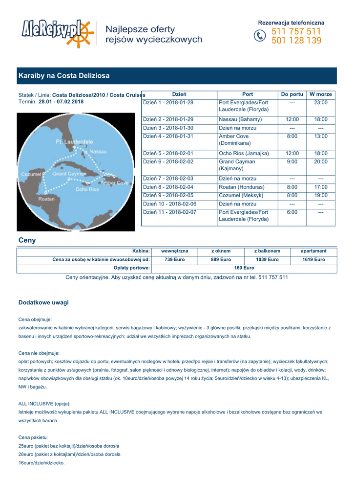 Karaiby na Costa Deliziosa Dzień Statek / Linia: Costa Deliziosa/2010 / Costa Cruises Termin: 28.01 - 07.02.2018 Dzień 1 - 2018-01-28 Port Do portu W morze --- 23:00 12:00 18:00 --- --- Port Everglades/Fort Lauderdale (Floryda) Dzień 2 - 2018-01-29 Nassau (Bahamy) Dzień 3 - 2018-01-30 Dzień na morzu Dzień 4 - 2018-01-31 Amber Cove (Dominikana) 8:00 13:00 Dzień 5 - 2018-02-01 Ocho Rios (Jamajka) 12:00 18:00 Dzień 6 - 2018-02-02 Grand Cayman (Kajmany) 9:00 20:00 Dzień 7 - 2018-02-03 Dzień na morzu --- --- Dzień 8 - 2018-02-04 Roatan (Honduras) 8:00 17:00 Dzień 9 - 2018-02-05 Cozumel (Meksyk) 8:00 19:00 Dzień 10 - 2018-02-06 Dzień na morzu --- --- Dzień 11 - 2018-02-07 Port Everglades/Fort Lauderdale (Floryda) 6:00 --- Ceny Kabina: Cena za osobę w kabinie dwuosobowej od: Opłaty portowe: wewnętrzna z oknem z balkonem apartament 739 Euro 889 Euro 1039 Euro 1619 Euro 160 Euro Ceny orientacyjne. Aby uzyskać cenę aktualną w danym dniu, zadzwoń na nr tel. 511 757 511 Dodatkowe uwagi Cena obejmuje: zakwaterowanie w kabinie wybranej kategorii; serwis bagażowy i kabinowy; wyżywienie - 3 główne posiłki; przekąski między posiłkami; korzystanie z basenu i innych urządzeń sportowo-rekreacyjnych; udział we wszystkich imprezach organizowanych na statku. Cena nie obejmuje: opłat portowych; kosztów dojazdu do portu; ewentualnych noclegów w hotelu przed/po rejsie i transferów (na zapytanie); wycieczek fakultatywnych; korzystania z punktów usługowych (pralnia, fotograf, salon piękności i odnowy biologicznej, internet); napojów do obiadów i kolacji, wody, drinków; napiwków obowiązkowych dla obsługi statku (ok. 10euro/dzień/osoba powyżej 14 roku życia; 5euro/dzień/dziecko w wieku 4-13); ubezpieczenia KL, NW i bagażu. ALL INCLUSIVE (opcja): Istnieje możliwość wykupienia pakietu ALL INCLUSIVE obejmującego wybrane napoje alkoholowe i bezalkoholowe dostępne bez ograniczeń we wszystkich barach. Cena pakietu: 25euro (pakiet bez koktajli)/dzień/osoba dorosła 28euro (pakiet z koktajlami)/dzień/osoba dorosła 16euro/dzień/dziecko. Warunkiem skorzystania z pakietu all inclusive jest wykupienie pakietu przez wszystkich pasażerów w kabinie na czas całego rejsu. Dla Rejsów trwających mniej niż 7 dni nie ma możliwości wykupienia pakietu all inclisive. Linia Costa Cruises proponuje pakiety winno-piwne, pakiety wodne (szczegóły u Konsultanta). Uwagi: Kabiny 3/4 osobowe nie są dostępne we wszystkich kategoriach, a ich liczba jest ograniczona - sprzedaż tylko po potwierdzeniu; ceny wycieczek fakultatywnych, propozycje dojazdu do portu, hoteli przed/po rejsie na zapytanie. Na pokładzie statku obowiązuje bezgotówkowy system opłat. Należność reguluje się ostatniego dnia rejsu gotówką (wpłata depozytu ok. 250euro/kabina pierwszego dnia rejsu) lub kartą kredytową (VISA, Mastercard, American Express) na podstawie zbiorczego rachunku. Karty kredytowe należy zarejestrować zaraz po zaokrętowaniu. Costa Deliziosa/2010 Costa Deliziosa Rok budowy 2010 Tonaż: 92.700 ton Do dyspozycji: 4 restauracje, 11 barów, 2 baseny, 4 jacuzzi, basen dla dzieci, telebim - olbrzymi ekran do projekcji filmów, teatr, kasyno, dyskoteki, kino 4D, pokój cygar, klub zabaw dla dzieci, salon gier wirtualnych, symulator Grand Prix, boisko sportowe, trasa do joggingu, symulator do gry w golfa, boisko do mini-golfa, tor jazdy na wrotkach, centrum fitness, salon piękności, fryzjer, centrum odnowy bilogicznej (sauna, masaże), sklepy wolnocłowe, biblioteka, kafejka internetowa, kapliczka, sala konferencyjna. Kabiny: łazienka (prysznic, wc, suszarka), klimatyzacja, radio pokładowe, telefon do użytku wewnętrznego, sejf, mini bar, TV (ok. 14 m2). W wielu kabinach 2 pojedyncze łóżka mogą być na zmówienie połączone w 1 podwójne. Kabiny typu suite podzielone są na część sypialną i dzienną (ok. 22m2). Costa Deliziosa to niepowtarzalny diament linii żeglugowej Costa. Czysta sztuka, kształt i piękno reprezentują najnowocześniejszy projekt w najbardziej spektakularnej postaci. Costa Deliziosa lśni od przepięknego oświetlenia oraz bogatych zdobień. Niektóre elementy na pokładzie statku zostały wykonane z wysokiej jakości szkła, sprowadzonego prosto z wyspy Murano. Najwyższej jakości marmury, granity i szlachetna stal, użyte przy wykończeniu wnętrz, doskonale podkreślają urok statku. Majestatyczna rzeźba "Sfera" wykonana przez włoskiego artystę Arnaldo Pomodoro przywita w atrium gości przybywających z najróżniejszych stron świata. Oprócz otaczającego luksusu, na statku Costa Deliziosa można odnaleźć wiele atrakcji, które zapewnią relaks i dobrą zabawę. Dzięki wykorzystaniu najnowszych technologii uczestnicy rejsu mogą spęczać czas na odbieraniu bardzo realistycznych wrażeń podczas filmów w kinie 4D. Aby poczuć emocje w trakcie wyścigu formuły 1, wystarczy wsiąść do symulatora Grand Prix i rozpocząć niezapomniany wyścig. Po licznych doznaniach czas na smakołyki przygotowane przez znanych szefów kuchni, którzy zapraszają na różnorodne dania w restauracjach i bufetach.