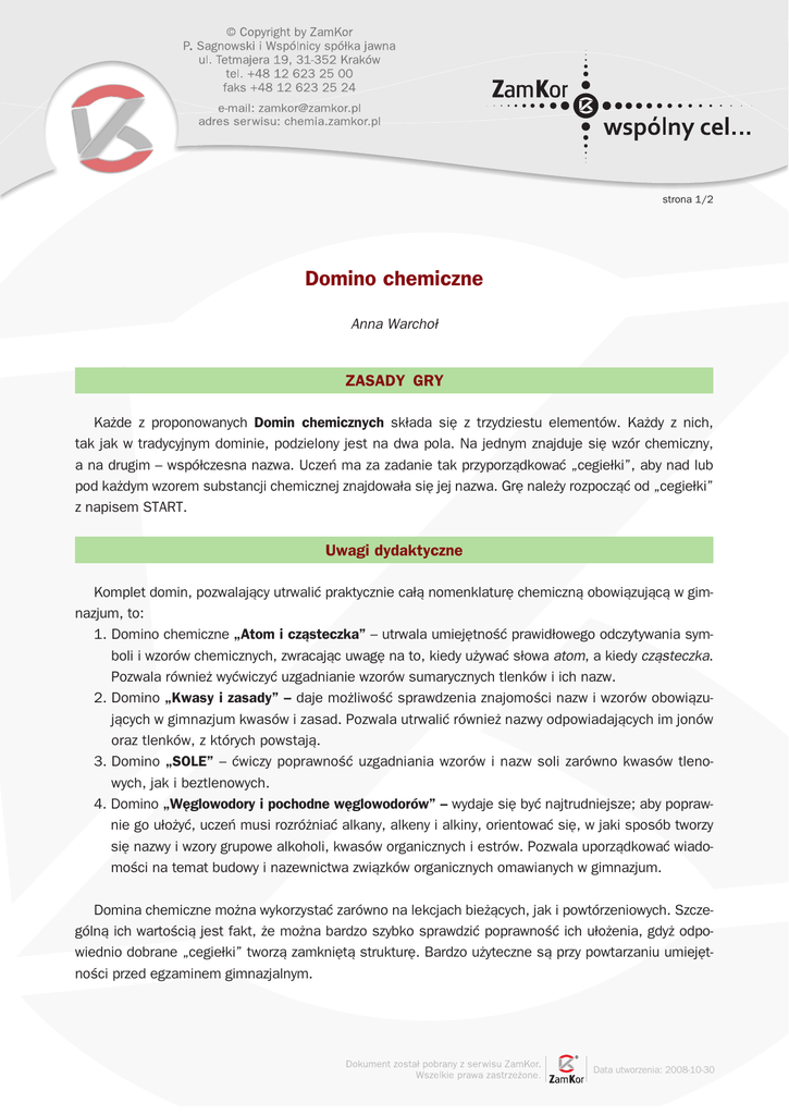 strona 1/2 Domino chemiczne Anna Warchoł ZASADY GRY Każde z proponowanych Domin chemicznych składa się z trzydziestu elementów. Każdy z nich, tak jak w tradycyjnym dominie, podzielony jest na dwa pola. Na jednym znajduje się wzór chemiczny, a na drugim – współczesna nazwa. Uczeń ma za zadanie tak przyporządkować „cegiełki”, aby nad lub pod każdym wzorem substancji chemicznej znajdowała się jej nazwa. Grę należy rozpocząć od „cegiełki” z napisem START. Uwagi dydaktyczne Komplet domin, pozwalający utrwalić praktycznie całą nomenklaturę chemiczną obowiązującą w gimnazjum, to: 1. Domino chemiczne „Atom i cząsteczka” – utrwala umiejętność prawidłowego odczytywania symboli i wzorów chemicznych, zwracając uwagę na to, kiedy używać słowa atom, a kiedy cząsteczka. Pozwala również wyćwiczyć uzgadnianie wzorów sumarycznych tlenków i ich nazw. 2. Domino „Kwasy i zasady” – daje możliwość sprawdzenia znajomości nazw i wzorów obowiązujących w gimnazjum kwasów i zasad. Pozwala utrwalić również nazwy odpowiadających im jonów oraz tlenków, z których powstają. 3. Domino „SOLE” – ćwiczy poprawność uzgadniania wzorów i nazw soli zarówno kwasów tlenowych, jak i beztlenowych. 4. Domino „Węglowodory i pochodne węglowodorów” – wydaje się być najtrudniejsze; aby poprawnie go ułożyć, uczeń musi rozróżniać alkany, alkeny i alkiny, orientować się, w jaki sposób tworzy się nazwy i wzory grupowe alkoholi, kwasów organicznych i estrów. Pozwala uporządkować wiadomości na temat budowy i nazewnictwa związków organicznych omawianych w gimnazjum. Domina chemiczne można wykorzystać zarówno na lekcjach bieżących, jak i powtórzeniowych. Szczególną ich wartością jest fakt, że można bardzo szybko sprawdzić poprawność ich ułożenia, gdyż odpowiednio dobrane „cegiełki” tworzą zamkniętą strukturę. Bardzo użyteczne są przy powtarzaniu umiejętności przed egzaminem gimnazjalnym. Data utworzenia: 2008-10-30 strona 2/2 Przykładowe elementy CH4 C5H8 kwas etanowy metan START Wszystkie zaproponowane gry można wykorzystać, realizując dowolny program nauczania chemii w gimnazjum oraz stosowny do tego programu podręcznik. Wszystkie zaproponowane gry uzyskały pozytywne recenzje ministerialnych recenzentów i zostały wpisane na listę środków dydaktycznych zalecanych przez Ministerstwo Edukacji Narodowej. Data utworzenia: 2008-10-30