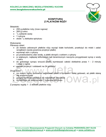 KOLEKCJA SMACZNEJ BEZGLUTENOWEJ KUCHNI www.bezglutenowakuchnia.pl KONFITURA Z PLATKÓW RÓŻY Składniki: 250 g płatków roży (rosa rugosa) 300 g cukru 1/2 szklanki wody 1 cytryna około 1/2 kieliszka spirytusu Wykonanie: Pierwszy dzień ze świeżo zebranych płatków róży wyciąć białe końcówki, przełożyć do miski i zalać wrzątkiem (woda powinna przykryć płatki) wycisnąć sok z cytryny po przestudzeniu zlać wodę, a płatki skropić z sokiem z cytryny w większym, najlepiej teflonowym lub ceramicznym naczyniu przygotować syrop z wody i cukru do gotowego syropu wrzucić płatki, wymieszać całość dokładnie przez 1 - 2 minuty i zdjąć z ognia garnek przykryć i odstawić na 24 godziny Drugi dzień na małym ogniu ponownie zagotować płatki z syropem i dalej gotować, aż płatki staną się przezroczyste gorącą konfiturę przełożyć do niewielkich słoiczków do każdego ze słoików wlać 1 łyżeczkę spirytusu Z przepisu wyjdą 1 - 2 słoiczki płatków róży. Serwis prowadzi Stowarzyszenie Przyjaciół Chorych na Celiakię PRZEKREŚLONY KŁOS www.dietabezglutenowa.pl ● www.produktbezglutenowy.pl ● www.celiakia.eu