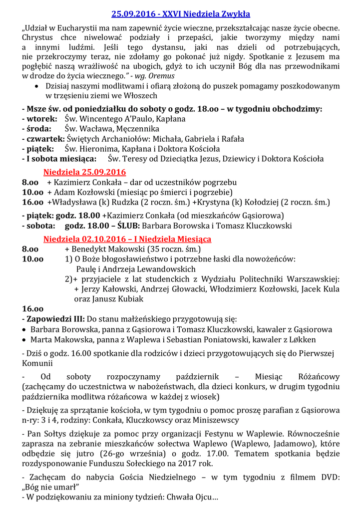 25.09.2016 - XXVI Niedziela Zwykła „Udział w Eucharystii ma nam zapewnić życie wieczne, przekształcając nasze życie obecne. Chrystus chce niwelować podziały i przepaści, jakie tworzymy między nami a innymi ludźmi. Jeśli tego dystansu, jaki nas dzieli od potrzebujących, nie przekroczymy teraz, nie zdołamy go pokonać już nigdy. Spotkanie z Jezusem ma pogłębić naszą wrażliwość na ubogich, gdyż to ich uczynił Bóg dla nas przewodnikami w drodze do życia wiecznego.” - wg. Oremus Dzisiaj naszymi modlitwami i ofiarą złożoną do puszek pomagamy poszkodowanym w trzęsieniu ziemi we Włoszech - Msze św. od poniedziałku do soboty o godz. 18.oo – w tygodniu obchodzimy: - wtorek: Św. Wincentego A’Paulo, Kapłana - środa: Św. Wacława, Męczennika - czwartek: Świętych Archaniołów: Michała, Gabriela i Rafała - piątek: Św. Hieronima, Kapłana i Doktora Kościoła - I sobota miesiąca: Św. Teresy od Dzieciątka Jezus, Dziewicy i Doktora Kościoła Niedziela 25.09.2016 8.oo + Kazimierz Conkała – dar od uczestników pogrzebu 10.oo + Adam Kozłowski (miesiąc po śmierci i pogrzebie) 16.oo +Władysława (k) Rudzka (2 roczn. śm.) +Krystyna (k) Kołodziej (2 roczn. śm.) - piątek: godz. 18.00 +Kazimierz Conkała (od mieszkańców Gąsiorowa) - sobota: godz. 18.00 – ŚLUB: Barbara Borowska i Tomasz Kluczkowski Niedziela 02.10.2016 – I Niedziela Miesiąca 8.oo + Benedykt Makowski (35 roczn. śm.) 10.oo 1) O Boże błogosławieństwo i potrzebne łaski dla nowożeńców: Paulę i Andrzeja Lewandowskich 2)+ przyjaciele z lat studenckich z Wydziału Politechniki Warszawskiej: + Jerzy Kałowski, Andrzej Głowacki, Włodzimierz Kozłowski, Jacek Kula oraz Janusz Kubiak 16.oo - Zapowiedzi III: Do stanu małżeńskiego przygotowują się: Barbara Borowska, panna z Gąsiorowa i Tomasz Kluczkowski, kawaler z Gąsiorowa Marta Makowska, panna z Waplewa i Sebastian Poniatowski, kawaler z LØkken - Dziś o godz. 16.00 spotkanie dla rodziców i dzieci przygotowujących się do Pierwszej Komunii Od soboty rozpoczynamy październik – Miesiąc Różańcowy (zachęcamy do uczestnictwa w nabożeństwach, dla dzieci konkurs, w drugim tygodniu października modlitwa różańcowa w każdej z wiosek) - Dziękuję za sprzątanie kościoła, w tym tygodniu o pomoc proszę parafian z Gąsiorowa n-ry: 3 i 4, rodziny: Conkała, Kluczkowscy oraz Miniszewscy - Pan Sołtys dziękuje za pomoc przy organizacji Festynu w Waplewie. Równocześnie zaprasza na zebranie mieszkańców sołectwa Waplewo (Waplewo, Jadamowo), które odbędzie się jutro (26-go września) o godz. 17.00. Tematem spotkania będzie rozdysponowanie Funduszu Sołeckiego na 2017 rok. - Zachęcam do nabycia Gościa Niedzielnego – w tym tygodniu z filmem DVD: „Bóg nie umarł” - W podziękowaniu za miniony tydzień: Chwała Ojcu…