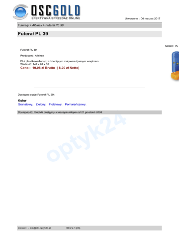 Utworzono : 06 marzec 2017 Futerały > Albinex > Futerał PL 39 Futerał PL 39 Model : PL Futerał PL 39 Producent : Albinex Etui plastikowe z dziecięcym motywem i jasnym wnętrzem. Wielkość: 147 x 61 x 33 Cena : 10,08 zł Brutto ( 8,20 zł Netto) Dostępne opcje Futerał PL 39 : Kolor Granatowy, Zielony, Fioletowy, Pomarańczowy. 4 2 Dostępność: Produkt dostępny w naszym sklepie od 21 grudzień 2006 k y t p o kontakt : - [email protected] Strona 1/{nb}