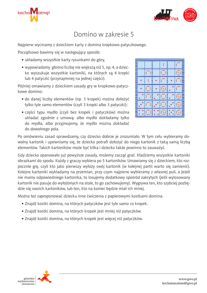 kocha atmę! Domino w zakresie 5 Najpierw wycinamy z dzieckiem karty z domina kropkowo-patyczkowego. Początkowo bawimy się w następujący sposób: • układamy wszystkie karty rysunkami do góry, • wypowiadamy głośno liczbę nie większą niż 5, np. 4, a dziecko wyszukuje wszystkie kartoniki, na których są 4 kropki lub 4 patyczki (przynajmniej na jednej części). Później omawiamy z dzieckiem zasady gry w kropkowo-patyczkowe domino: • do danej liczby elementów (np. 3 kropek) można dołożyć tylko tyle samo elementów (czyli 3 kropki albo 3 patyczki); • części typu mydło (czyli bez kropek i patyczków) można układać zgodnie z umową: albo mydło dokładamy tylko do mydła, albo przyjmujemy, że mydło można dokładać do dowolnego pola. Po omówieniu zasad sprawdzamy, czy dziecko dobrze je zrozumiało. W tym celu wybieramy dowolny kartonik i upewniamy się, że dziecko potrafi dołożyć do niego kartonik z taką samą liczbą elementów. Takich kartoników może być kilka i dziecko także powinno to zauważyć. Gdy dziecko opanowało już powyższe zasady, możemy zacząć grać. Kładziemy wszystkie kartoniki obrazkami do spodu. Każdy z graczy wybiera po 5 kartoników. Umawiamy się z dzieckiem, kto rozpocznie grę, czyli kto jako pierwszy wyłoży swój kartonik (w kolejnej partii warto się zamienić). Kolejne kartoniki wykładamy na przemian, przy czym najpierw wybieramy z własnej puli, a jeżeli nie mamy odpowiedniego kartonika, to losujemy dodatkowy spośród zakrytych (jeśli wylosowany kartonik nie pasuje do wyłożonych na stole, to go zachowujemy). Wygrywa ten, kto szybciej pozbędzie się swoich kartoników, lub ten, kto na koniec będzie miał ich mniej. Można też zaproponować dziecku inne ćwiczenia z papierowymi kostkami domina: • Znajdź kostki domina, na których patyczków jest tyle samo co kropek. • Znajdź kostki domina, na których kropek jest mniej niż patyczków. • Znajdź kostki domina, na których kropek jest więcej niż patyczków. www.gwo.pl [email protected]