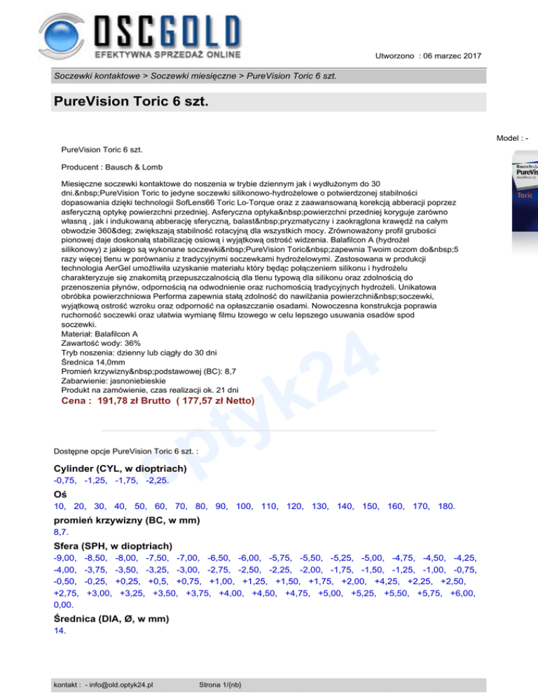 Utworzono : 06 marzec 2017 Soczewki kontaktowe > Soczewki miesięczne > PureVision Toric 6 szt. PureVision Toric 6 szt. Model : PureVision Toric 6 szt. Producent : Bausch & Lomb Miesięczne soczewki kontaktowe do noszenia w trybie dziennym jak i wydłużonym do 30 dni. PureVision Toric to jedyne soczewki silikonowo-hydrożelowe o potwierdzonej stabilności dopasowania dzięki technologii SofLens66 Toric Lo-Torque oraz z zaawansowaną korekcją abberacji poprzez asferyczną optykę powierzchni przedniej. Asferyczna optyka powierzchni przedniej koryguje zarówno własną , jak i indukowaną abberację sferyczną, balast pryzmatyczny i zaokrąglona krawędź na całym obwodzie 360° zwiększają stabilność rotacyjną dla wszystkich mocy. Zrównoważony profil grubości pionowej daje doskonałą stabilizację osiową i wyjątkową ostrość widzenia. Balafilcon A (hydrożel silikonowy) z jakiego są wykonane soczewki PureVision Toric zapewnia Twoim oczom do 5 razy więcej tlenu w porównaniu z tradycyjnymi soczewkami hydrożelowymi. Zastosowana w produkcji technologia AerGel umożliwiła uzyskanie materiału który będąc połączeniem silikonu i hydrożelu charakteryzuje się znakomitą przepuszczalnością dla tlenu typową dla silikonu oraz zdolnością do przenoszenia płynów, odpornością na odwodnienie oraz ruchomością tradycyjnych hydrożeli. Unikatowa obróbka powierzchniowa Performa zapewnia stałą zdolność do nawilżania powierzchni soczewki, wyjątkową ostrość wzroku oraz odporność na opłaszczanie osadami. Nowoczesna konstrukcja poprawia ruchomość soczewki oraz ułatwia wymianę filmu łzowego w celu lepszego usuwania osadów spod soczewki. Materiał: Balafilcon A Zawartość wody: 36% Tryb noszenia: dzienny lub ciągły do 30 dni Średnica 14,0mm Promień krzywizny podstawowej (BC): 8,7 Zabarwienie: jasnoniebieskie Produkt na zamówienie, czas realizacji ok. 21 dni 4 2 k y t p o Cena : 191,78 zł Brutto ( 177,57 zł Netto) Dostępne opcje PureVision Toric 6 szt. : Cylinder (CYL, w dioptriach) -0,75, -1,25, -1,75, -2,25. Oś 10, 20, 30, 40, 50, 60, 70, 80, 90, 100, 110, 120, 130, 140, 150, 160, 170, 180. promień krzywizny (BC, w mm) 8,7. Sfera (SPH, w dioptriach) -9,00, -4,00, -0,50, +2,75, 0,00. -8,50, -3,75, -0,25, +3,00, -8,00, -7,50, -7,00, -6,50, -6,00, -5,75, -5,50, -5,25, -5,00, -4,75, -4,50, -4,25, -3,50, -3,25, -3,00, -2,75, -2,50, -2,25, -2,00, -1,75, -1,50, -1,25, -1,00, -0,75, +0,25, +0,5, +0,75, +1,00, +1,25, +1,50, +1,75, +2,00, +4,25, +2,25, +2,50, +3,25, +3,50, +3,75, +4,00, +4,50, +4,75, +5,00, +5,25, +5,50, +5,75, +6,00, Średnica (DIA, Ø, w mm) 14. kontakt : - [email protected] Strona 1/{nb} Utworzono : 06 marzec 2017 Soczewki kontaktowe > Soczewki miesięczne > PureVision Toric 6 szt. PureVision Toric 6 szt. Dostępność: Produkt dostępny w naszym sklepie od 17 kwiecień 2007 4 2 k y t p o kontakt : - [email protected] Strona 2/{nb}