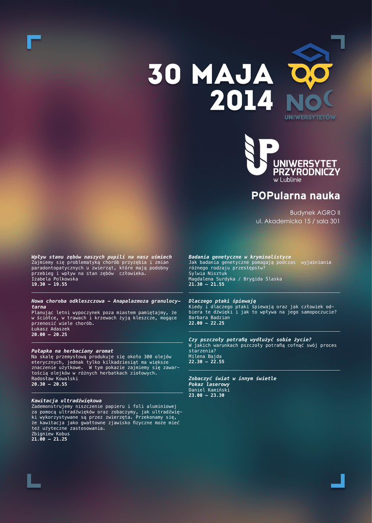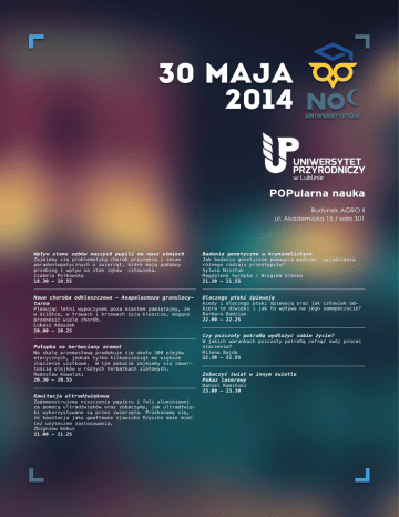 POPularna nauka Budynek AGRO II ul. Akademicka 15 / sala 301 Wpływ stanu zębów naszych pupili na nasz uśmiech Badania genetyczne w kryminalistyce Nowa choroba odkleszczowa - Anapalazmoza granulocytarna Dlaczego ptaki śpiewają Zajmiemy się problematyką chorób przyzębia i zmian paradontopatycznych u zwierząt, które mają podobny przebieg i wpływ na stan zębów człowieka. Izabela Polkowska 19.30 - 19.55 Planując letni wypoczynek poza miastem pamiętajmy, że w ściółce, w trawach i krzewach żyją kleszcze, mogące przenosić wiele chorób. Łukasz Adaszek 20.00 – 20.25 Pułapka na herbaciany aromat Na skalę przemysłową produkuje się około 300 olejów eterycznych, jednak tylko kilkadziesiąt ma większe znaczenie użytkowe. W tym pokazie zajmiemy się zawartością olejków w różnych herbatkach ziołowych. Radosław Kowalski 20.30 – 20.55 Kawitacja ultradźwiękowa Zademonstrujemy niszczenie papieru i foli aluminiowej za pomocą ultradźwięków oraz zobaczymy, jak ultradźwięki wykorzystywane są przez zwierzęta. Przekonamy się, że kawitacja jako gwałtowne zjawisko fizyczne może mieć też użyteczne zastosowania. Zbigniew Kobus 21.00 – 21.25 Jak badania genetyczne pomagają podczas różnego rodzaju przestępstw? Sylwia Nisztuk Magdalena Surdyka / Brygida Ślaska 21.30 – 21.55 wyjaśniania Kiedy i dlaczego ptaki śpiewają oraz jak człowiek odbiera te dźwięki i jak to wpływa na jego samopoczucie? Barbara Badzian 22.00 – 22.25 Czy pszczoły potrafią wydłużyć sobie życie? W jakich warunkach pszczoły potrafią cofnąć swój proces starzenia? Milena Bajda 22.30 – 22.55 Zobaczyć świat w innym świetle Pokaz laserowy Daniel Kamiński 23.00 – 23.30