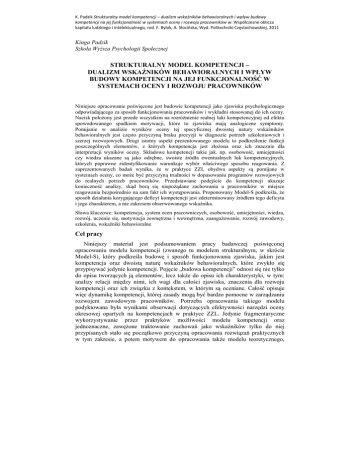 K. Padzik Strukturalny model kompetencji – dualizm wskaźników behawioralnych i wpływ budowy kompetencji na jej funkcjonalność w systemach oceny i rozwoju pracowników w: Współczesne oblicza kapitału ludzkiego i intelektualnego, red. F. Bylok, A. Słocińska, Wyd. Politechniki Częstochowskiej, 2011 Kinga Padzik Szkoła Wyższa Psychologii Społecznej STRUKTURALNY MODEL KOMPETENCJI – DUALIZM WSKAŹNIKÓW BEHAWIORALNYCH I WPŁYW BUDOWY KOMPETENCJI NA JEJ FUNKCJONALNOŚĆ W SYSTEMACH OCENY I ROZWOJU PRACOWNIKÓW Niniejsze opracowanie poświęcone jest budowie kompetencji jako zjawiska psychologicznego odpowiadającego za sposób funkcjonowania pracowników i wykładni stosowanej do ich oceny. Nacisk położony jest przede wszystkim na rozróżnienie realnej luki kompetencyjnej od efektu spowodowanego spadkiem motywacji, które to zjawiska mają analogiczne symptomy. Pomijanie w analizie wyników oceny tej specyficznej dwoistej natury wskaźników behawioralnych jest często przyczyną braku precyzji w diagnozie potrzeb szkoleniowych i szerzej rozwojowych. Drugi istotny aspekt prezentowanego modelu to podkreślenie funkcji poszczególnych elementów, z których kompetencja jest złożona oraz ich znacznie dla interpretacji wyników oceny. Składowe kompetencji takie jak. np. osobowość, umiejętności czy wiedza ukazane są jako odrębne, swoiste źródła ewentualnych luk kompetencyjnych, których poprawne zidentyfikowanie warunkuje wybór właściwego sposobu reagowania. Z zaprezentowanych badań wynika, że w praktyce ZZL obydwa aspekty są pomijane w systemach oceny, co może być przyczyną trudności w dopasowaniu programów rozwojowych do realnych potrzeb pracowników. Przedstawiane podejście do kompetencji ukazuje konieczność analizy, skąd borą się niepożądane zachowania u pracowników w miejsce reagowania bezpośrednio na sam fakt ich występowania. Proponowany Model-S podkreśla, że sposób działania korygującego deficyt kompetencji jest zdeterminowany źródłem tego deficytu i jego charakterem, a nie zakresem obserwowanego wskaźnika. Słowa kluczowe: kompetencja, system ocen pracowniczych, osobowość, umiejętności, wiedza, rozwój, uczenie się, motywacja zewnętrzna i wewnętrzna, zaangażowanie, rozwój zawodowy, szkolenia, wskaźniki behawioralne Cel pracy Niniejszy materiał jest podsumowaniem pracy badawczej poświęconej opracowaniu modelu kompetencji (zwanego tu modelem strukturalnym, w skrócie Model-S), który podkreśla budowę i sposób funkcjonowania zjawiska, jakim jest kompetencja oraz dwoistą naturę wskaźników behawioralnych, które zwykło się przypisywać jedynie kompetencji. Pojęcie „budowa kompetencji” odnosi się nie tylko do opisu tworzących ją elementów, lecz także do opisu ich charakterystyki, w tym: analizy relacji między nimi, ich wagi dla całości zjawiska, znaczenia dla rozwoju kompetencji oraz ich związku z kontekstem, w którym są oceniane. Całość opisuje więc dynamikę kompetencji, której zasady mogą być bardzo pomocne w zarządzaniu rozwojem zawodowym pracowników. Potrzeba opracowania takiego modelu podyktowana była wynikami obserwacji dotyczących efektywności narzędzi oceny okresowej opartych na kompetencjach w praktyce ZZL. Jedynie fragmentaryczne wykorzystywanie przez praktyków możliwości modelu kompetencji oraz jednoznaczne, zawężone traktowanie zachowań jako wskaźników tylko do niej przypisanych stało się początkowo przyczyną opracowania rozwiązań praktycznych w tym zakresie, a potem motywem do opracowania także modelu teoretycznego, K. Padzik Strukturalny model kompetencji – dualizm wskaźników behawioralnych i wpływ budowy kompetencji na jej funkcjonalność w systemach oceny i rozwoju pracowników w: Współczesne oblicza kapitału ludzkiego i intelektualnego, red. F. Bylok, A. Słocińska, Wyd. Politechniki Częstochowskiej, 2011 tłumaczącego zasady funkcjonowania kompetencji i tym samym wspierającego ich zastosowanie w okresowej ocenie pracowników oraz w systemach planowania rozwoju zawodowego. Proponowany model w znacznym stopniu wpisuje się w nurt koncepcji interpretacyjnych (fenomenografii), szczególnie w odniesieniu do diagnozy realnego poziomu kompetencji w ścisłej zależności od kontekstu pracy, jej rozumienia przez pracownika i jego stosunku do niej. Pierwsze założenie prezentowanego modelu odnosi się do sposobu wnioskowania o występowaniu luki kompetencyjnej. W ocenie okresowej o prezentowanym przez pracowników poziomie kompetencji wnioskuje się na podstawie obserwowanych u nich zachowań, sposobie postępowania. Nie ulega wątpliwości, że zaobserwowanie u pracownika wskaźników behawioralnych świadczących o pożądanym poziomie kompetencji jest wystarczające do stwierdzenia, że pracownik ten w ocenianym okresie prezentuje pożądany poziom danej kompetencji. Proces wnioskowania o luce kompetencyjnej przebiega analogicznie, czyli obserwowanie zachowań niepożądanych lub brak zachowań pożądanych (to zależy od przyjętej metodologii oceny) świadczy o występowaniu deficytów w kompetencji, do której odnoszą się dane wskaźniki. W świetle założeń Modelu-S nie jest to poprawne postępowanie. Fakt występowania zachowań niepożądanych lub brak zachowań pożądanych może mieć inną przyczynę niż luka kompetencyjna. Może być bowiem skutkiem obniżenia motywacji zewnętrznej, czyli pewnej bariery ograniczającej pracownikowi chęć do pełnego angażowania się w wykonywaną pracę. W takiej sytuacji efekt obserwowany jako luka kompetencyjna będzie w rzeczywistości kontrolowanym zablokowaniem pozytywnych zachowań. Przyczyny spadku zaangażowania mogą być bardzo różne i zależne od subiektywnego spostrzegania środowiska pracy przez ocenianego pracownika i stopnia rozumienia przez niego samej pracy i jej istoty. Bezpośrednie i jednoznaczne interpretowanie wskaźników negatywnych jako luki kompetencyjnej jest du