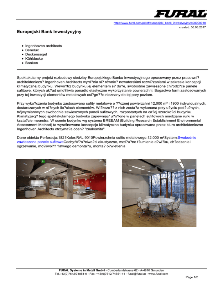 https:/www.fural.com/pl/ref/europejski_bank_inwestycyjny/a00000010 created: 06.03.2017 Europejski Bank Inwestycyjny Ingenhoven architects Benelux Deckensegel Kühldecke Banken Spektakularny projekt rozbudowy siedziby Europejskiego Banku Inwestycyjnego opracowany przez pracowni? architektoniczn? Ingenhoven Architects wyró?nia si? równie? nowatorskimi rozwi?zaniami w zakresie koncepcji klimatycznej budynku. Wewn?trz budynku jej elementem s? du?e, swobodnie zawieszone ch?odz?ce panele sufitowe, których uk?ad umo?liwia ponadto elastyczne wykorzystanie powierzchni. Bogactwo form zastosowanych przy tej inwestycji elementów metalowych osi?gn??o nieznany do tej pory poziom. Przy wyko?czeniu budynku zastosowano sufity metalowe o ??cznej powierzchni 12.000 m² i 1900 indywidualnych, dostarczanych w ró?nych ilo?ciach elementów. Wi?kszo?? z nich zosta?a wykonana przy u?yciu pod?u?nych, trójwymiarowych swobodnie zawieszonych paneli sufitowych, rozpostartych na ca?ej szeroko?ci budynku. Klimatyzacj? tego spektakularnego budynku zapewniaj? u?o?one w panelach sufitowych miedziane rurki w kszta?cie meandra. W ocenie budynku wg systemu BREEAM (Building Research Establishment Environmental Assessment Method) ta wyrafinowana koncepcja klimatyczna budynku opracowana przez biuro architektoniczne Ingenhoven Architects otrzyma?a ocen? "znakomita". Dane obiektu Perforacja:1821Kolor:RAL 9010Powierzchnia sufitu metalowego:12.000 m²System:Swobodnie zawieszone panele sufitoweCechy:W?a?ciwo?ci akustyczne, wzd?u?ne t?umienie d?wi?ku, ch?odzenie i ogrzewanie, mo?liwo?? ?atwego demonta?u, monta? o?wietlenia FURAL Systeme in Metall GmbH - Cumberlandstrasse 62 - A-4810 Gmunden Tel.: 43(0)7612/74851-0 - Fax: +43(0)7612/74851-11 - [email protected] - www.fural.com Page 1/2 FURAL Systeme in Metall GmbH - Cumberlandstrasse 62 - A-4810 Gmunden Tel.: 43(0)7612/74851-0 - Fax: +43(0)7612/74851-11 - [email protected] - www.fural.com Page 2/2