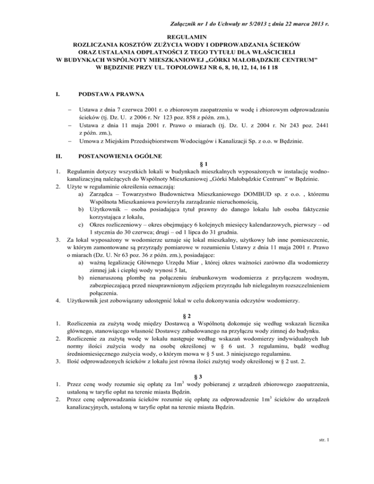 Załącznik nr 1 do Uchwały nr 5/2013 z dnia 22 marca 2013 r. REGULAMIN ROZLICZANIA KOSZTÓW ZUŻYCIA WODY I ODPROWADZANIA ŚCIEKÓW ORAZ USTALANIA ODPŁATNOŚCI Z TEGO TYTUŁU DLA WŁAŚCICIELI W BUDYNKACH WSPÓLNOTY MIESZKANIOWEJ „GÓRKI MAŁOBĄDZKIE CENTRUM” W BĘDZINIE PRZY UL. TOPOLOWEJ NR 6, 8, 10, 12, 14, 16 I 18 I. PODSTAWA PRAWNA II. 1. 2. 3. 4. 1. 2. 3. 1. 2. Ustawa z dnia 7 czerwca 2001 r. o zbiorowym zaopatrzeniu w wodę i zbiorowym odprowadzaniu ścieków (tj. Dz. U. z 2006 r. Nr 123 poz. 858 z późn. zm.), Ustawa z dnia 11 maja 2001 r. Prawo o miarach (tj. Dz. U. z 2004 r. Nr 243 poz. 2441 z późn. zm.), Umowa z Miejskim Przedsiębiorstwem Wodociągów i Kanalizacji Sp. z o.o. w Będzinie. POSTANOWIENIA OGÓLNE §1 Regulamin dotyczy wszystkich lokali w budynkach mieszkalnych wyposażonych w instalację wodnokanalizacyjną należących do Wspólnoty Mieszkaniowej „Górki Małobądzkie Centrum” w Będzinie. Użyte w regulaminie określenia oznaczają: a) Zarządca – Towarzystwo Budownictwa Mieszkaniowego DOMBUD sp. z o.o. , któremu Wspólnota Mieszkaniowa powierzyła zarządzanie nieruchomością, b) Użytkownik – osoba posiadająca tytuł prawny do danego lokalu lub osoba faktycznie korzystająca z lokalu, c) Okres rozliczeniowy – okres obejmujący 6 kolejnych miesięcy kalendarzowych, pierwszy – od 1 stycznia do 30 czerwca; drugi – od 1 lipca do 31 grudnia. Za lokal wyposażony w wodomierze uznaje się lokal mieszkalny, użytkowy lub inne pomieszczenie, w którym zamontowane są przyrządy pomiarowe w rozumieniu Ustawy z dnia 11 maja 2001 r. Prawo o miarach (Dz. U. Nr 63 poz. 36 z późn. zm.), posiadające: a) ważną legalizację Głównego Urzędu Miar , której okres ważności zarówno dla wodomierzy zimnej jak i ciepłej wody wynosi 5 lat, b) nienaruszoną plombę na połączeniu śrubunkowym wodomierza z przyłączem wodnym, zabezpieczającą przed nieuprawnionym zdjęciem przyrządu lub nielegalnym rozszczelnieniem połączenia. Użytkownik jest zobowiązany udostępnić lokal w celu dokonywania odczytów wodomierzy. §2 Rozliczenia za zużytą wodę między Dostawcą a Wspólnotą dokonuje się według wskazań licznika głównego, stanowiącego własność Dostawcy zabudowanego na przyłączu wody zimnej do budynku. Rozliczenie za zużytą wodę w lokalu następuje według wskazań wodomierzy indywidualnych lub normy ilości zużycia wody na osobę określonej w § 6 ust. 3 regulaminu, bądź według średniomiesięcznego zużycia wody, o którym mowa w § 5 ust. 3 niniejszego regulaminu. Ilość odprowadzonych ścieków z lokalu jest równa ilości zużytej wody określonej w § 2 ust. 2. §3 Przez cenę wody rozumie się opłatę za 1m3 wody pobieranej z urządzeń zbiorowego zaopatrzenia, ustaloną w taryfie opłat na terenie miasta Będzin. Przez cenę odprowadzania ścieków rozumie się opłatę za odprowadzenie 1m 3 ścieków do urządzeń kanalizacyjnych, ustaloną w taryfie opłat na terenie miasta Będzin. str. 1 Załącznik nr 1 do Uchwały nr 5/2013 z dnia 22 marca 2013 r. III. 1. 2. 3. 1. 2. 3. 1. 2. 3. 1. 2. 3. ZASADY ROZLICZANIA WODY ZUŻYTEJ W LOKALACH I ODPROWADZANIA ŚCIEKÓW §4 Odczyty wskazań wodomierzy wody zimnej w lokalach realizuje się w 6-miesięcznych okresach przez upoważnione przez Zarządcę osoby. Odczytów dokuje się z dokładnością do pełnych m3. W przypadkach, gdy zachodzi uzasadnione podejrzenie w związku z prawidłowością dokonanego odczytu bądź funkcjonowania wodomierza w lokalu, Zarządca może bez uprzedniego ustalania terminu z użytkownikiem dokonywać niezapowiedzianych odczytów i kontroli sprawności wodomierzy przez upoważnione przez Zarządcę osoby. §5 Rozliczenie zużycia wody zimnej i odprowadzania ścieków odbywa się dwa razy do roku: na koniec czerwca i na koniec grudnia każdego roku kalendarzowego i zostaje dokonane nie później niż w ciągu miesiąca od dokonanego odczytu. Pismo informujące o wysokości nadpłaty/niedopłaty zostaje dostarczone do skrzynki pocztowej Użytkownika. W przypadku niezawinionego przez Użytkownika uszkodzenia wodomierza, podstawą rozliczenia zużycia wody za okres między ostatnim odczytem wskazań, a wymianą przyrządu na nowy, będzie średniomiesięczne zużycie w poprzednim okresie rozliczeniowym. Rozliczenie zużycia wody w przypadku: a) nieudostępnienia lokalu do odczytu przez dwa kolejne okresy rozliczeniowe, b) utraty ważności cechy legalizacyjnej, o której mowa w § 1 ust. 3 pkt. a), przez wodomierz w lokalu, c) stwierdzenia zamierzonego działania Użytkownika w celu zafałszowania wskazań wodomierza, d) uszkodzenia plomby montażowej założonej na połączeniu wodomierza z przyłączem wody, za okres od ostatniego odczytu do dnia, w którym nastąpi ustanie przyczyny podanej wyżej, dokonane zostanie według przyjętej normy ilości zużycia wody. Norma zużycia dla lokali mieszkalnych wynosi 7 m3 miesięcznie na każdą osobę faktycznie zamieszkałą w lokalu, która po okresie rozliczeniowym może ulec zmianie. §6 Opłaty za wodę i odprowadzanie ścieków wraz z pozostałymi opłatami za używanie lokalu Użytkownik wnosi w formie miesięcznych zaliczek rozliczanych w okresach półrocznych. Wysokość miesięcznej zaliczki za wodę i odprowadzanie ścieków odpowiada iloczynowi przyjętej miesięcznej normy zużycia wody (3,5m3) i ilości osób faktycznie zamieszkujących w lokalu. Wysokość zaliczki – na pisemny wniosek Użytkownika – może ulec zwiększeniu bądź zmniejszeniu począwszy od miesiąca następującego po miesiącu, w którym nastąpiło złożenie wniosku. Normę zużycia wody w lokalach nieopomiarowanych (brak wodomierza) ustala Zarządca w wysokości 10m3. §7 Rozliczeniu podlegają rzeczywiste koszty poniesione w nieruchomości w danym okresie rozliczeniowym, stanowiące sumę kwot z faktur wystawionych przez dostawców za dostawy wody i za odprowadzanie ścieków wraz z należnymi opłatami a