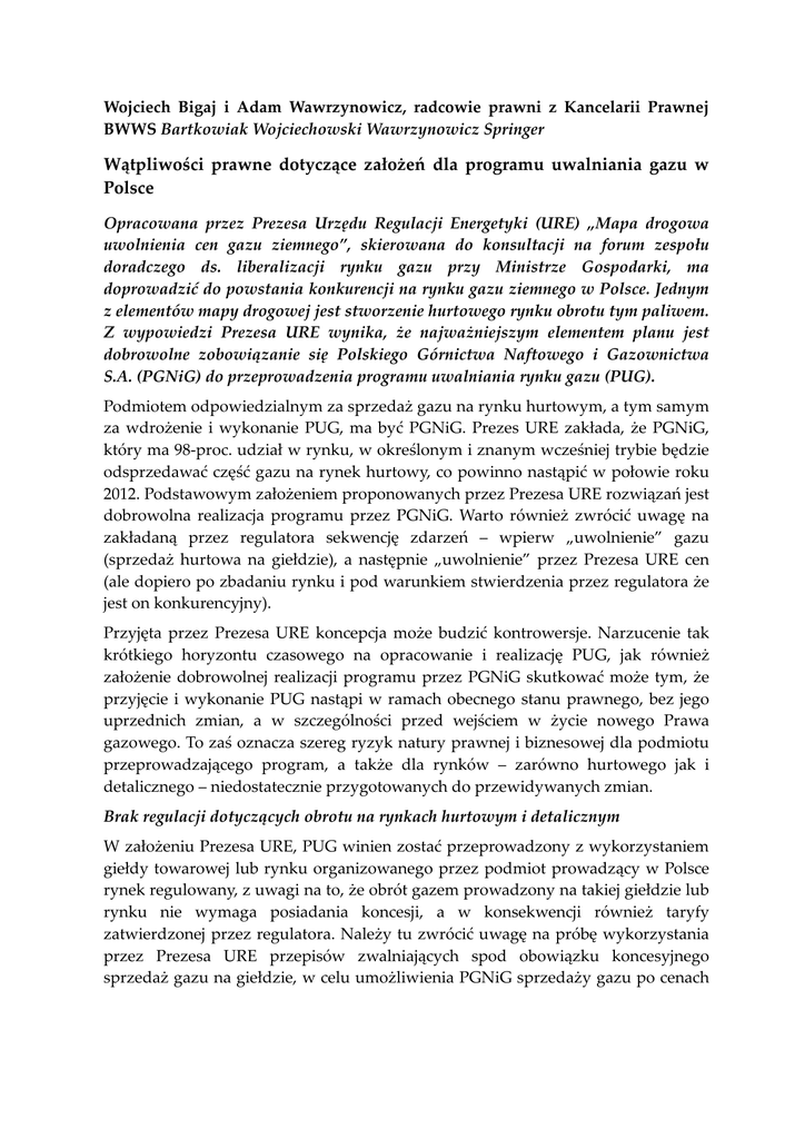 Wojciech Bigaj i Adam Wawrzynowicz, radcowie prawni z Kancelarii Prawnej BWWS Bartkowiak Wojciechowski Wawrzynowicz Springer Wątpliwości prawne dotyczące założeń dla programu uwalniania gazu w Polsce Opracowana przez Prezesa Urzędu Regulacji Energetyki (URE) „Mapa drogowa uwolnienia cen gazu ziemnego”, skierowana do konsultacji na forum zespołu doradczego ds. liberalizacji rynku gazu przy Ministrze Gospodarki, ma doprowadzić do powstania konkurencji na rynku gazu ziemnego w Polsce. Jednym z elementów mapy drogowej jest stworzenie hurtowego rynku obrotu tym paliwem. Z wypowiedzi Prezesa URE wynika, że najważniejszym elementem planu jest dobrowolne zobowiązanie się Polskiego Górnictwa Naftowego i Gazownictwa S.A. (PGNiG) do przeprowadzenia programu uwalniania rynku gazu (PUG). Podmiotem odpowiedzialnym za sprzedaż gazu na rynku hurtowym, a tym samym za wdrożenie i wykonanie PUG, ma być PGNiG. Prezes URE zakłada, że PGNiG, który ma 98-proc. udział w rynku, w określonym i znanym wcześniej trybie będzie odsprzedawać część gazu na rynek hurtowy, co powinno nastąpić w połowie roku 2012. Podstawowym założeniem proponowanych przez Prezesa URE rozwiązań jest dobrowolna realizacja programu przez PGNiG. Warto również zwrócić uwagę na zakładaną przez regulatora sekwencję zdarzeń – wpierw „uwolnienie” gazu (sprzedaż hurtowa na giełdzie), a następnie „uwolnienie” przez Prezesa URE cen (ale dopiero po zbadaniu rynku i pod warunkiem stwierdzenia przez regulatora że jest on konkurencyjny). Przyjęta przez Prezesa URE koncepcja może budzić kontrowersje. Narzucenie tak krótkiego horyzontu czasowego na opracowanie i realizację PUG, jak również założenie dobrowolnej realizacji programu przez PGNiG skutkować może tym, że przyjęcie i wykonanie PUG nastąpi w ramach obecnego stanu prawnego, bez jego uprzednich zmian, a w szczególności przed wejściem w życie nowego Prawa gazowego. To zaś oznacza szereg ryzyk natury prawnej i biznesowej dla podmiotu przeprowadzającego program, a także dla rynków – zarówno hurtowego jak i detalicznego – niedostatecznie przygotowanych do przewidywanych zmian. Brak regulacji dotyczących obrotu na rynkach hurtowym i detalicznym W założeniu Prezesa URE, PUG winien zostać przeprowadzony z wykorzystaniem giełdy towarowej lub rynku organizowanego przez podmiot prowadzący w Polsce rynek regulowany, z uwagi na to, że obrót gazem prowadzony na takiej giełdzie lub rynku nie wymaga posiadania koncesji, a w konsekwencji również taryfy zatwierdzonej przez regulatora. Należy tu zwrócić uwagę na próbę wykorzystania przez Prezesa URE przepisów zwalniających spod obowiązku koncesyjnego sprzedaż gazu na giełdzie, w celu umożliwienia PGNiG sprzedaży gazu po cenach innych niż wynikające z zatwierdzonej taryfy. Niezależnie od ewentualnych wątpliwości natury prawnej dotyczących możliwości sprzedaży gazu przez PGNiG po cenach zaproponowanych przez Prezesa URE, wykorzystywanie regulacji prawnych w zakresie koncesjonowania w celu umożliwienia sprzedaży gazu na rynku hurtowym po cenach innych niż taryfowe wydaje się zabiegiem sztucznym. Właściwym bowiem narzędziem prawnym umożliwiającym sprzedaż gazu po cenach rynkowych jest zwolnienie przedsiębiorstwa z obowiązku przedkładania taryf do zatwierdzenia. Wskazać również należy, że w przeciwieństwie do tzw. obliga giełdowego na rynku energii elektrycznej (tj. obowiązku sprzedaży określonego wolumenu tej energii na giełdzie towarowej lub rynku regulowanym), ustawa Prawo energetyczne1 nie zawiera podobnej regulacji w zakresie obrotu gazem ziemnym na rynku hurtowym. Co za tym idzie, brak jest wystarczających ram prawnych zabezpieczających interesy wszystkich uczestników transakcji prowadzonych na takim rynku. Ograniczenia wynikające z niedostatecznej legislacji niejako wymuszają obecnie organizację takiej sprzedaży poprzez giełdę towarową, tymczasem nie można wykluczyć, że rozwiązaniem korzystniejszym byłaby sprzedaż w inny sposób (np. publiczna aukcja organizowana bezpośrednio przez PGNiG). Niedostatek regulacji dotyczy nie tylko organizacji rynku hurtowego. Uwagę zwraca również brak prawnego umocowania lub niedoskonałość obowiązującego prawa w zakresie szeregu instytucji niezbędnych do powstania i prawidłowego funkcjonowania konkurencyjnego rynku gazu ziemnego. Uregulowania wymagają takie kwestie jak sprzedaż gazu w punkcie wirtualnym i związane z tym zagadnienia, zasady obrotu gazem na rynku wtórnym, czy prowadzenie rozliczeń w jednostkach energii. Rozwinięcia wymaga również regulacja procesu zmiany sprzedawcy, co wiąże się również z koniecznością uregulowanie zasad rozwiązywania obecnie obowiązujących umów kompleksowych z dotychczasowym sprzedawcą. Konieczne wydają się także zmiany w instrukcjach operatorskich (IRiESP i IRiESD). Realizacja PUG a zobowiązania kontraktowe PGNiG Prezes URE proponuje, aby wolumen PUG wynosił 70 % rocznego zapotrzebowania na gaz w Polsce. Przyjęcie tak znacznej ilość gazu ziemnego będącego przedmiotem programu oznacza, że zagrożona może być realizacja zobowiązań kontraktowych PGNiG. Propozycja regulatora w zakresie wolumenu gazu podlegającego uwolnieniu na poziomie 70 % krajowego zapotrzebowania uzasadniona jest koniecznością ochrony interesów odbiorców przemysłowych – ilość gazu oferowanego w ramach PUG ma odpowiadać zapotrzebowaniu na gaz tej grupy 1 Dz.U. z 2006 r., nr 89, poz. 625 – tekst. jedn. ze zm. 2 odbiorców, tak by po uwolnieniu cen mogli oni swobodnie zmieniać sprzedawcę. Powyższa propozycja nie została jednakże zrównoważona rekomendacją dotyczącą zabezpieczenia PGNiG przed roszczeniami tych odbiorców, których dostawy nie będą mogły zostać zrealizowane zgodnie z postanowieniami już zawartych kontraktów, z uwagi na brak wystarczających ilości gazu, a którzy nie będą chcieli zmieni