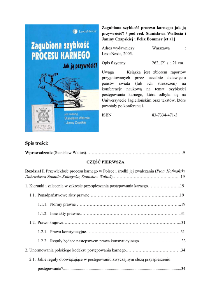 Zagubiona szybkość procesu karnego: jak ją przywrócić? / pod red. Stanisława Waltosia i Janiny Czapskiej ; Felix Bommer [et al.] Adres wydawniczy LexisNexis, 2005. Warszawa Opis fizyczny 262, [2] s. ; 21 cm. : Uwaga Książka jest zbiorem raportów przygotowanych przez uczelnie dziewięciu państw świata (lub ich streszczeń) na konferencję naukową na temat szybkości postępowania karnego, która odbyła się na Uniwersytecie Jagiellońskim oraz tekstów, które powstały po konferencji. ISBN 83-7334-471-3 Spis treści: Wprowadzenie (Stanisław Waltoś)……………………………………..…………………….9 CZĘŚĆ PIERWSZA Rozdział I. Przewlekłość procesu karnego w Polsce i środki jej zwalczania (Piotr Hofmański, Dobrosława Szumiło-Kulczycka, Stanisław Waltoś)………………………………….……...19 1. Kierunki i zalecenia w zakresie przyspieszania postępowania karnego…………………..19 1.1. Ponadpaństwowe akty prawne……………………………………………………….19 1.1.1. Normy prawne ………………………………………………………………..19 1.1.2. Inne akty prawne……………………………………………………………...31 1.2. Prawo krajowe………………………………………………………………………...31 1.2.1. Prawo konstytucyjne………………………………………………………….31 1.2.2. Reguły będące następstwem prawa konstytucyjnego…………………………33 2. Unormowania polskiego kodeksu postępowania karnego…………………………………34 2.1. Jakie reguły obowiązujące w postępowaniu zwyczajnym służą przyspieszeniu postępowania?...............................................................................................................34 2.1.1. Normy prawne………………………………………………………………...34 2.1.2. Faktyczne zachowania uczestników postępowania intra legem………………50 2.1.3. Faktyczne zachowania uczestników procesu extra lub contra legem………...51 2.1.4. Rozwiązania organizacyjne…………………………………………………...54 2.1.5. Ocena krytyczna przedstawionych możliwości przyspieszania postępowania……………………………………………………………………56 2.2. Czy istnieją szczególne tryby postępowania, które w porównaniu do postępowania zwyczajnego bardziej przyspieszają bieg sprawy?.............................................................58 2.2.1. Przestanki każdego z trybów szczególnych…………………………………..59 2.2.2. Rodzaje postępowań szczególnych - przegląd problematyki…………………63 2.2.3. Krytyczna ocena przedstawionych postępowań szczególnych……………….69 3. Ogólna ocena możliwości przyspieszenia postępowania karnego w Polsce………………76 3.1. De lege lata…………………………………………………………………………...76 3.1.1. Możliwości faktyczne…………………………………………………………76 3.1.2. Możliwości prawne……………………………………………………………77 3.2. Propozycje de lege ferenda...............................................................................................78 Rozdział II. Przewlekłość procesu karnego i środki jej zwalczania w wybranych krajach……………………………………………………………………………………...…81 1. Argentyna (Edgardo Donna)………………………………………………………………81 2. Austria (Maria A. Eder-Rieder)............................................................................................86 3. Hiszpania (Juan-Luis Gómez Colomer, Andrea Planchadell Gargallo, Maria-Angeles Perez Cebadera).......................................................................................................................91 4. Japonia (Makoto Ida)………………………………………………………………..…......95 5. Niemcy (cz. 1: Dieter Dölling, Christian Lane; cz. 2: Karl-Heinz Gösset)………...……100 6. Rosja (Inga L. Landau)………………………………………...…………………………115 7. Szwajcaria (Felix Bommer)……………………………………………………………….118 8. Włochy (Renzo Orlandi)………………………………………………….………………124 Rozdział III. Długość trwania postępowania karnego w Niemczech w świetle danych statystycznych i badań empirycznych (Dieter Dölling, Christian Laue)………………..…..128 1. Długość postępowania karnego w świetle danych statystycznych…………………….....128 1.1. Długość postępowania w prokuraturze………………………………………………128 1.2. Długość postępowania karnego przed sądami powiatowymi………………………..129 1.3. Długość postępowania karnego przed sądami krajowymi………………………...…129 1.4. Długość postępowania w postępowania odwoławczym…………………………......130 1.5. Ocena………………………………………………………………………………...131 2. Postępowanie karne przed sądami krajowymi wielkich miast……………………………131 Rozdział IV. Faktyczna długość postępowań karnych przed polskimi sądami na podstawie danych statystycznych (Wojciech Dziuban)………………………...………………………133 1. Wstęp……………………………………………………………………………………..133 2. Postępowanie pierwszoinstancyjne w sprawach karnych (bez wykroczeń)…………..….135 2.1. Sądy rejonowe……………………………………………………………………….136 2.2. Sądy okręgowe…………………………………