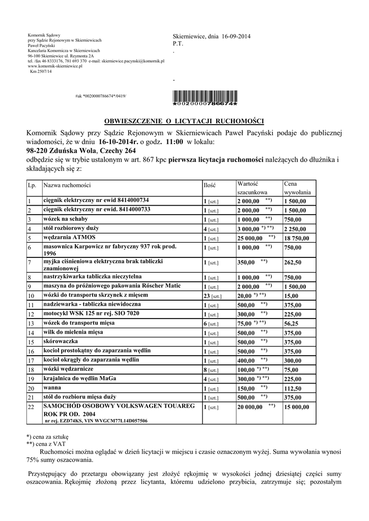 Komornik Sądowy przy Sądzie Rejonowym w Skierniewicach Paweł Pacyński Kancelaria Komornicza w Skierniewicach 96-100 Skierniewice ul. Reymonta 2A tel. /fax 46 8333176, 781 693 370 e-mail: [email protected] www.komornik-skierniewice.pl Km 2507/14 Skierniewice, dnia 16-09-2014 P.T. . #ak *0020000786674*/0419/ *0020000786674* OBWIESZCZENIE O LICYTACJI RUCHOMOŚCI Komornik Sądowy przy Sądzie Rejonowym w Skierniewicach Paweł Pacyński podaje do publicznej wiadomości, że w dniu 16-10-2014r. o godz. 11:00 w lokalu: 98-220 Zduńska Wola, Czechy 264 odbędzie się w trybie ustalonym w art. 867 kpc pierwsza licytacja ruchomości należących do dłużnika i składających się z: Lp. Nazwa ruchomości Ilość 1 2 3 4 5 6 cięgnik elektryczny nr ewid 8414000734 cięgnik elektryczny nr ewid. 8414000733 wózek na schaby stół rozbiorowy duży wędzarnia ATMOS masownica Karpowicz nr fabryczny 937 rok prod. 1996 myjka ciśnieniowa elektryczna brak tabliczki znamionowej nastrzykiwarka tabliczka nieczytelna maszyna do próżniowego pakowania Róscher Matic wózki do transportu skrzynek z mięsem nadziewarka - tabliczka niewidoczna motocykl WSK 125 nr rej. SIO 7020 wózek do transportu mięsa wilk do mielenia mięsa skórowaczka kocioł prostokątny do zaparzania wędlin kocioł okrągły do zaparzania wędlin wózki wędzarnicze krajalnica do wędlin MaGa wanna stół do rozbioru mięsa duży SAMOCHÓD OSOBOWY VOLKSWAGEN TOUAREG ROK PR OD. 2004 1 [szt.] 1 [szt.] 1 [szt.] 4 [szt.] 1 [szt.] 1 [szt.] Wartość szacunkowa 2 000,00 **) 2 000,00 **) 1 000,00 **) 3 000,00 *) **) 25 000,00 **) 1 000,00 **) 1 [szt.] 350,00 1 [szt.] 1 [szt.] 23 [szt.] 1 [szt.] 1 [szt.] 6 [szt.] 1 [szt.] 1 [szt.] 1 [szt.] 1 [szt.] 8 [szt.] 4 [szt.] 1 [szt.] 1 [szt.] 1 [szt.] 1 000,00 **) 2 000,00 **) 20,00 *) **) 500,00 **) 300,00 **) 75,00 *) **) 500,00 **) 500,00 **) 500,00 **) 400,00 **) 100,00 *) **) 300,00 *) **) 150,00 **) 500,00 **) 20 000,00 **) 7 8 9 10 11 12 13 14 15 16 17 18 19 20 21 22 **) Cena wywołania 1 500,00 1 500,00 750,00 2 250,00 18 750,00 750,00 262,50 750,00 1 500,00 15,00 375,00 225,00 56,25 375,00 375,00 375,00 300,00 75,00 225,00 112,50 375,00 15 000,00 .nr rej. EZD74KS, VIN WVGCM77L14D057506 *) cena za sztukę **) cena z VAT Ruchomości można oglądać w dzień licytacji w miejscu i czasie oznaczonym wyżej. Suma wywołania wynosi 75% sumy oszacowania. Przystępujący do przetargu obowiązany jest złożyć rękojmię w wysokości jednej dziesiątej części sumy oszacowania. Rękojmię złożoną przez licytanta, któremu udzielono przybicia, zatrzymuje się; pozostałym licytantom rękojmię zwraca się niezwłocznie. Jeżeli nabywca nie wykonał w terminie warunków licytacji co do zapłaty ceny, traci rękojmię, a skutki przybicia wygasają. Z utraconej rękojmi pokrywa się koszty egzekucji związanej ze sprzedażą, a reszta wchodzi w skład sumy uzyskanej w egzekucji albo jeżeli egzekucja została umorzona jest przelewana na dochód Skarbu Państwa (art. 8671 kpc). W przetargu nie mogą uczestniczyć: dłużnik, komornik, ich małżonkowie, dzieci, rodzice i rodzeństwo, osoby obecne na licytacji w charakterze urzędowym oraz licytant, który nie wykonał warunków poprzedniej licytacji. Stawienie się jednego licytanta wystarcza do odbycia przetargu. Pełnomocnictwo do udziału w przetargu powinno być stwierdzone dokumentem z podpisem urzędowo poświadczonym, chyba że chodzi o pełnomocnictwo udzielone adwokatowi lub radcy prawnemu (art. 8672 kpc) UWAGA: Licytacja może się nie odbyć bez podania przyczyny. Jeżeli drzwi będą zamknięte, będą otwierane na koszt i odpowiedzialność obowiązanegodłużnika. Łukasz Mąkolski Bartłomiej Reczek Anna Bartczak-Lisik Paweł Pacyński aplikant komorniczy asesor komorniczy asesor komorniczy komornik sądowy