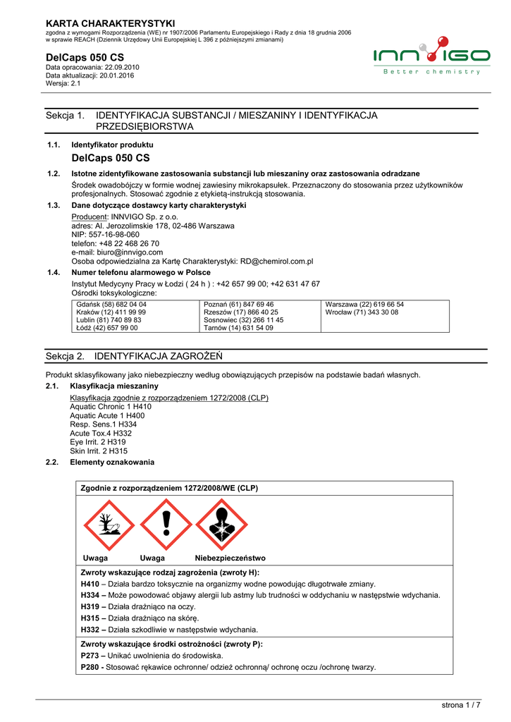 KARTA CHARAKTERYSTYKI zgodna z wymogami Rozporządzenia (WE) nr 1907/2006 Parlamentu Europejskiego i Rady z dnia 18 grudnia 2006 w sprawie REACH (Dziennik Urzędowy Unii Europejskiej L 396 z późniejszymi zmianami) DelCaps 050 CS Data opracowania: 22.09.2010 Data aktualizacji: 20.01.2016 Wersja: 2.1 Sekcja 1. 1.1. IDENTYFIKACJA SUBSTANCJI / MIESZANINY I IDENTYFIKACJA PRZEDSIĘBIORSTWA Identyfikator produktu DelCaps 050 CS 1.2. Istotne zidentyfikowane zastosowania substancji lub mieszaniny oraz zastosowania odradzane 1.3. Środek owadobόjczy w formie wodnej zawiesiny mikrokapsułek. Przeznaczony do stosowania przez użytkowników profesjonalnych. Stosować zgodnie z etykietą-instrukcją stosowania. Dane dotyczące dostawcy karty charakterystyki 1.4. Producent: INNVIGO Sp. z o.o. adres: Al. Jerozolimskie 178, 02-486 Warszawa NIP: 557-16-98-060 telefon: +48 22 468 26 70 e-mail: [email protected] Osoba odpowiedzialna za Kartę Charakterystyki: [email protected] Numer telefonu alarmowego w Polsce Instytut Medycyny Pracy w Łodzi ( 24 h ) : +42 657 99 00; +42 631 47 67 Ośrodki toksykologiczne: Gdańsk (58) 682 04 04 Kraków (12) 411 99 99 Lublin (81) 740 89 83 Łódź (42) 657 99 00 Sekcja 2. Poznań (61) 847 69 46 Rzeszów (17) 866 40 25 Sosnowiec (32) 266 11 45 Tarnów (14) 631 54 09 Warszawa (22) 619 66 54 Wrocław (71) 343 30 08 IDENTYFIKACJA ZAGROŻEŃ Produkt sklasyfikowany jako niebezpieczny według obowiązujących przepisów na podstawie badań własnych. 2.1. Klasyfikacja mieszaniny 2.2. Klasyfikacja zgodnie z rozporządzeniem 1272/2008 (CLP) Aquatic Chronic 1 H410 Aquatic Acute 1 H400 Resp. Sens.1 H334 Acute Tox.4 H332 Eye Irrit. 2 H319 Skin Irrit. 2 H315 Elementy oznakowania Zgodnie z rozporządzeniem 1272/2008/WE (CLP) Uwaga Uwaga Niebezpieczeństwo Zwroty wskazujące rodzaj zagrożenia (zwroty H): H410 – Działa bardzo toksycznie na organizmy wodne powodując długotrwałe zmiany. H334 – Może powodować objawy alergii lub astmy lub trudności w oddychaniu w następstwie wdychania. H319 – Działa drażniąco na oczy. H315 – Działa drażniąco na skórę. H332 – Działa szkodliwie w następstwie wdychania. Zwroty wskazujące środki ostrożności (zwroty P): P273 – Unikać uwolnienia do środowiska. P280 - Stosować rękawice ochronne/ odzież ochronną/ ochronę oczu /ochronę twarzy. strona 1 / 7 Karta Charakterystyki – DelCaps 050 CS P302+P352 – W PRZYPADKU KONTAKTU ZE SKÓRĄ: Umyć dużą ilością wody z mydłem. P305+P351+P338 – W PRZYPADKU DOSTANIA SIĘ DO OCZU: Ostrożnie płukać wodą przez kilka minut. Wyjąć soczewki kontaktowe, jeżeli są i można je łatwo usunąć. Nadal płukać. P261 – Unikać wdychania pyłu/dymu/gazu/mgły/par/rozpylonej cieczy. P304+P341 – W PRZYPADKU DOSTANIA SIĘ DO DRÓG ODDECHOWYCH: W przypadku trudności z oddychaniem, wyprowadzić lub wynieść poszkodowanego na świeże powietrze i zapewnić warunki do odpoczynku w pozycji umożliwiającej swobodne oddychanie. Inne zagrożenia 2.3. Nie stwierdza się innych zagrożeń. Sekcja 3. 3.2. SKŁAD / INFORMACJA O SKŁADNIKACH Mieszanina Składniki stanowiące zagrożenie dla zdrowia lub środowiska: Nr indeksowy Nr CAS Nr WE Zawartość [% w/w] Klasyfikacja wg CLP - 52918-63-5 - 5% 1,2-benzoisothiazol-3(2H)one 2634-33-5 220-120-9 <0.3% Dodecylbenzensulfonat wapnia n-Butanol 26264-06-2 247-557-8 <0.05 71-36-3 200-751-6 <0.05 Polioksyethylenowy eter oleju rycynowego 61791-12-6 232-293-8 <0.05 Aquatic Chronic 1 H410 Aquatic Acute 1, H400 Acute Tox. 3 H331 Acute Tox. 3 H301 Acute Tox. 4 H302 Skin Irrit. 2 H315 Eye Dam 1 H318 Skin Sens. 1 H317 Aquatic. Acute H400 Eye Irrit. 2 H319 Skin Irrit. 2 H315 Flam. Liq.3 H226 Acute Tox. 4 H302 STOT SE.3 H335 Skin Irrit. 2 H315 Eye Dam 1 H318 STOT SE. 3 H336 Eye Irrit. 2 H319 Skin Irrit. 2 H315 Nazwa chemiczna Deltametryna Pełne brzmienie symboli i zwrotów H znajduje się w Sekcji 16. Sekcja 4. ŚRODKI PIERWSZEJ POMOCY 4.1. Opis środków pierwszej pomocy 4.2. Zalecenia ogólne: Unikać kontaktu ze skórą, oczami i odzieżą. Natychmiast zdjąć skażoną odzież. Mieć łatwy dostęp do punktu przemywania oczu. W przypadku awarii lub jeżeli źle się poczujesz, niezwłocznie zasięgnij porady lekarza jeżeli to możliwe, pokaż etykietę. Postępowanie w przypadku: Wdychania: wyprowadzić poszkodowanego na świeże powietrze. W razie potrzeby zasięgnąć porady lekarza. W przypadku wystąpienia objawów ze strony układu oddechowego: Skontaktować się z OŚRODKIEM ZATRUĆ lub z lekarzem. Kontakt z oczami: bezzwłocznie przemyć oczy dużą ilością wody, również pod powiekami, przez co najmniej 15 minut. W przypadku utrzymywania się działania drażniącego na oczy: Zasięgnąć porady/zgłosić się pod opiekę lekarza. Skażenie skóry: bezzwłocznie umyć skażone partie skóry dużą ilością wody z mydłem. W przypadku wystąpienia podrażnienia skóry: Zasięgnąć porady/zgłosić się pod opiekę lekarza. Połknięcia: W razie połknięcia niezwłocznie zasięgnij porady lekarza .Nie wywoływać wymiotów bez zasięgnięcia porady lekarza. Nie podawać niczego doustnie, jeśli poszkodowana osoba jest nieprzytomna. W razie wypadku lub gdy poczujesz się źle – natychmiast zasięgnij porady lekarza (pokaż etykietę znajdującą się na opakowaniu produktu). Najważniejsze ostre i opóźnione objawy oraz skutki narażenia 4.3. Brak informacji Wskazania dotyczące wszelkiej natychmiastowej pomocy lekarskiej i szczególnego postępowania z poszkodowanym Antidotum: brak. strona 2 / 7 Karta Charakterystyki – DelCaps 050 CS Stosować leczenie objawowe. Sekcja 5. POSTĘPOWANIE W PRZYPADKU POŻARU Zalecenia ogólne: Usunąć z zagrożonego obszaru osoby niepowołane, niebiorące udziału w likwidowaniu pożaru. Usunąć źródła zapłonu, nie palić. W razie potrzeby wezwać Straż Pożarną. 5.1. Środki gaśnicze 5.2. Środki zalecane: Piana, suche chemikalia, proszki gaśnicze, dwutlenek węgla; w razie potrzeby 