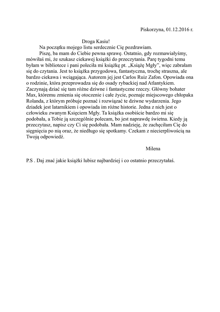 Piskorzyna, 01.12.2016 r. Droga Kasiu! Na początku mojego listu serdecznie Cię pozdrawiam. Piszę, ba mam do Ciebie pewna sprawę. Ostatnio, gdy rozmawiałyśmy, mówiłaś mi, że szukasz ciekawej książki do przeczytania. Parę tygodni temu byłam w bibliotece i pani poleciła mi książkę pt. „Książę Mgły”, więc zabrałam się do czytania. Jest to książka przygodowa, fantastyczna, trochę straszna, ale bardzo ciekawa i wciągająca. Autorem jej jest Carlos Ruiz Zafon. Opowiada ona o rodzinie, która przeprowadza się do osady rybackiej nad Atlantykiem. Zaczynają dziać się tam różne dziwne i fantastyczne rzeczy. Główny bohater Max, któremu zmienia się otoczenie i całe życie, poznaje miejscowego chłopaka Rolanda, z którym próbuje poznać i rozwiązać te dziwne wydarzenia. Jego dziadek jest latarnikiem i opowiada im różne historie. Jedna z nich jest o człowieku zwanym Księciem Mgły. Ta książka osobiście bardzo mi się podobała, a Tobie ją szczególnie polecam, bo jest naprawdę świetna. Kiedy ją przeczytasz, napisz czy Ci się podobała. Mam nadzieję, że zachęciłam Cię do sięgnięcia po nią oraz, że niedługo się spotkamy. Czekam z niecierpliwością na Twoją odpowiedź. Milena P.S . Daj znać jakie książki lubisz najbardziej i co ostatnio przeczytałaś.