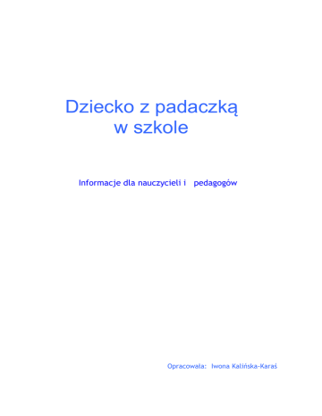 Dziecko z padaczką w szkole Informacje dla nauczycieli i pedagogów Opracowała: Iwona Kalińska-Karaś Wstęp Padaczka (epilepsja) jest jedną z najczęstszych, a u dzieci najczęstszą, chorobą układu nerwowego. Padaczka jest chorobą przewlekłą, leczenie trwa wiele lat a skutki w psychice pozostają niekiedy do końca życia. Niekorzystny wpływ padaczki na społeczne funkcjonowanie chorego wiąże się z gorszymi wynikami w nauce, trudnościami w kontaktach społecznych, a potem w znalezieniu pracy i niezdolnością do kierowania pojazdami. Padaczka jest chorobą społeczną, dotyka znaczną część populacji ludzkiej. Szacunkowa liczba chorych w Polsce wynosi około 400 tysięcy! Wynika z tego potrzeba rozpowszechniania właściwej wiedzy na temat padaczki zwłaszcza wśród nauczycieli i pedagogów, którzy przebywają z dziećmi wiele godzin w ciągu dnia i mogą być mimowolnymi świadkami zdarzeń, których te dzieci doświadczają na co dzień. 1. Co określamy jako napad padaczkowy i padaczkę. Napadem padaczkowym potocznie nazywamy napadowo występujące zaburzenia w funkcjonowaniu mózgu chorego, objawiające się widocznymi zaburzeniami, zwykle ruchowymi (drgawkami, bezdechem, skurczami mięśni). 2. Przyczyny padaczki W około 50—60% przypadków nie udaje się ustalić przyczyn padaczki. Określa się ją wtedy jako idiopatyczną (samoistną) lub kryptogenną (o przypuszczalnej, ale nie potwierdzonej przyczynie). Do najczęściej rozpoznawanych przyczyn padaczki należą: 1. Urazy czaszki. 2. Guzy mózgu. 3. Choroby zakaźne i neuroinfekcje. 4. Choroby metaboliczne i zwyrodnieniowe. 5. Choroby naczyniowe. 6. Alkohol. 7. Wady rozwojowe mózgu. 8. Inne zaburzenia genetyczne. 3. Jak dochodzi do napadu padaczkowego W „zdrowym” mózgu stale odbywa się ustanawianie równowagi między układami hamującymi (GABA — kwas gamma aminomasłowy i jego receptory) a pobudzającymi (glutaminiany). U chorego z padaczką występują okresy, gdy przewaga układu pobudzającego prowadzi do wystąpienia różnych klinicznych form napadów. 4. Zasady leczenia padaczki. Leczenie padaczki jest procesem przewlekłym, trwającym, po opanowaniu napadów, zazwyczaj od 2 do 5 lat. W tym czasie chory wymaga systematycznego, codziennego podawania leków. Zarówno wprowadzanie nowych leków, jak i ich odstawianie musi być dokonywane bardzo powoli. Nagłe przerwanie leczenia, pominięcie którejś dawki, może zakończyć się napadem lub stanem padaczkowym. Z tego względu tak ważne jest aby chory mógł systematycznie przyjmować leki. 5. Co robić, jeśli jednak zdarzy się napad. Napad może wystąpić pomimo prawidłowo prowadzonego leczenia. Oto kilka wskazówek dla osób znajdujących się w pobliżu Postępuj tak: 1. Zachowaj spokój! 2. Upewnij się, że chory jest w bezpiecznym miejscu! 3. Ułóż dziecko na boku, z twarzą skierowaną lekko ku podłożu! 4. Zabezpiecz go przed możliwością urazu: zdejmij mu okulary, usuń z ust ciała obce, podłóż mu coś miękkiego pod głowę! 5. Pozostań z chorym do odzyskania pełnej świadomości! Tego absolutnie nie rób: 1. Nie wkładaj choremu czegokolwiek między zęby! 2. Nie podnoś chorego! 3. Nie krępuj ruchów chorego! 4. Nie cuć, nie uderzaj po twarzy i nie polewaj wodą! 5. Nie ingeruj agresywnie w zachowanie chorego w czasie, gdy jest on jeszcze zdezorientowany! W czasie napadu może dojść do oddania moczu. Po napadzie może wystąpić faza zaburzeń świadomości, w czasie których chory może być pobudzony. Zazwyczaj po kilku — kilkunastu minutach stopniowo odzyskuje świadomość. Często jest jednak senny. Pomoc lekarska jest potrzebna, gdy: był to pierwszy napad w życiu lub napad trwał dłużej niż 10 minut albo jeśli po napadzie wystąpiła długo trwająca gorączka, sugerująca zapalenie opon mózgowo-rdzeniowych. a: • P pacjenta w b 6 . Codzienne problemy dzieci z padaczką Dziecko z padaczką, z powodu skłonności do występowania napadów, ma zazwyczaj poczucie swojej niesprawności, która wyraża się ograniczeniami prawidłowego funkcjonowania fizycznego i społecznego. Ograniczenia te obejmują możliwości rozwoju jako osoby, obniżenie ufności we własne możliwości i poczucia własnej wartości, a w wymiarze ogólnym — pogorszenie jakości życia. Ważne jest uświadomienie dzieci w klasie, szkole o skutkach choroby. Reakcją na rozpoznanie padaczki u dziecka jest pojawienie się wielu negatywnych zachowań i postaw: a/ poczucie winy rodziców pojawia się zwłaszcza gdy padaczka ma podłoże genetyczne. b/ postawa nadopiekuńcza rodzice lub opiekunowie chcą chronić dziecko przed zewnętrznymi zagrożeniami, jednak nadopiekuńczość w stosunku do dzieci cierpiących na padaczkę zmniejsza ich samodzielność, spowalnia rozwój ich osobowości i ogranicza umiejętność funkcjonowania w środowisku, którą normalnie nabywają zdrowe dzieci. na boku, z twarzą s777777kierowaną lekko ku po7. Aktywność szkolna Dzieciom chorym na padaczkę trudniej jest wykorzystać w pełni swoje możliwości edukacyjne z przyczyn medycznych i społecznych. a/ Przyczyny medyczne związane są z niepożądanym działaniem leków przeciwpadaczkowych, nawracającymi napadami, oraz zmianami organicznymi w mózgu, zaburzającymi funkcje pamięci lub mowy, b/ Przyczyny społeczne to zaniżone oczekiwania, nadopiekuńczość, zwolnienia z zajęć szkolnych. Pomimo tych utrudnień, należy przyjąć jako zasadę, że dzieci z padaczką powinny kontynuować normalny tok kształcenia szkolnego (zdanie dr n. med. Marzenny Wesołowskiej) Nie należy z zasady zwalniać dziecka z zajęć wychowania fizycznego (oprócz dzieci z wrażliwością na hiperwentylację) ani z zabaw i zajęć ruchowych w grupie rówieśników. Należy jedynie dbać o to, aby nie dopuszczać do nadmiernego obciążenia fizycznego i psychicznego.: • Podn8osić pacjenta, • Kr 8. Ciekawostki pacjenta, Teksty historyczne wskazują, że pa