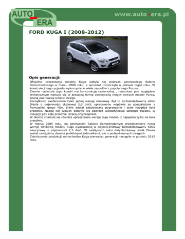 www.auto - era.pl FORD KUGA I (2008-2012) Opis generacji: Oficjalna prezentacja modelu Kuga odbyła się podczas genewskiego Salonu Samochodowego w marcu 2008 roku, a sprzedaż rozpoczęto w połowie tegoż roku. W konstrukcji tego pojazdu wykorzystano wiele zespołów z popularnego Focusa. Zwarte nadwozie typu kombi ma konstrukcję samonośną , natomiast pod względem stylistycznym wpisuje się w aktualną formę zewnętrzną innych nowych modeli Forda, znaną pod nazwą Kinetic Design. Początkowo zaoferowano tylko jedną wersję silnikową. Był to turbodoładowany silnik Diesla o pojemności skokowej 2,0 dm3, opracowany wspólnie ze specjalistami z francuskiej grupy PSA. Silnik został zabudowany poprzecznie i stale napędza koła przednie. Napęd kół tylnych odbywa się poprzez wielopłytkowe sprzęgło Haldex, w sytuacji gdy koła przednie utracą przyczepność. W ofercie znalazła się również uproszczona wersja tego modelu z napędem tylko na koła przednie. W marcu 2009 roku, na genewskim Salonie Samochodowym przedstawiono nową wersję silnikową modelu Kuga wyposażoną w pięciocylindrowy turbodoładowany silnik benzynowy o pojemności 2,5 dm3. W następnym roku dotychczasowy silnik Diesla został zastąpiony dwoma podobnymi jednostkami, ale o podwyższonych osiągach. Zakończenie produkcji samochodów Kuga pierwszej generacji nastąpiło w grudniu 2012 roku.