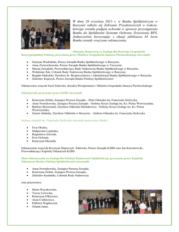 W dniu 29 września 2015 r. w Banku Spółdzielczym w Raszynie odbyło się Zebranie Przedstawicieli w trakcie, którego została podjęta uchwała w sprawie przystąpienia Banku do Spółdzielni Systemu Ochrony Zrzeszenia BPS. Jednocześnie korzystając z okazji jubileuszu 65 lecia Banku zostały wręczone odznaczenia. Odznakę Honorową za Zasługi dla Rozwoju Gospodarki Rzeczypospolitej Polskiej, przyznaną przez Ministra Gospodarki Janusza Piechocińskiego otrzymali: Grażyna Wodzińska, Prezes Zarządu Banku Spółdzielczego w Raszynie, Anna Zwierzchowska, Prezes Zarządu Banku Spółdzielczego w Tarczynie, Maciej Zawadzki, Przewodniczący Rady Nadzorczej Banku Spółdzielczego w Raszynie, Waldemar Żak, Członek Rady Nadzorczej Banku Spółdzielczego w Raszynie, Bogdan Makulski, Dyrektor ds. Bezpieczeństwa i Administracji Banku Spółdzielczego w Raszynie, Zdzisław Kupczyk, Prezes Zarządu Banku Polskiej Spółdzielczości. Odznaczenia wręczał Józef Zalewski, doradca Wicepremiera i Ministra Gospodarki Janusza Piechocińskiego Odznaczenia przyznane przez KZBS otrzymali: Katarzyna Ziółek, Zastępca Prezesa Zarządu - Złota Odznaka im. Franciszka Stefczyka, Anna Nowakowska, Zastępca Prezesa Zarządu - Srebrny Krzyż Zasługi im. Ks. Piotra Wawrzyniaka, Barbara Skowronek, Dyrektor Oddziału Michałowice - Srebrny Krzyż Zasługi im. Ks. Piotra Wawrzyniaka, Żaneta Zduńska, Dyrektor Oddziału w Raszynie – Srebrna Odznaka im. Franciszka Stefczyka Srebrne odznaki im. Franciszka Stefczyka otrzymali pracownicy Banku: Ewa Okulus, Małgorzata Lepianko, Bogusława Jóźwiak, Ewa Ochman, Katarzyna Musialik. Odznaczenia wręczyła Krystyna Majerczyk- Żabówka, Prezes Zarządu KZBS oraz Jan Karwatowski, Przewodniczący Kapituły Odznaczeń KZBS. Złote Odznaczenia za Zasługi dla Polskiej Bankowości Spółdzielczej, przyznane przez Kapitułę Odznaczeń Banku Polskiej Spółdzielczości otrzymali: Anna Nowakowska, Zastępca Prezesa Zarządu, Katarzyna Ziółek, Zastępca Prezesa Zarządu, Zdzisław Kamiński, Członek Rady Nadzorczej oraz pracownicy: Maria Wuczkowska, Teresa Liżewska, Katarzyna Olkiewicz, Anna Ciołkiewicz, Elżbieta Węglarczyk, Jolanta Janus.