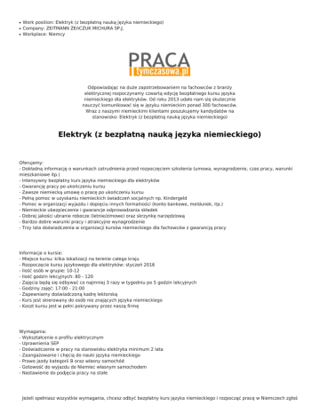 ● ● ● Work position: Elektryk (z bezpłatną nauką języka niemieckiego) Company: ZEITMANN ŻEńCZUK MICHURA SP.J. Workplace: Niemcy Odpowiadając na duże zapotrzebowaniem na fachowców z branży elektrycznej rozpoczynamy czwartą edycję bezpłatnego kursu języka niemieckiego dla elektryków. Od roku 2013 udało nam się skutecznie nauczyć komunikować się w języku niemieckim ponad 300 fachowców. Wraz z naszymi niemieckimi klientami poszukujemy kandydatów na stanowisko: Elektryk (z bezpłatną nauką języka niemieckiego) Elektryk (z bezpłatną nauką języka niemieckiego) Oferujemy: - Dokładną informację o warunkach zatrudnienia przed rozpoczęciem szkolenia (umowa, wynagrodzenie, czas pracy, warunki mieszkaniowe itp.) - Intensywny bezpłatny kurs języka niemieckiego dla elektryków - Gwarancję pracy po ukończeniu kursu - Zawsze niemiecką umowę o pracę po ukończeniu kursu - Pełną pomoc w uzyskaniu niemieckich świadczeń socjalnych np. Kindergeld - Pomoc w organizacji wyjazdu i dopięciu innych formalności (konto bankowe, meldunek, itp.) - Niemieckie ubezpieczenie i gwarancje odprowadzania składek - Dobrej jakości ubranie robocze (letnie/zimowe) oraz skrzynkę narzędziową - Bardzo dobre warunki pracy i atrakcyjne wynagrodzenie - Trzy lata doświadczenia w organizacji kursów niemieckiego dla fachowców z gwarancją pracy Informacje o kursie: - Miejsce kursu: kilka lokalizacji na terenie całego kraju - Rozpoczęcie kursu językowego dla elektryków: styczeń 2016 - Ilość osób w grupie: 10-12 - Ilość godzin lekcyjnych: 80 - 120 - Zajęcia będą się odbywać co najmniej 3 razy w tygodniu po 5 godzin lekcyjnych - Godziny zajęć: 17:00 - 21:00 - Zapewniamy doświadczoną kadrę lektorską - Kurs jest skierowany do osób nie znających języka niemieckiego - Koszt kursu jest w pełni pokrywany przez naszą firmę Wymagania: - Wykształcenie o profilu elektrycznym - Uprawnienia SEP - Doświadczenie w pracy na stanowisku elektryka minimum 2 lata - Zaangażowanie i chęcią do nauki języka niemieckiego - Prawo jazdy kategorii B oraz własny samochód - Gotowość do wyjazdu do Niemiec własnym samochodem - Nastawienie do podjęcia pracy na stałe Jeżeli spełniasz wszystkie wymagania, chcesz odbyć bezpłatny kurs języka niemieckiego i rozpocząć pracę w Niemczech zgłoś się do nas! Osoby zainteresowane prosimy o kontakt telefoniczny 12 661 64 00 lub o aplikację drogą elektroniczną (załączając CV oraz posiadane uprawnienia) Uprzejmie informujemy, że skontaktujemy się wyłącznie z wybranymi kandydatami. Zeitmann Sp.j. ul. Walerego Sławka 3, 30-633 Kraków. Numer Agencji Zatrudnienia 9212. Aplikuj Dane kontaktowe: ZEITMANN ŻEńCZUK MICHURA SP.J. Send Save Print Tweet