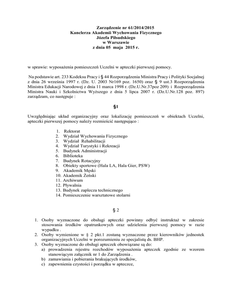 Zarządzenie nr 61/2014/2015 Kanclerza Akademii Wychowania Fizycznego Józefa Piłsudskiego w Warszawie z dnia 05 maja 2015 r. w sprawie: wyposażenia pomieszczeń Uczelni w apteczki pierwszej pomocy. Na podstawie art. 233 Kodeksu Pracy i § 44 Rozporządzenia Ministra Pracy i Polityki Socjalnej z dnia 26 września 1997 r. (Dz. U. 2003 Nr169 poz. 1650) oraz § 9 ust.3 Rozporządzenia Ministra Edukacji Narodowej z dnia 11 marca 1998 r. (Dz.U.Nr.37poz 209) i Rozporządzenia Ministra Nauki i Szkolnictwa Wyższego z dnia 5 lipca 2007 r. (Dz.U.Nr.128 poz. 897) zarządzam, co następuje : §1 Uwzględniając układ organizacyjny oraz lokalizację pomieszczeń w obiektach Uczelni, apteczki pierwszej pomocy należy rozmieścić następująco : 1. 2. 3. 4. 5. 6. 7. 8. 9. 10. 11. 12. 13. 14. Rektorat Wydział Wychowania Fizycznego Wydział Rehabilitacji Wydział Turystyki i Rekreacji Budynek Administracji Biblioteka Budynek Rotacyjny Obiekty sportowe (Hala LA, Hala Gier, PSW) Akademik Męski Akademik Żeński Archiwum Pływalnia Budynek zaplecza technicznego Pomieszczenie warsztatowe stolarni §2 1. Osoby wyznaczone do obsługi apteczki powinny odbyć instruktaż w zakresie stosowania środków opatrunkowych oraz udzielenia pierwszej pomocy w razie wypadku . 2. Osoby wymienione w § 2 pkt.1 zostaną wyznaczone przez kierowników jednostek organizacyjnych Uczelni w porozumieniu ze specjalistą ds. BHP. 3. Osoby wyznaczone do obsługi apteczek obowiązane są do: a) prowadzenia rejestru rozchodów wyposażenia apteczek zgodnie ze wzorem stanowiącym załącznik nr 1 do Zarządzenia . b) zamawiania i pobierania brakujących środków, c) zapewnienia czystości i porządku w apteczce, §3 Standardowe wyposażenie apteczki określa załącznik nr 2 do zarządzenia . §4 Nadzór i bieżącą kontrolę nad realizacją niniejszego zarządzenia sprawuje specjalista ds. BHP. §5 Zarządzenie wchodzi w życie z dniem podpisania. KANCLERZ AKADEMII WYCHOWANIA FIZYCZNEGO Włodzimierz Cygański Załącznik nr 1 do Zarządzenia nr 60/2014/2015 Kanclerza AWF w Warszawie z dnia 5 maja 2015 roku L. p 1 Imię i nazwisko osoby chorej 2 Data udzielenia pomocy 3 Objawy , niedomagania 4 Rodzaj udzielanej pomocy 5 Nazwa używanych leków / środków 6 Ilość zużycia 7 Imię i nazwisko osoby udzielającej pomocy 8 Załącznik nr 2 do Zarządzenia nr 60/2014/2015 Kanclerza AWF w Warszawie z dnia 5 maja 2015 roku STANDARDOWE WYPOSAŻENIE APTECZKI PIERWSZEJ POMOCY W LEKI I ŚRODKI OPATRUNKOWE l.p. Leki i materiały opatrunkowe Nazwa ilość Zastosowanie 1. Woda utleniona 3% 1 but. do przemywania ran 2. 3. 4. 5. 6. 7. 8. 9. 10. 11. 12 13. 14. 15. 16. Kompleksy jałowe (7cmx7cm) Kompleksy jałowe (5cmx5cm) Bandaż (4mxl0cm) Bandaż (4mx5cm) Bandaż elastyczny (4mxl0cm) Chusta trójkątna Agrafki Plastry z opatrunkiem (lmx6cm) Plastry (5cmx2,5 cm) Wata 50 g Gaziki jałowe Termometr lekarski Rękawiczki jednorazowe lateksowe Nożyczki Opaski 5 szt. 5 szt. 3 szt. 3 szt. 1 szt. 1 szt. 4 szt. 1 szt. 1 szt. 1 opak. 10 sasz. 1 szt. 4 szt. 1 szt. 1 szt. opatrunek na ranę większą opatrunek na ranę mniejszą opatrunek na ranę większą opatrunek na ranę mniejszą do unieruchomienia kończyn przy złamaniu ręki lub obojczyka do zapięcia chusty na rany przylepiec do podtrzymywania opatrunku środek opatrunkowy do dezynfekcji do pomiaru ciepłoty ciała