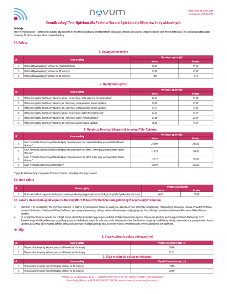 Obowiązuje od 22.02.2015 Kod cennika: OPK/PAK/01 Cennik usługi Tele-Opiekun dla Pakietu Novum Opiekun dla Klientów Indywidualnych Definicje: Pakiet Novum Opiekun – odnosi się do sytuacji gdy jednocześnie między Usługodawcą a Podopiecznym obowiązuje Umowa o świadczenie usługi TeleNovum lub t-novum oraz usługi Tele-Opiekun zawarta na czas oznaczony 18 lub 36 miesiące lub na czas nieokreślony §1. Opłaty 1. Opłaty aktywacyjne LP. Wysokość opłaty [zł] Nazwa opłaty Netto Brutto 1. Opłata aktywacyjna przy umowie na czas nieokreślony 80,49 99,00 2. Opłata aktywacyjna przy umowie na 18 miesięcy 39,84 49,00 3. Opłata aktywacyjna przy umowie na 36 miesięcy 1,00 1,23 2. Opłaty miesięczne LP. Wysokość opłaty [zł] Nazwa opłaty Netto Brutto 1. Opłata miesięczna dla Umowy zawartej na czas nieokreślony „poza pakietem Novum Opiekun” 47,97 59,00 2. Opłata miesięczna dla Umowy zawartej na 18 miesięcy „poza pakietem Novum Opiekun” 39,84 49,00 3. Opłata miesięczna dla Umowy zawartej na 36 miesięcy „poza pakietem Novum Opiekun” 31,71 39,00 4. Opłata miesięczna dla Umowy zawartej na czas nieokreślony „pakiet Novum Opiekun” 37,39 45,99 5. Opłata miesięczna dla Umowy zawartej na 18 miesięcy „pakiet Novum Opiekun” 24,38 29,99 6. Opłata miesięczna dla Umowy zawartej na 36 miesięcy„pakiet Novum Opiekun” 16,25 19,99 3. Opłaty za Terminal Abonencki do usługi Tele-Opiekun LP. Wysokość opłaty [zł] Nazwa opłaty Koszt Terminala Abonenckiego Standard przy zawarciu umowy na czas nieokreślony „poza pakietem Novum Opiekun” Koszt Terminala Abonenckiego Standard przy zawarciu umowy na okres 18 miesięcy „poza pakietem Novum Opiekun” Koszt Terminala Abonenckiego Standard przy zawarciu umowy na okres 36 miesięcy „poza pakietem Novum Opiekun” 1. 2. 3. 4. Koszt Terminala Abonenckiego PREMIUM * Netto Brutto 243,09 299,00 218,70 269,00 161,79 199,00 486,99 599,00 *Opcja dla klientów chcących posiadać Terminal Premium i posiadających usługę t-novum §2. Inne opłaty LP. Wysokość opłaty [zł] Nazwa opłaty 1. Opłata za telefoniczną pomoc techniczną związaną z rekonfiguracją urządzenia do obsługi usługi Tele-Opiekun (za zdarzenie) Netto 40,65 Brutto 50,00 §3. Zasady stosowania opłat wspólne dla wszystkich Wariantów Rozliczeń uregulowanych w niniejszym Cenniku 1. Określone w §1 stawki Opłaty Miesięcznej w wariancie „w pakiecie Novum Opiekun” stosuje się wyłącznie, gdy jednocześnie pomiędzy Usługodawcą i Podopiecznym obowiązuje Umowa o Świadczenie Usługi t-novum lub Umowa o Świadczenie Usługi TeleNovum, począwszy od pierwszego pełnego okresu rozliczeniowego następującego po dniu, w którym spełnione zostały warunki istnienia Pakietu Novum Opiekun. Po rozwiązaniu Umowy o Świadczenie Usługi t-novum lub TeleNovum (w tym wygaśnięciu na skutek odstąpienia dokonanego przez Podopiecznego lub na skutek wypowiedzenia dokonanego przez Podopiecznego lub Usługodawcę z przyczyn leżących po stronie Podopiecznego) do rozliczeń z tytułu świadczenia usługi Tele-Opiekun stosuje się stawki Opłaty Miesięcznej w wariancie „poza pakietem Novum Opiekun”, począwszy od pierwszego pełnego okresu rozliczeniowego następującego po dniu, w którym warunki istnienia Pakietu Novum Opiekun nie były spełnione. 2. §4. Ulgi LP. 1. Ulga w zakresie opłaty aktywacyjnej Nazwa opłaty 1. Ulga w zakresie opłaty aktywacyjnej przy Umowie na 18 miesięcy 2. Ulga w zakresie opłaty aktywacyjnej przy Umowie na 36 miesięcy LP. Wysokość opłaty brutto [zł] 50,00 97,77 2. Ulga w zakresie opłaty miesięcznej Nazwa opłaty Wysokość opłaty brutto [zł] 1. Ulga w zakresie opłaty miesięcznej przy Umowie na 18 miesięcy 10,00 2. Ulga w zakresie opłaty miesięcznej przy Umowie na 36 miesięcy 20,00 NOVUM S.A. ul. Racławicka 146, 02-117 Warszawa NIP: 949-19-24-705; REGON: 152185875; KRS 0000368094 Biuro Obsługi Klienta: + 48 29 692 11 00, 801 048 048, www.t-novum.pl, www.energia-novum.pl Obowiązuje od 22.02.2015 Kod cennika: OPK/PAK/01 3 .Ulga w zakresie opłaty za Terminal Abonencki LP. Nazwa opłaty Wysokość opłaty brutto [zł] 1. Ulga w zakresie opłaty za Terminal Abonencki Standard przy Umowie na 18 miesięcy 30,00 2. Ulga w zakresie opłaty za Terminal Abonencki Standard przy Umowie na 36 miesięcy 100,00 4. Opłata wyrównawcza (kara umowna) Wysokość opłaty wyrównawczej (kary umownej) należnej z tytułu rozwiązania Umowy zawartej na czas określony przed zakończeniem okresu, na jaki umowa została zawarta , obliczana jest jako iloczyn: (a) liczby miesięcy przypadających pomiędzy dniem rozwiązania umowy zawartej na czas określony a dniem, w którym upływa okres, na jaki umowa na czas określony została pierwotnie zawarta, oraz (b) określonych w poniższej Tabeli jednostkowych opłat wyrównawczych z tytułu opłaty abonamentowej, opłaty aktywacyjnej oraz opłaty za urządzenie. Tabela A. LP. 1. 2. 3. 4. 5. 6. Nazwa opłaty Wysokość opłaty wyrównawczej (ulgi brutto) za każdy miesiąc pozostały do końca okresu, na jaki umowa została pierwotnie zawarta [zł] Opłata wyrównawcza związana z przyznaną ulgą na opłacie aktywacyjnej i miesięcznej dla Umowy na czas określony 18 miesięcy Opłata wyrównawcza związana z przyznaną ulgą na opłacie aktywacyjnej i miesięcznej dla Umowy na czas określony 36 miesięcy Opłata wyrównawcza związana z przyznaną ulgą na opłacie aktywacyjnej, miesięcznej i na Terminal Abonencki Standard dla Umowy na czas określony 18 miesięcy Opłata wyrównawcza związana z przyznaną ulgą na opłacie aktywacyjnej, miesięcznej i na Terminal Abonencki Standard dla Umowy na czas określony 36 miesięcy Opłata wyrównawcza związana z przyznaną ulgą na opłacie aktywacyjnej i miesięcznej dla Umowy na czas określony 18 miesięcy w opcji z Terminalem Abonenckim Premium Opłata wyrównawcza związana z przyznaną ulgą na opłacie aktywacy