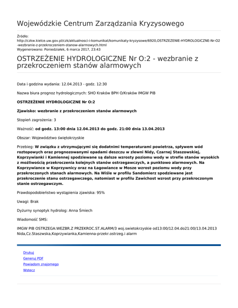 Wojewódzkie Centrum Zarządzania Kryzysowego Źródło: http://czkw.kielce.uw.gov.pl/czk/aktualnosci-i-komunikat/komunikaty-kryzysowe/6920,OSTRZEZENIE-HYDROLOGICZNE-Nr-O2 -wezbranie-z-przekroczeniem-stanow-alarmowych.html Wygenerowano: Poniedziałek, 6 marca 2017, 23:43 OSTRZEŻENIE HYDROLOGICZNE Nr O:2 - wezbranie z przekroczeniem stanów alarmowych Data i godzina wydania: 12.04.2013 - godz. 12:30 Nazwa biura prognoz hydrologicznych: SHO Kraków BPH O/Kraków IMGW PIB OSTRZEŻENIE HYDROLOGICZNE Nr O:2 Zjawisko: wezbranie z przekroczeniem stanów alarmowych Stopień zagrożenia: 3 Ważność: od godz. 13:00 dnia 12.04.2013 do godz. 21:00 dnia 13.04.2013 Obszar: Województwo świętokrzyskie Przebieg: W związku z utrzymującymi się dodatnimi temperaturami powietrza, spływem wód roztopowych oraz prognozowanymi opadami deszczu w zlewni Nidy, Czarnej Staszowskiej, Koprzywianki i Kamiennej spodziewane są dalsze wzrosty poziomu wody w strefie stanów wysokich z możliwością przekroczenia kolejnych stanów ostrzegawczych, a punktowo alarmowych. Na Koprzywiance w Koprzywnicy oraz na Łagowiance w Mosze wzrost poziomu wody przy przekroczonych stanach alarmowych. Na Wiśle w profilu Sandomierz spodziewane jest przekroczenie stanu ostrzegawczego, natomiast w profilu Zawichost wzrost przy przekroczonym stanie ostrzegawczym. Prawdopodobieństwo wystąpienia zjawiska: 95% Uwagi: Brak Dyżurny synoptyk hydrolog: Anna Śmiech Wiadomość SMS: IMGW PIB OSTRZEGA:WEZBR.Z PRZEKROC.ST.ALARM/3 woj.swietokrzyskie od13:00/12.04.do21:00/13.04.2013 Nida,Cz.Staszwska,Koprzywianka,Kamienna-przekr.ostrzeg.i alarm Drukuj Generuj PDF Powiadom znajomego Wstecz