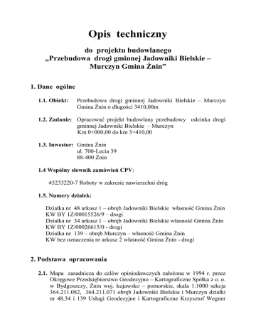 Opis techniczny do projektu budowlanego „Przebudowa drogi gminnej Jadowniki Bielskie – Murczyn Gmina Żnin” 1. Dane ogólne 1.1. Obiekt: Przebudowa drogi gminnej Jadowniki Bielskie – Murczyn Gmina Żnin o długości 3410,00m 1.2. Zadanie: Opracować projekt budowlany przebudowy odcinka drogi gminnej Jadowniki Bielskie – Murczyn Km 0+000,00 do km 3+410,00 1.3. Inwestor: Gmina Żnin ul. 700-Lecia 39 88-400 Żnin 1.4 Wspólny słownik zamówień CPV: 45233220-7 Roboty w zakresie nawierzchni dróg 1.5. Numery działek: Działka nr 48 arkusz 1 – obręb Jadowniki Bielskie własność Gmina Żnin KW BY 1Z/00015526/9 – drogi Działka nr 34 arkusz 1 – obręb Jadowniki Bielskie własność Gmina Żnin KW BY 1Z/00026615/0 - drogi Działka nr 139 – obręb Murczyn – własność Gmina Żnin KW bez oznaczenia nr arkusz 2 własność Gmina Żnin - drogi 2. Podstawa opracowania 2.1. Mapa zasadnicza do celów opiniodawczych założona w 1994 r. przez Okręgowe Przedsiębiorstwo Geodezyjno – Kartograficzne Spółka z o. o. w Bydgoszczy, Żnin woj. kujawsko – pomorskie, skala 1:1000 sekcja 364.211.082, 364.211.071 obręb Jadowniki Bielskie i Murczyn działki nr 48,34 i 139 Usługi Geodezyjne i Kartograficzne Krzysztof Wegner Wszedzień 8a 88-300 Mogilno WGKKiN Żnin GN 6642.1097.2015 z dnia 26.10.2015r. 2.2. Uzgodnienia robocze uzgodnione ze służbami technicznymi Inwestora na etapie opracowywania koncepcji przebudowy drogi gminnej Jadowniki Bielskie – Murczyn ETAP I+II. 2.3. Umowa o wykonanie prac projektowych. 2.4. Rozporządzenie Ministra Transportu i Gospodarki Morskiej nr 430 z dnia 2 marca 1999 r. w sprawie warunków technicznych jakimi powinny odpowiadać drogi publiczne i ich usytuowanie. 2.5. Pomiary własne autora projektu oraz wizja lokalna w terenie. 2.6. Funkcja drogi: gminna publiczna klasy L. 3. Lokalizacja obiektu Droga gminna klasy L Jadowniki Bielskie - Murczyn zlokalizowana jest w południowej części Gminy Żnin i łączy miejscowość Jadowniki Bielskie z miejscowością Murczyn. Droga gminna rozpoczyna się w m. Jadowniki Bielskie przy drodze powiatowej nr 2364C Młodocin-Jadowniki Bielskie, a kończy się w m. Murczyn przy drodze powiatowej nr 2309C Murczyn – Białożewin. Pas drogowy drogi gminnej w obrębie miejscowości Jadowniki Bielskie (działka nr 48) o szerokości 12,0m w obrębie Murczyn (działka nr 139 i 34) o szerokości około 9,0m. Odcinek do realizacji drogi gminnej Jadowniki Bielskie – Murczyn o długości całkowitej L=3410,00m podzielona na dwa etapy robót. ETAP I km 0+000,00 do km 2+224,00 L1=2224,00m ETAP II km 2+224,00 do km 3+410,00 L2=1186,00m Całkowita długość drogi gminnej do przebudowy L=3410,0m. 4. Stan istniejący zagospodarowania Droga gminna od m. Jadowniki Bielskie - Murczyn posiada zniszczoną nawierzchnię bitumiczną o szerokości zmiennej od 5,50m ÷ 3,50m z poboczami gruntowymi o szerokości zmiennej od 0,50m do 1,0m oraz zjazdami o nawierzchni tłuczniowej i gruntowej. Na prawie całej długości droga gminna biegnie w lekkim nasypie z częściowymi płytkimi rowami przydrożnymi do odtworzenia. Droga gminna na w/w odcinku posiada następujące uzbrojenie podziemne i nadziemne: wodociąg wiejski, oświetlenie uliczne i zasilanie na słupach żelbetowych, kable energetyczne doziemne oraz ropociąg i kabel teletechniczny przebiegający w poprzek drogi w km 2+072,00. W 2015r, układany był kabel światłowodowy dla szerokopasmowego internetu wzdłuż działki drogowej nr 139 i 34 w Murczynie przez Firmę Servcom Sp. z o.o. ul. Foluska 6 62-240 Trzemeszno tel. 61 669 90 90. Przebudowa w całości mieści się na działkach: Działka nr 48 arkusz 1 – obręb Jadowniki Bielskie własność Gmina Żnin KW BY 1Z/00015526/9 – drogi Działka nr 34 arkusz 1 – obręb Jadowniki Bielskie własność Gmina Żnin KW BY 1Z/00026615/0 - drogi Działka nr 139 – obręb Murczyn – własność Gmina Żnin KW bez oznaczenia nr arkusz 2 własność Gmina Żnin-drogi 5. Istniejące uwarunkowania realizacyjne 5.1. Warunki wynikające z polityki zagospodarowania przestrzennego − wskazano tereny oraz linie rozgraniczające inwestycji − określono zasady w zakresie infrastruktury technicznej i komunikacji drogowej 5.2. Warunki środowiskowe terenu − dla w/w realizacji inwestycji przebudowy poprawiającej bezpieczeństwo i środowisko została wydana „Decyzja uwarunkowań środowiskowych zgody na realizację przedsięwzięcia budowlanego” przez Burmistrza Miasta i Gminy Żnin nr IGPI.6220.23.2015 z dnia 30.12.2015r.. 5.3. Obsługa w zakresie infrastruktury technicznej i komunikacji − adaptuje się istniejącą infrastrukturę techniczną bez wychodzenia poza istniejący pas drogowy przebudowując nawierzchnię drogi gminnej poprawiając w ten sposób bezpieczeństwo ruchu i płynność jazdy autobusów komunikacji szkolnej i polepszenie warunków dojazdu mieszkańców obu wsi. 5.4. Odwodnienie Odprowadzenie wód deszczowych z jezdni odbywać się będzie za pomocą spadków poprzecznych i podłużnych nawierzchni w tereny zielone (pobocza i rowy) . 5.5. Istniejące uzbrojenie terenu Droga gminna Jadowniki Bielskie -Murczyn posiada następujące uzbrojenie podziemne i nadziemne: wodociąg wiejski, oświetlenie uliczne i zasilanie na słupach żelbetowych, kable energetyczne doziemne, ropociąg podziemny oraz kable teletechniczne doziemne przebiegające prostopadle do drogi w km 2+072,00. W/w przebudowa nawierzchni jezdni drogi gminnej nie wymaga pozwolenia na budowę, lecz tylko zgłoszenia do Starostwa Powiatowego w Żninie ul. Potockiego 1 88-400 Żnin. Uwaga! W/w uzbrojenie nie koliduje z przebudową drogi gminnej . Roboty ziemne będą się odbywać na głębokości do 30 cm od niwelety jezdni co nie spowoduje ingerencji lub kolizji w podziemne urządzenia infrastruktury drogowej tj. wodociąg, światłowód, linię energetyczną oraz ropociągu itp. Urządzenia podziemne są zlokalizowane na głębokości 0,6 ÷ 1,8 