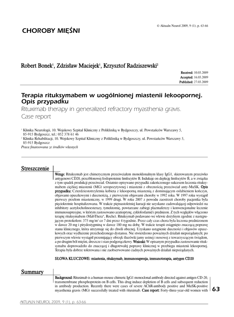 CHOROBY MIĘŚNI © Aktualn Neurol 2009, 9 (1), p. 63-66 Robert Bonek1, Zdzisław Maciejek1, Krzysztof Radziszewski2 Received: 10.03.2009 Accepted: 16.03.2009 Published: 27.03.2009 Terapia rituksymabem w uogólnionej miastenii lekoopornej. Opis przypadku Rituximab therapy in generalized refractory myasthenia gravis. Case report Klinika Neurologii, 10. Wojskowy Szpital Kliniczny z Polikliniką w Bydgoszczy, ul. Powstańców Warszawy 5, 85-915 Bydgoszcz, tel.: 052 378 61 46 2 Klinika Rehabilitacji, 10. Wojskowy Szpital Kliniczny z Polikliniką w Bydgoszczy, ul. Powstańców Warszawy 5, 85-915 Bydgoszcz Praca finansowana ze środków własnych 1 Streszczenie Wstęp: Rituksymab jest chimerycznym przeciwciałem monoklonalnym klasy IgG1, skierowanym przeciwko antygenowi CD20, przezbłonowej fosfoproteinie limfocytów B. Indukuje on deplecję limfocytów B, a w związku z tym spadek produkcji przeciwciał. Ostatnio opisywano przypadki zakończonego sukcesem leczenia rituksymabem ciężkiej miastenii (MG) seropozytywnej i miastenii z obecnością przeciwciał anty-MuSK. Opis przypadku: Czterdziestotrzyletnia kobieta z lekooporną miastenią z dominującym osłabieniem kończyn, objawami opuszkowymi i dusznością, z pierwszymi objawami choroby w 1992 roku. W 1997 roku wystąpił pierwszy przełom miasteniczny, w 1999 drugi. W roku 2007 z powodu zaostrzeń choroby pacjentka była pięciokrotnie hospitalizowana. W trakcie piętnastoletniej kuracji nie uzyskano zadowalającej odpowiedzi na inhibitory acetylocholinoesterazy, tymektomię, powtarzane zabiegi plazmaferezy i konwencjonalne leczenie immunosupresyjne, w którym zastosowano azatioprynę, cyklofosfamid i prednizon. Z tych względów włączono terapię rituksymabem (MabThera®, Roche). Rituksymab podawano we wlewie dożylnym zgodnie z następującym protokołem: 375 mg/m2 co 7 dni przez 4 tygodnie. Przez cały czas chora była leczona prednizonem w dawce 20 mg i pirydostygminą w dawce 180 mg na dobę. W trakcie terapii osiągnięto znaczącą poprawę stanu klinicznego, która utrzymuje się do chwili obecnej. Uzyskano ustąpienie duszności i objawów opuszkowych oraz wydłużenie przechodzonego dystansu. Nie stwierdzono poważnych działań niepożądanych; po pierwszym wlewie wystąpił przemijający obrzęk śluzówki jamy ustnej i nosowej z towarzyszącym świądem, a po drugim ból mięśni, dreszcze i stan podgorączkowy. Wnioski: W opisanym przypadku zastosowanie rituksymabu doprowadziło do znaczącej i długotrwałej poprawy klinicznej w przebiegu miastenii lekoopornej. Terapia była dobrze tolerowana i nie zaobserwowano żadnych poważnych działań niepożądanych. SŁOWA KlUCZOWe: miastenia, rituksymab, immunosupresja, immunoterapia, antygen CD20 Summary Background: Rituximab is a human-mouse chimeric IgG1 monoclonal antibody directed against antigen CD-20, transmembrane phosphoprotein on B cells. This drug induce depletion of B cells and subsequent reduction in antibody production. Recently there were cases of severe AChR-antibody positive and MuSK-positive myasthenia gravis (MG) successfully treated with rituximab. Case report: Forty-three-year-old women with AktuAln neuRol 2009, 9 (1), p. 63-66 63 CHoRoBY MIĘŚnI refractory MG with predominantly generalised weakness in extremities, bulbar symptoms and dyspnea, who presented for the first time in 1992. Thymectomy was perform in 1997. During 15 years of therapy patient had one crise in 1997 and one in 1999. In 2007, she had five hospital admission. She did not respond adequately to acetylcholinesterase inhibitors, thymectomy, repeat plasma exchange and conventional immunosuppressive therapy such as azathioprine, cyclophosphamide and prednisone. For this reason rituximab (MabThera®, Roche) therapy was added. Rituximab was administered at a dose of 375 mg/m2 intravenously according to a protocol every 7 days for 4 weeks. She received also prednisone at a dose of 20 mg and pyridostigmine 180 mg per day all the time. Within 4 weeks therapy she showed maintained clinical improvement. Dyspnea and bulbar symptoms were disappearanced and walking distances was longer. We did not observe serious adverse events, only after first infusion transient oedema of mucosa nasal and oral cavity with concurrent pruritus and after second infusion transient myalgia, chills and subfebrile body temperature were found. Conclusions: In this case use of rituximab leading to significant clinical improvement in refractory myasthenia gravis. The therapy was well tolerated and any serious adverse events were registered. Key WORDS: myasthenia gravis, rituximab, immunosuppression, immunotherapy, antigen CD-20 WSTęP R ituksymab jest chimerycznym przeciwciałem monoklonalym, będącym glikozylowaną immunoglobuliną zbudowaną z łańcuchów ciężkich IgG1 oraz z łańcuchów lekkich κ. Skierowany jest przeciwko antygenowi CD20, przezbłonowej fosfoproteinie o masie 33-37 kDa, występującej na niedojrzałych komórkach pre-B oraz dojrzałych limfocytach B. Rituksymab indukuje szybką deplecję limfocytów B w wyniku aktywacji układu dopełniacza oraz cytotoksyczności komórkowej zależnej od przeciwciał, a w związku z tym powoduje spadek produkcji przeciwciał(1,2). Rituksymab jest zarejestrowany w leczeniu grudkowych chłoniaków nieziarniczych III° i IV° zaawansowania oraz w reumatoidalnym zapaleniu stawów. Obecnie jest w trakcie badań klinicznych w szeregu schorzeń o etiologii autoimmunologicznej. W ostatnich latach opisywano przypadki zakończonego sukcesem leczenia rituksymabem ciężkiej miastenii (MG) seropozytywnej i miastenii z obecnością przeciwciał anty-MuSK(3-9). OPIS PRZyPADKU 64 Przedstawiamy przypadek 43-letniej kobiety (M.O., hist. chor. nr 23021/07) z uogólnioną lekooporną miastenią z dominującym osłabieniem kończyn, objawami opuszkowymi i dusznością. Pierwsze objawy choroby pod postacią ogólnego osłabienia oraz okresowo występujących trudności w połykaniu poka