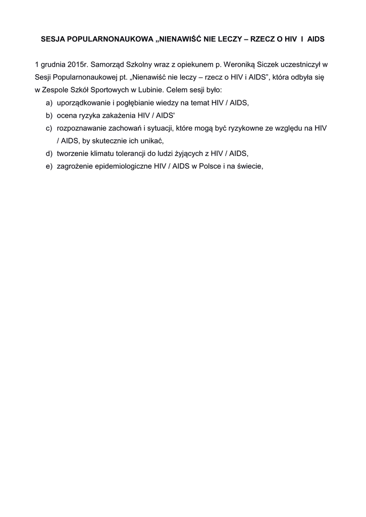SESJA POPULARNONAUKOWA „NIENAWIŚĆ NIE LECZY – RZECZ O HIV I AIDS 1 grudnia 2015r. Samorząd Szkolny wraz z opiekunem p. Weroniką Siczek uczestniczył w Sesji Popularnonaukowej pt. „Nienawiść nie leczy – rzecz o HIV i AIDS”, która odbyła się w Zespole Szkół Sportowych w Lubinie. Celem sesji było: a) uporządkowanie i pogłębianie wiedzy na temat HIV / AIDS, b) ocena ryzyka zakażenia HIV / AIDS' c) rozpoznawanie zachowań i sytuacji, które mogą być ryzykowne ze względu na HIV / AIDS, by skutecznie ich unikać, d) tworzenie klimatu tolerancji do ludzi żyjących z HIV / AIDS, e) zagrożenie epidemiologiczne HIV / AIDS w Polsce i na świecie,