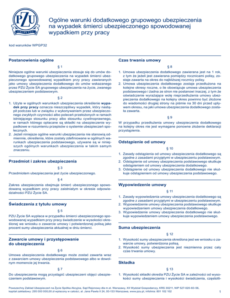 Ogólne warunki dodatkowego grupowego ubezpieczenia na wypadek śmierci ubezpieczonego spowodowanej wypadkiem przy pracy kod warunków WPGP32 Postanowienia ogólne Czas trwania umowy §1 §8 Niniejsze ogólne warunki ubezpieczenia stosuje się do umów dodatkowego grupowego ubezpieczenia na wypadek śmierci ubezpieczonego spowodowanej wypadkiem przy pracy zawieranych jako umowy ubezpieczenia dodatkowego do umów wskazanego przez PZU Życie SA grupowego ubezpieczenia na życie, zwanego ubezpieczeniem podstawowym. 1. Umowa ubezpieczenia dodatkowego zawierana jest na 1 rok, z tym że jeżeli jest zawierana pomiędzy rocznicami polisy, zostaje zawarta na okres do najbliższej rocznicy polisy. 2. Umowa ubezpieczenia dodatkowego zostaje przedłużona na kolejne okresy roczne, o ile obowiązuje umowa ubezpieczenia podstawowego i żadna ze stron nie postanowi inaczej, z tym że oświadczenie wyrażające wolę nieprzedłużenia umowy ubezpieczenia dodatkowego na kolejny okres powinno być złożone do wiadomości drugiej strony na piśmie na 30 dni przed upływem okresu, na jaki umowa ubezpieczenia dodatkowego została zawarta. §2 1. Użyte w ogólnych warunkach ubezpieczenia określenie wypadek przy pracy oznacza nieszczęśliwy wypadek, który nastąpił podczas lub w związku z wykonywaniem przez ubezpieczonego zwykłych czynności albo poleceń przełożonych w ramach istniejącego stosunku pracy albo stosunku cywilnoprawnego, w ramach którego opłacane są składki na ubezpieczenie wypadkowe w rozumieniu przepisów o systemie ubezpieczeń społecznych. 2. Jeżeli niniejsze ogólne warunki ubezpieczenia nie stanowią odmiennie, określenia, które zostały zdefiniowane w ogólnych warunkach ubezpieczenia podstawowego, używane są w niniejszych ogólnych warunkach ubezpieczenia w takim samym znaczeniu. Przedmiot i zakres ubezpieczenia §3 Przedmiotem ubezpieczenia jest życie ubezpieczonego. §9 W przypadku przedłużenia umowy ubezpieczenia dodatkowego na kolejny okres nie jest wymagane ponowne złożenie deklaracji przystąpienia. Odstąpienie od umowy § 10 1. Zasady odstąpienia od umowy ubezpieczenia dodatkowego są zgodne z zasadami przyjętymi w ubezpieczeniu podstawowym. 2. Odstąpienie od umowy ubezpieczenia podstawowego skutkuje odstąpieniem od umowy ubezpieczenia dodatkowego. 3. Odstąpienie od umowy ubezpieczenia dodatkowego nie skutkuje odstąpieniem od umowy ubezpieczenia podstawowego. §4 Zakres ubezpieczenia obejmuje śmierć ubezpieczonego spowodowaną wypadkiem przy pracy zaistniałym w okresie odpowiedzialności PZU Życie SA. Świadczenia z tytułu umowy §5 PZU Życie SA wypłaca w przypadku śmierci ubezpieczonego spowodowanej wypadkiem przy pracy świadczenie w wysokości określonej we wniosku o zawarcie umowy i potwierdzonej polisą jako procent sumy ubezpieczenia aktualnej w dniu śmierci. Wypowiedzenie umowy § 11 1. Zasady wypowiedzenia umowy ubezpieczenia dodatkowego są zgodne z zasadami przyjętymi w ubezpieczeniu podstawowym. 2. Wypowiedzenie umowy ubezpieczenia podstawowego skutkuje wypowiedzeniem umowy ubezpieczenia dodatkowego. 3. Wypowiedzenie umowy ubezpieczenia dodatkowego nie skutkuje wypowiedzeniem umowy ubezpieczenia podstawowego. Suma ubezpieczenia § 12 Zawarcie umowy i przystępowanie do ubezpieczenia §6 Umowa ubezpieczenia dodatkowego może zostać zawarta wraz z zawarciem umowy ubezpieczenia podstawowego albo w dowolnym momencie jej trwania. 1. Wysokość sumy ubezpieczenia określona jest we wniosku o zawarcie umowy, potwierdzona polisą. 2. Wysokość sumy ubezpieczenia jest niezmienna przez cały czas trwania umowy. Składka §7 § 13 Do ubezpieczenia mogą przystąpić ubezpieczeni objęci ubezpieczeniem podstawowym. 1. Wysokość składki określa PZU Życie SA w zależności od wysokości sumy ubezpieczenia i wysokości świadczenia, częstotli- Powszechny Zakład Ubezpieczeń na Życie Spółka Akcyjna, Sąd Rejonowy dla m.st. Warszawy, XII Wydział Gospodarczy, KRS 30211, NIP 527-020-60-56, kapitał zakładowy: 295 000 000,00 zł wpłacony w całości, al. Jana Pawła II 24, 00-133 Warszawa, www.pzu.pl, infolinia: 801 102 102 1 wości przekazywania składek oraz liczby, struktury wiekowej, płciowej i zawodowej osób przystępujących do ubezpieczenia. 2. Wysokość składki obowiązująca w umowie ubezpieczenia dodatkowego określona jest we wniosku o zawarcie umowy i potwierdzona polisą. 3. Składka przekazywana jest wraz ze składką za ubezpieczenie podstawowe. Początek i koniec odpowiedzialności PZU Życie SA § 14 Odpowiedzialność PZU Życie SA w stosunku do ubezpieczonego rozpoczyna się zgodnie z zasadami przyjętymi w ubezpieczeniu podstawowym. 5) w wyniku samookaleczenia, usiłowania popełnienia albo popełnienia przez ubezpieczonego samobójstwa, 6) gdy ubezpieczony wykonywał pracę bez kwalifikacji lub uprawnień wymaganych przez obowiązujące przepisy prawa. Uprawnieni do świadczenia § 17 1. Prawo do świadczenia z tytułu śmierci ubezpieczonego spowodowanej wypadkiem przy pracy przysługuje uposażonemu. 2. W stosunku do uposażonego, w tym w zakresie trybu i sposobu jego wskazywania, zmiany i odwoływania, stosuje się zasady przyjęte w ubezpieczeniu podstawowym. § 15 Odpowiedzialność PZU Życie SA w stosunku do ubezpieczonego kończy się w dniu zaistnienia jednej z okoliczności: 1) zakończenia odpowiedzialności PZU Życie SA w ubezpieczeniu podstawowym, 2) otrzymania przez PZU Życie SA oświadczenia o odstąpieniu przez ubezpieczającego od umowy ubezpieczenia dodatkowego, 3) upływu czasu trwania umowy ubezpieczenia dodatkowego w przypadku jej nieprzedłużenia, 4) upływu okresu, za jaki przekazano składkę – w przypadku rezygnacji ubezpieczonego z ubezpieczenia dodatkowego, 5) upływu okresu wypowiedzenia umowy ubezpieczenia dodatkowego, 6) rozwiązania umowy ubezpieczenia dodatkowego. Wyłączenia odpowiedzialności PZU Życie SA § 16 PZU Życie SA nie ponosi odpowiedzialności za skutki wyp