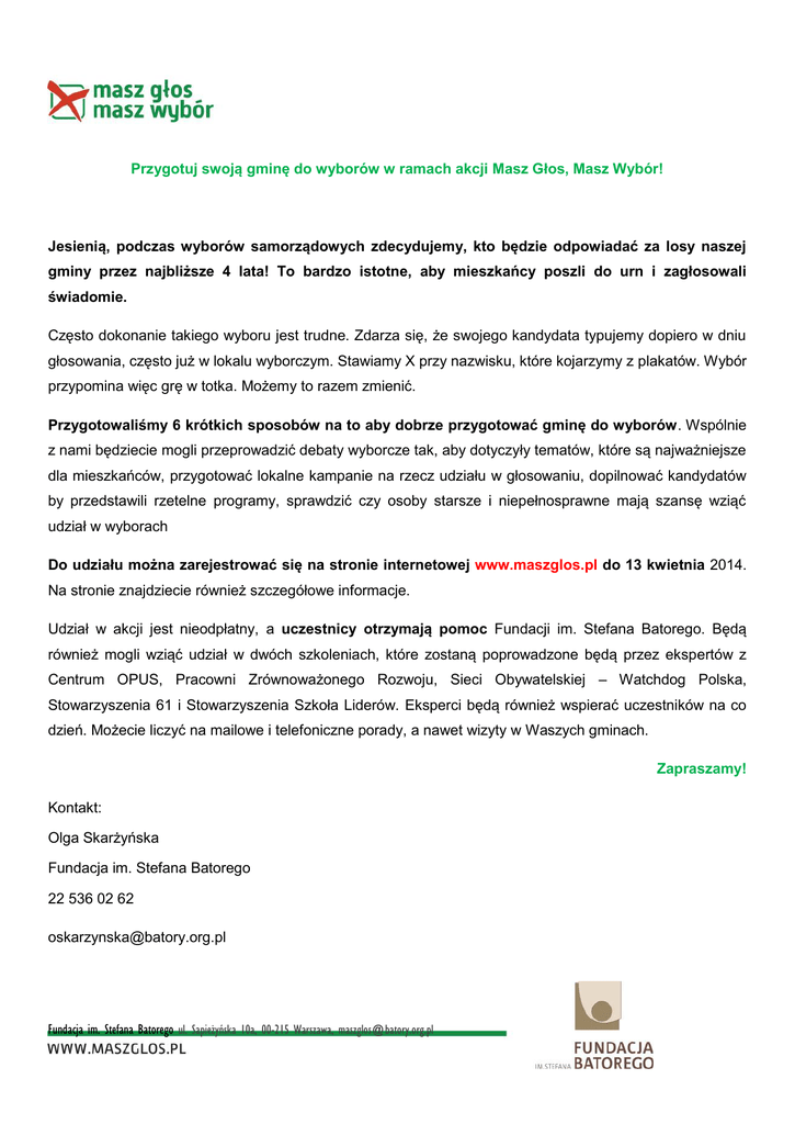 Przygotuj swoją gminę do wyborów w ramach akcji Masz Głos, Masz Wybór! Jesienią, podczas wyborów samorządowych zdecydujemy, kto będzie odpowiadać za losy naszej gminy przez najbliższe 4 lata! To bardzo istotne, aby mieszkańcy poszli do urn i zagłosowali świadomie. Często dokonanie takiego wyboru jest trudne. Zdarza się, że swojego kandydata typujemy dopiero w dniu głosowania, często już w lokalu wyborczym. Stawiamy X przy nazwisku, które kojarzymy z plakatów. Wybór przypomina więc grę w totka. Możemy to razem zmienić. Przygotowaliśmy 6 krótkich sposobów na to aby dobrze przygotować gminę do wyborów. Wspólnie z nami będziecie mogli przeprowadzić debaty wyborcze tak, aby dotyczyły tematów, które są najważniejsze dla mieszkańców, przygotować lokalne kampanie na rzecz udziału w głosowaniu, dopilnować kandydatów by przedstawili rzetelne programy, sprawdzić czy osoby starsze i niepełnosprawne mają szansę wziąć udział w wyborach Do udziału można zarejestrować się na stronie internetowej www.maszglos.pl do 13 kwietnia 2014. Na stronie znajdziecie również szczegółowe informacje. Udział w akcji jest nieodpłatny, a uczestnicy otrzymają pomoc Fundacji im. Stefana Batorego. Będą również mogli wziąć udział w dwóch szkoleniach, które zostaną poprowadzone będą przez ekspertów z Centrum OPUS, Pracowni Zrównoważonego Rozwoju, Sieci Obywatelskiej – Watchdog Polska, Stowarzyszenia 61 i Stowarzyszenia Szkoła Liderów. Eksperci będą również wspierać uczestników na co dzień. Możecie liczyć na mailowe i telefoniczne porady, a nawet wizyty w Waszych gminach. Zapraszamy! Kontakt: Olga Skarżyńska Fundacja im. Stefana Batorego 22 536 02 62 [email protected] Fundacja im. Stefana Batorego ul. Sapieżyńska 10a, 00-215 Warszawa, [email protected]