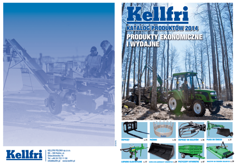 Katalog produktów 2014 201401PL Produkty EKONOMICZNE I WYDAJNE KELLFRI POLSKA sp.z.o.o. 99 – 300 Kutno, ul. Sklęczkowska 16 Tel. +48 24 722 11 50 [email protected] www.kellfri.pl Osprzęt s. 31 Łuparki elektryczne s. 17 Paśniki s. 52 Szufle do ładowaczy czołowych Osprzęt do balotów s. 36 s. 29 Przyczepy wywrotki s. 47 Pługi do śniegu s. 21 Maszyny do terenów zielonych s. 39 Ogólne warunki sprzedaży WITAMY W KELLFRI! Ideą działalności firmy Kellfri jest konstruowanie i dostarczanie efektywnych, a przy tym atrakcyjnych cenowo maszyn i urządzeń dla leśnictwa, rolnictwa, budownictwa i ogrodnictwa. NASZE GŁÓWNE CECHY TO: Szeroki zakres oferty: Oferowany przez nas kompleksowy wachlarz produktów zawiera rozwiązania na każdy sezon i każdą porę roku. Posiadamy także rozbudowaną sieć klientów i kontrahentów, rozciągającą się daleko poza granice Szwecji. Doświadczenie: Firma Kellfri istnieje od 50 lat i jest uznanym na rynku znakiem towarowym. Przez te lata pracy zbudowaliśmy solidną bazę wiedzy i kompetencji opartą na długim doświadczeniu. Atrakcyjne ceny: Jakość i funkcjonalność w dobrej cenie! Zawsze dążymy do tego, by utrzymać jak najbardziej korzystne ceny na rynku, nie rezygnując przy tym z wysokiej jakości. Dzięki wieloletniemu doświadczeniu nauczyliśmy się słuchać bieżących potrzeb klientów i nieustannie pracujemy nad wdrażaniem nowych, poszukiwanych na rynku rozwiązań i produktów. Rynek: Efektem wieloletniej historii firmy Kellfri jest duży rynek odbiorców, obecnie obejmujący różne kraje europejskie. Staliśmy się wiodącym dostawcą wielu grup produktów dla klientów w Szwecji, Finlandii, Danii, Norwegii i Niemczech. W Danii Finlandii i Polsce posiadamy spółki – córki KELLFRI APS , OY KELLFRI AB i KELLFRI PL Sp. z o.o. Nasi klienci wywodzą się z takich gałęzi gospodarki jak rolnictwo, leśnictwo, budownictwo i ogrodnictwo. Osoby prywatne potrzebujące narzędzi do użytku na działce, właściciele mniejszych i większych gospodarstw rolnych i lasów, hodowcy zwierząt, gminy, stowarzyszenia – każdy znajdzie u nas wszystko, czego potrzebuje. SK KO A N D I N AV I S K NSTRU KTION SKANDYNAWSKA KONSTRUKCJA Produkty firmy Kellfri zostały zaprojektowane i zrealizowane na miarę skandynawską przez doświadczonych i kompetentnych konstruktorów i inżynierów ze Skandynawii. Znakiem: „skandynawska konstrukcja” gwarantujemy, że wszystkie oferowane produkty zaprojektowano zgodnie ze skandynawskim ‘know-how”Dla naszych klientów oznacza to zaufanie i bezpieczeństwo! Produkty są oznakowane symbolami CE i wykonujemy je z zachowaniem szwedzkich wymogów wobec dostawców krajowych i zagranicznych. Niskie koszty pośrednie sprawiają, że możemy oferować klientom funkcjonalne, pełnowartościowe produkty wysokiej jakości w bardzo korzystnej cenie! ZAPRASZAMY DO WSPÓŁPRACY! Naszym klientom oferujemy również dogodne warunki sprzedaży ratalnej w oparciu o współpracę ze znanymi instytucjami finansowymi. Firma Kellfri wprowadza serię ekonomicznych urządzeń, która będzie alternatywą dla naszej standardowej oferty. Szukaj tego symbolu, FINANSOWANIE KELLFRI BASIC jeśli chcesz kupić prostsze produkty za niższą cenę! BIURO OBŁUGI KLIENTA / ZAMÓWIENIA Tel: 24-722-11-50, 881-913-388 99-300 Kutno, ul. Sklęczkowska 16 • Zamawianie produktów i katalogu • Informacje o realizacji zamówienia • Informacje o produktach • Sprawy gwarancyjne • Części zamienne • Zwroty © Copyright Kellfri AB Zakaz kopiowania grafiki i tekstu oraz wykorzystywania ich do celów handlowych. Zastrzegamy możliwość wystąpienia błędów w druku. Wstęp Kellfri Sp. z o.o. , 99-300 Kutno ul.Sklęczkowska 16, (dalej nazywana KELLFRI POLSKA) od ponad 50 lat dostarcza maszyny i komponenty do lasów i rolnictwa w Szwecji, Norwegii, Danii, Finlandii, Polsce i Niemczech. Na tej podstawie rozwija się efektywne produkty, których znakiem rozpoznawczym jest jakość, funkcjonalność i duże możliwości. Kellfri jest dobrze rozpoznawalną marką, której produkty są wiodące w wielu segmentach na rynku. Produkty Kellfri posiadają znaki CE i są produkowane według szwedzkich wymogów przez szwedzkie albo zagraniczne fabryki przy możliwie najniższych kosztach. Dzięki temu profilowi możemy Państwu, jako KUPUJĄCEMU zaproponować efektywne i pełnowartościowe produkty w atrakcyjnej cenie. Składanie zamówień Towary można zamówić przez Internet na naszej stronie domowej www.kellfri.pl. Jeżeli chcą być Państwo obsłużeni indywidualnie, zapraszamy do składania zamówień telefonicznych w naszym centrum obsługi klienta/centrum zamówień pod numerem: +48 24 722-11-50 i 48-881-913-388, godziny otwarcia: 8.00 - 16.00/. Po złożeniu zamówienia wysyłamy potwierdzenie zamówienia. Potwierdzenie jest informacją o kompletacji i wartości zamówienia. Warunki płatności Wszystkie ceny na stronie i w katalogach są podane w PLN bez podatku VAT. Koszty przygotowania wysyłki i w niektórych przypadkach opakowania wysyłki doliczane są do wartości zamówienia. Dostawa bez dodatkowych opłat realizowana jest przy zamówieniu powyżej 3000 PLN netto . Przy zamówieniach, poniżej 3000 PLN netto doliczane są koszty dostawy Płatność przez Kupującego dokonywana jest na podstawie faktury sprzedaży w terminie 7 dni od momentu wystawienia i przesłania faktury Płatność Towar może być wysłany do KUPUJĄCEGO wyłącznie po uiszczeniu 100% zapłaty na podstawie faktury sprzedaży. Płatność może być również dokonana przy odbiorze zamówionego towaru. Wszelkie inne terminy płatności muszą być potwierdzone na podstawie pisemnej umowy pomiędzy KELLFRI POLSKA a KUPUJĄCYM. W przypadku braku zapłaty w określonym w umowie czasie będą naliczane odsetki ustawowe. Finansowanie W przypadku kiedy KUPUJĄCY korzysta z różnych sposobów finansowania zakupu produktów Kellfri, towar jest wysyłany po wp