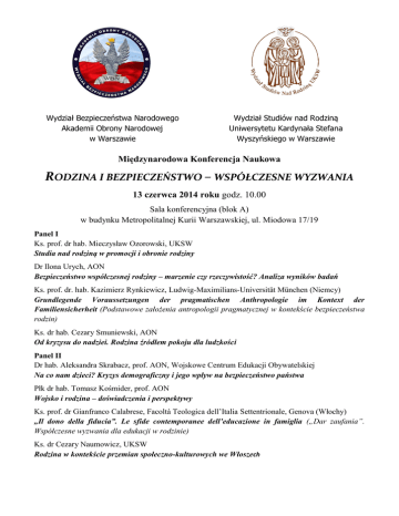 Wydział Bezpieczeństwa Narodowego Akademii Obrony Narodowej w Warszawie Wydział Studiów nad Rodziną Uniwersytetu Kardynała Stefana Wyszyńskiego w Warszawie Międzynarodowa Konferencja Naukowa RODZINA I BEZPIECZEŃSTWO – WSPÓŁCZESNE WYZWANIA 13 czerwca 2014 roku godz. 10.00 Sala konferencyjna (blok A) w budynku Metropolitalnej Kurii Warszawskiej, ul. Miodowa 17/19 Panel I Ks. prof. dr hab. Mieczysław Ozorowski, UKSW Studia nad rodziną w promocji i obronie rodziny Dr Ilona Urych, AON Bezpieczeństwo współczesnej rodziny – marzenie czy rzeczywistość? Analiza wyników badań Ks. prof. dr. hab. Kazimierz Rynkiewicz, Ludwig-Maximilians-Universität München (Niemcy) Grundlegende Voraussetzungen der pragmatischen Anthropologie im Kontext der Familiensicherheit (Podstawowe założenia antropologii pragmatycznej w kontekście bezpieczeństwa rodzin) Ks. dr hab. Cezary Smuniewski, AON Od kryzysu do nadziei. Rodzina źródłem pokoju dla ludzkości Panel II Dr hab. Aleksandra Skrabacz, prof. AON, Wojskowe Centrum Edukacji Obywatelskiej Na co nam dzieci? Kryzys demograficzny i jego wpływ na bezpieczeństwo państwa Płk dr hab. Tomasz Kośmider, prof. AON Wojsko i rodzina – doświadczenia i perspektywy Ks. prof. dr Gianfranco Calabrese, Facoltà Teologica dell’Italia Settentrionale, Genova (Włochy) „Il dono della fiducia”. Le sfide contemporanee dell’educazione in famiglia („Dar zaufania”. Współczesne wyzwania dla edukacji w rodzinie) Ks. dr Cezary Naumowicz, UKSW Rodzina w kontekście przemian społeczno-kulturowych we Włoszech