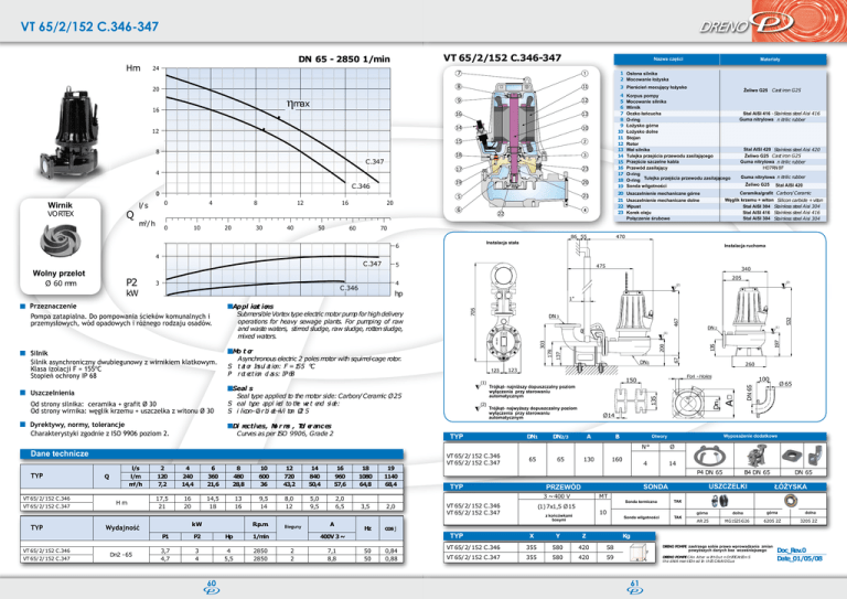 VT 65/2/152 C.346-347 ELETTROPOM PE SOM M ERGIBILI SUBM ERSIBLE ELECTROPUM PS VT 65/2/152 C.346-347 DN 65 - 2850 1/min 24 Nazwa części 7 20 max 12 1 Osłona silnika 2 Mocowanie łożyska 8 11 9 12 16 13 14 10 3 Pierścień mocujący łożysko 4 5 6 7 8 9 10 11 12 13 14 15 16 17 18 19 15 8 18 C.347 4 C.346 16 6 10 20 30 40 50 60 70 86 55 6 4 Silnik Silnik asynchroniczny dwubiegunowy z wirnikiem klatkowym. Klasa izolacji F = 155ºC Stopień ochrony IP 68 Uszczelnienia Od strony silnika: ceramika + grafit Ø 30 Od strony wirnika: węglik krzemu + uszczelka z witonu Ø 30 Dyrektywy, normy, tolerancje Charakterystyki zgodnie z ISO 9906 poziom 2. TYP VT 65/ 2/ 152 C.346 VT 65/ 2/ 152 C.347 TYP VT 65/ 2/ 152 C.346 VT 65/ 2/ 152 C.347 Q Hm Di rectives, N orm s , Tol er ances Curves as per ISO 9906, Grade 2 6 360 21,6 8 480 28,8 10 600 36 12 720 43,2 14 840 50,4 16 960 57,6 18 1080 64,8 19 1140 68,4 17,5 21 16 20 14,5 18 13 16 9,5 14 8,0 12 5,0 9,5 2,0 6,5 3,5 2,0 Dn2 -65 R.p.m. kW P1 P2 Hp 1/min 3,7 4,7 3 4 4 5,5 2850 2850 60 Bieguny A 7,1 8,8 (1) (2) Fori -Holes 150 Trójkąt- najniższy dopuszczalny poziom wyłączenia przy sterowaniu automatycznym Trójkąt- najwyższy dopuszczalny poziom wyłączenia przy sterowaniu automatycznym VT 65/ 2/ 152 C.346 VT 65/ 2/ 152 C.347 DN1 65 DN2/3 A 65 B Ø 65 130 Wyposażenie dodatkowe Otwory 160 N° Ø 4 14 P4 DN 65 MT (1) 7x1,5 Ø15 10 z końcówkami bosymi B4 DN 65 USZCZELKI SONDA PRZEWÓD VT 65/ 2/ 152 C.346 VT 65/ 2/ 152 C.347 100 Ø14 Kabel TYP TYP 50 50 260 Sonda termiczna TAK Sonda wilgotności TAK DN 65 ŁÓŻYSKA górna dolna górna AR 25 MG1S25-G26 6205 2Z dolna 3205 2Z cos j 400V 3 ~ 2 2 DN1 3 ~ 400 V Hz (1) 123 TYP 4 240 14,4 DN 2 (1) Seal s Seal type applied to the motor side: Carbon/ Ceramic Ø25 S eal type appl ied to the w e t end si de: S i licon-Ca r bi de+Vi ton Ø2 5 2 120 7,2 Wydajność DN 3 Mo t or Asynchronous electric 2 poles motor with squirrel-cage rotor. S t at or Insul at ion: F = 155 °C P rot ection cl ass: IP 68 Dane technicze l/s l/m m3/h 1" Appl icat ions Submersible Vortex type electric motor pump for high delivery operations for heavy sewage plants. For pumping of raw and waste waters, stirred sludge, raw sludge, rotten sludge, mixed waters. 467 Pompa zatapialna. Do pompowania ścieków komunalnych i przemysłowych, wód opadowych i różnego rodzaju osadów. hp 303 Przeznaczenie (2) (2) 200 C.346 kW 340 205 135 3 475 178 P2 Ø 60 mm 5 705 Wolny przelot C.347 Instalacja ruchoma 137 4 470 Instalacja stała 532 0 21 Uszczelnienie mechaniczne dolne 22 Wpust 23 Korek oleju Połączenie śrubowe 22 Stal AISI 420 197 m /h 3 Żeliwo G25 Ceramika/grafit Carbon/ Ceramic Węglik krzemu + witon Silicon carbide + viton Stal AISI 304 Stainless steel Aisi 304 Stal AISI 416 Stainless steel Aisi 416 Stal AISI 304 Stainless steel Aisi 304 20 Uszczelnienie mechaniczne górne 21 5 20 Guma nitrylowa n itrilic rubber Sonda wilgotności DN 65 12 8 20 Stal AISI 420 Stainless steel Aisi 420 Żeliwo G25 Cast iron G25 Guma nitrylowa n itrilic rubber H07RN8F A Q VORTEX l/ s 4 19 Stal AISI 416 -Stainless steel Aisi 416 Guma nitrylowa n itrilic rubber 135 Wirnik 0 23 Dn2 0 17 Żeliwo G25 Cast iron G25 Korpus pompy Mocowanie silnika Wirnik Oczko łańcucha O-ring Łożysko górne Łożysko dolne Stojan Rotor Wał silnika Tulejka przejścia przewodu zasilającego Przejście szczelne kabla Przewód zasilający O-ring O-ring Tulejka przejścia przewodu zasilającego B 16 Materiały 67 Hm 0,84 0,88 X Y Z Kg VT 65/ 2/ 152 C.346 355 580 420 58 DRENO POMPE zastrzega sobie prawo wprowadzania zmian VT 65/ 2/ 152 C.347 355 580 420 59 DRENO POMPE CAn Alter w IthOut n OtIFICAtIOn S the dAtA men tIOn ed In thIS CAtAl OGue powyższych danych bez wcześniejszego 61 Doc_Rev.0 Date_01/05/08